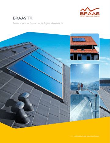 BRAAS TK Nowoczesna forma w jednym elemencie Part of Braas Monier Building Group Braas TK Wysokowydajne kolektory Braas Solar stanowią trzon naszych efektywnych Systemów Solarnych. Ich wysoka moc grzewcza zapewnia wydajne ogrzewanie pomieszczeń oraz wody, zawsze wtedy gdy jest ono potrzebne. Kolektor słoneczny TK, dzięki optymalnej konstrukcji i najwyższej jakości materiałów (z których jest zbudowany) doskonale spełni swoją funkcję zarówno w budynkach małych, jedno, dwurodzinnych jak też w większych instalacjach solarnych. Unikalna konstrukcja daje możliwość pełnej integracji z dachem, co zapewnia długą żywotność i bezpieczeństwo użytkowania. 5 lat Gwarancja Ekologia Pojemność nośnika ciepła l Masa kg Pokrycie solarne Rama kolektora Absorber Sprawność % Minimalna roczna wydajność kolektora kWh/m2 Modernste Nanotechnologie 100% mo liwo skorzystania z dotacji Braas Dach-Steine sind Modernstedurchschnittlich 25 % fester als DINplus es Nanotechnologie vorschreibt 25% 60% + Energiekosten sparen* Modernste Nanotechnologie 5 lat Braas Qualitätssiegel TK4 TK6 2039 x 2026 2039 x 3019 2380 x 2576 2380 x 3477 Darmowa energia 10 lat Gwarancja Gwarancja TK8 TK10 2039 x 4012 2039 x 5005 100% Ekologia 2380 x 4526 100% mo liwo skorzy- z dotacji 2380stania x 5577 4,13 6,16 8,18 10,21 3,68 5,52 7,36 9,20 Modernste Modernste Nanotechnologie Nanotechnologie 2 szt (zasilanie, powrót) rury przyłączeniowe, elastyczne, Besonders Szczególnie izolowane ze wysoka stali nierdzewnej, 18 mm leistungsstark sprawność 1,3 1,6 2,1 2,6 +25% 60% 110 160 220 290 Modernste Energiekosten Optimale * Nanotechnologie Szkło solarne sparen Montagelösungen für alle Dacharten Łatwy monta Drewno Z powłoką o wysokiej selektywności, meander Braas 82,4 Qualitätssiegel Extrem Extrem Extrem >525 witterungsbeständig witterungsbeständig witterungsbeständig Darmowa energia Braas Dach-Steine sind durchschnittlich 25 % fester als DINplus es vorschreibt Absolut sicher Monier Braas Sp. z o. o. 45-449 Opole, ul. Wschodnia 26 infolinia: 801 900 555, dla tel. kom.: 22 481 39 86 e-mail: [email protected] www.monier.pl www.braas.pl Wyprodukowa w Niemczech High-TechMaterialien Extrem niedriger Kompletny Besonders system leistungsstark High-TechSzczególnie Materialien wysoka sprawność Niewielkie Darmowa energia Optimale Montagelösungen 08.2014 Przyłącza Wyprodukowano w Niemczech Gwarancja 100% Cechy systemu: • Kolektor dostarczany na budowę w jednym elemencie (niezależnie od tego, czy to podwójny, potrójny czy większy), co zapewnia bardzo szybki montaż • Najwyższe parametry sprawności >82,4% • Zintegrowane z połacią dachową • Atrakcyjny wygląd nadaje nowoczesności połaci dachowej • Szczególnie odporny na różne warunki atmosferyczne (deszcz, grad, wiatr) • Możliwość łączenia nawet kilku kolektorów w jednej instalacji DANE TECHNICZNE: Typ Wymiary wysokość x szerokość (bez obróbek) Wymiary wysokość x szerokość (z obróbkami, bez fartucha) mm Powierzchnia brutto m2 Powierzchnia absorbera m2 10 lat