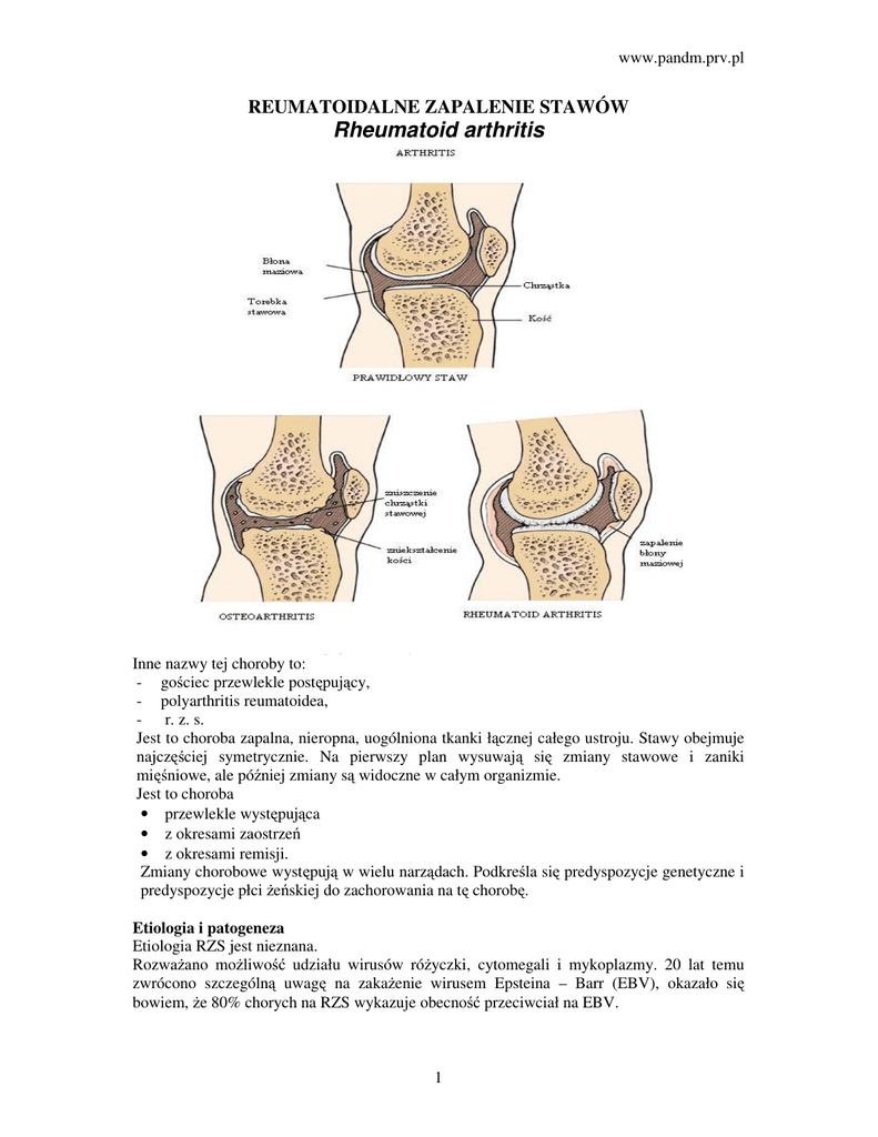 www.pandm.prv.pl REUMATOIDALNE ZAPALENIE STAWÓW Rheumatoid arthritis Inne nazwy tej choroby to: - gościec przewlekle postępujący, - polyarthritis reumatoidea, - r. z. s. Jest to choroba zapalna, nieropna, uogólniona tkanki łącznej całego ustroju. Stawy obejmuje najczęściej symetrycznie. Na pierwszy plan wysuwają się zmiany stawowe i zaniki mięśniowe, ale później zmiany są widoczne w całym organizmie. Jest to choroba • przewlekle występująca • z okresami zaostrzeń • z okresami remisji. Zmiany chorobowe występują w wielu narządach. Podkreśla się predyspozycje genetyczne i predyspozycje płci żeńskiej do zachorowania na tę chorobę. Etiologia i patogeneza Etiologia RZS jest nieznana. Rozważano możliwość udziału wirusów różyczki, cytomegali i mykoplazmy. 20 lat temu zwrócono szczególną uwagę na zakażenie wirusem Epsteina – Barr (EBV), okazało się bowiem, że 80% chorych na RZS wykazuje obecność przeciwciał na EBV. 1 www.pandm.prv.pl Inna hipoteza dotyczy zakażenia mykoplazmą. Mykoplazmy mają na powierzchni białka szoku termicznego. W RZS w surowicy obecne są przeciwciała przeciwko tym białkom. Poza tym w płynie stawowym u chorych znajdują się limfocyty gamma – delta, które proliferują pod wpływem antygenów mykoplazmy. Głównym procesem w patogenezie zmian zapalnych w RZS jest autoimmunizacja, czyli wytwarzanie przeciwciał przeciw IgG określanych jako czynnik reumatoidalny. Do innych czynników genetycznych zalicza się obecność antygenów HLADR1 i DR4 u 80% chorych oraz zmiany struktury receptorów limfocytów T. Opisane czynniki genetyczne przyczyniają się do tzw. agregacji rodzinnej choroby. U 20% chorych dochodzi do RZS wśród krewnych I stopnia, a u bliźniąt jednojajowych choroba występuje w ok. 27%. Patomorfologia Najwcześniejszą zmianą patologiczną jest - zapalenie błony maziowej stawu (wysięk, niepohamowany rozrost błony maziowej). Proces niszczenia stawu rozpoczyna się, gdy od brzeżnych części chrząstki zaczyna narastać na jej powierzchnię zapalna tkanka ziarninująca, która ma zdolność niszczenia tkanek stawowych i okołostawowych. Ta ziarnina reumatoidalna wnika stopniowo do stawu niszcząc chrząstkę i kość. Z czasem przekształca się ona w zbitą tkankę łączną zwana łuszczką. Zawiera ona liczne fibroblasty i pączkujące naczynia krwionośne. Stopniowo dochodzi do coraz większego zniszczenia powierzchni stawowych, uszkodzenia więzadeł i zniekształceń stawów. Równoczesne procesy naprawcze prowadzą do powstania zrostów włóknistych, potem kostnych, co powoduje usztywnienie stawów. W przystawowych częściach kości dosyć wcześnie pojawia się osteoporoza. Torebka stawowa w początkowym okresie RZS jest obrzękła, rozciągnięta przez wysięk w stawie, potem grubieje, włóknieje i obkurcza się. Zmiany anatomopatologiczne w stawach: 1. 2. 3. 4. zapalenie błony maziowej stawów ( przekrwienie, obrzęk, wysięk , rozrost); powstanie ziarniny zapalnej; ziarnina zamienia się w łuszczkę stawową; zrosty między łuszczką przeciwnych stron stawu i usztywnienie stawu; Zmiany anatomopatologiczne pozastawowe: 1. zaniki mięśni; 2. zapalenie pochewek ścięgien; 3. zapalenie ścięgien; 4. zmiany w narządach wewnętrznych; 5. guzki reumatoidalne Guzek reumatoidalny jest typową dla RZS zmianą morfologiczną. Guzki reumatoidalne powstają najczęściej w tkance podskórnej, w miejscach narażonych na ucisk oraz w narządach wewnętrznych. 2 www.pandm.prv.pl Obraz kliniczny i przebieg Początek choroby może być ostry, jak i powolny. Pojawiają się stany : - podgorączkowe, - pobolewania stawów i mięśni, - parestezje w kończynach, - utrata łaknienia - spadek masy ciała. Są bóle i obrzęki najczęściej małych stawów rąk i stóp. Zwykle są zaatakowane w sposób symetryczny (do 3 m–cy objawy pojawiają się w stawie symetrycznym). Wyróżniamy 4 okresy choroby według Steinbrockera: 1. wczesny: ból, obrzęk, pogrubienie zarysu stawów, sztywność poranna, w RTG nie ma typowych zmian, może być widoczna lekka osteoporoza; 2. zmiany umiarkowane: są to w/w objawy plus zmiany okołostawowe: zaniki mięśniowe, głownie mięśni międzykostnych, glistowatych, czworogłowych uda, ruchomość ograniczona, w RTG wyraźna osteoporaoza, mogą być pierwsze objawy uszkodzenia chrząstki; 3. zmiany zaawansowane: jest to okres najbardziej widoczny, są trwałe uszkodzenia, w/w objawy bardziej nasilone, zmiany w narządach wewnętrznych, dochodzi do podwichnięć w stawach, takich stawów nie da się już wyćwiczyć, w RTG wyraźna osteoporoza, uszkodzenia chrząstki i kości; 4. schyłkowa: w/w objawy plus zrosty włókniste i usztywnienie stawów. Okres choroby dobiera się według najbardziej zajętego stawu. Skóra jest : - chłodna, - wilgotna - ścieńczała co najwyraźniej zaznacza się w obrębie palców rąk. Zapalenie ścian naczyń prowadzi do sinicy palców, rumienia dłoniowego i parestezji. Częstym objawem RZS jest wysiękowe zapalenie opłucnej. Tu także powstają guzki reumatoidalne, które ulegają martwicy z wytworzeniem jam. W układzie nerwowym dochodzi do objawów związanych z uciskiem ziarniny reumatoidalnej na nerwy obwodowe do ucisków na korzenie nerwowe i parestezji. Objawem ze strony układu krwiotwórczego to najczęściej niedokrwistość normobarwliwa lub niedobarwliwa. Węzły chłonne powiększone, także powiększona śledziona z równoczesnym spadkiem liczby krwinek białych. Objawy ze strony węzłów chłonnych i śledziony w RZS nazywamy zespołem Felty’ego. 3 www.pandm.prv.pl Zniekształcenia Stawy rąk Typowy początek RZS objawia się bólami i symetrycznymi obrzękami stawów śródręczno paliczkowych i międzypaliczkowych bliższych, gł. II i III palca. Potem proces zapalny obejmuje pozostałe stawy śródręczno – paliczkowe i międzypaliczkowe bliższe. Stawy te są bolesne samoistnie i przy ruchach, ich ob