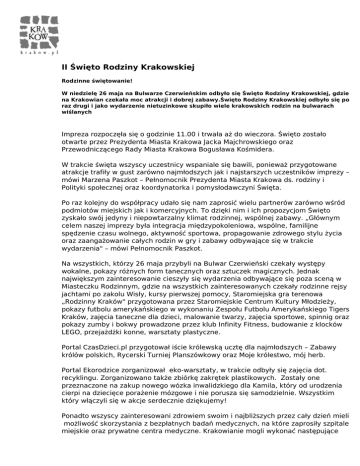 II Święto Rodziny Krakowskiej Rodzinne świętowanie! W niedzielę 26 maja na Bulwarze Czerwieńskim odbyło się Święto Rodziny Krakowskiej, gdzie na Krakowian czekała moc atrakcji i dobrej zabawy.Święto Rodziny Krakowskiej odbyło się po raz drugi i jako wydarzenie nietuzinkowe skupiło wiele krakowskich rodzin na bulwarach wiślanych Impreza rozpoczęła się o godzinie 11.00 i trwała aż do wieczora. Święto zostało otwarte przez Prezydenta Miasta Krakowa Jacka Majchrowskiego oraz Przewodniczącego Rady Miasta Krakowa Bogusława Kośmidera. W trakcie święta wszyscy uczestnicy wspaniale się bawili, ponieważ przygotowane atrakcje trafiły w gust zarówno najmłodszych jak i najstarszych uczestników imprezy – mówi Marzena Paszkot – Pełnomocnik Prezydenta Miasta Krakowa ds. rodziny i Polityki społecznej oraz koordynatorka i pomysłodawczyni Święta. Po raz kolejny do współpracy udało się nam zaprosić wielu partnerów zarówno wśród podmiotów miejskich jak i komercyjnych. To dzięki nim i ich propozycjom Święto zyskało swój jedyny i niepowtarzalny klimat rodzinnej, wspólnej zabawy. „Głównym celem naszej imprezy była integracja międzypokoleniowa, wspólne, familijne spędzenie czasu wolnego, aktywność sportowa, propagowanie zdrowego stylu życia oraz zaangażowanie całych rodzin w gry i zabawy odbywające się w trakcie wydarzenia" – mówi Pełnomocnik Paszkot. Na wszystkich, którzy 26 maja przybyli na Bulwar Czerwieński czekały występy wokalne, pokazy różnych form tanecznych oraz sztuczek magicznych. Jednak największym zainteresowanie cieszyły się wydarzenia odbywające się poza sceną w Miasteczku Rodzinnym, gdzie na wszystkich zainteresowanych czekały rodzinne rejsy jachtami po zakolu Wisły, kursy pierwszej pomocy, Staromiejska gra terenowa „Rodzinny Kraków" przygotowana przez Staromiejskie Centrum Kultury Młodzieży, pokazy futbolu amerykańskiego w wykonaniu Zespołu Futbolu Amerykańskiego Tigers Kraków, zajęcia taneczne dla dzieci, malowanie twarzy, zajęcia sportowe, spinnig oraz pokazy zumby i bokwy prowadzone przez klub Infinity Fitness, budowanie z klocków LEGO, przejażdżki konne, warsztaty plastyczne. Portal CzasDzieci.pl przygotował iście królewską ucztę dla najmłodszych – Zabawy królów polskich, Rycerski Turniej Planszówkowy oraz Moje królestwo, mój herb. Portal Ekorodzice zorganizował eko-warsztaty, w trakcie odbyły się zajęcia dot. recyklingu. Zorganizowano także zbiórkę zakrętek plastikowych. Zostały one przeznaczone na zakup nowego wózka inwalidzkiego dla Kamila, który od urodzenia cierpi na dziecięce porażenie mózgowe i nie porusza się samodzielnie. Wszystkim który włączyli się w akcje serdecznie dziękujemy! Ponadto wszyscy zainteresowani zdrowiem swoim i najbliższych przez cały dzień mieli możliwość skorzystania z bezpłatnych badań medycznych, na które zaprosiły szpitale miejskie oraz prywatne centra medyczne. Krakowianie mogli wykonać następujące badania: pomiar poziomu glukozy, pomiary wagi i wzrostu, morfologię, pomiar ciśnienia, badanie spirometryczne. Święto Rodziny Krakowskiej odbyło się w ramach kampanii „Kraków stawia na rodzinę!", do której Gmina Miejska Kraków przystąpiła już po raz kolejny. Celem kampanii jest promowanie wartości rodzinnych, zdrowego stylu życia oraz wzmocnienie pozytywnego modelu rodziny jako wielopokoleniowej instytucji, w której każdy, także najmłodszy jej członek, zajmuje ważne miejsce. Duży nacisk kładzie się na promowanie odpowiedzialnego rodzicielstwa. Patronat nad kampanią objął Prezydent Miasta Krakowa Jacek Majchrowski. W trakcie święta rodziny wielodzietne (z co najmniej czwórką dzieci) mogły także przystąpić do programu Krakowska Karta Rodzinna 4+ oraz uzyskać szczegółowe informacje o projekcie. Organizatorami wydarzenia byli Pełnomocnik PMK ds. Rodziny i Polityki Społecznej oraz Miejskie Centrum Profilaktyki Uzależnień przy współpracy krakowskiej Caritas, a głównym sponsorem była sieć „Biedronka". Wydarzenie zostało objęte patronatem medialnym przez Dziennik Polski, TVP Kraków, Antyradio oraz portale Czas Dzieci i Ekorodzice. Powered by TCPDF (www.tcpdf.org)