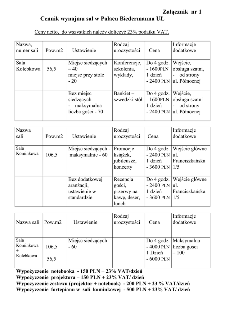 Załącznik nr 1 Cennik wynajmu sal w Pałacu Biedermanna UŁ Ceny netto, do wszystkich należy doliczyć 23% podatku VAT. Nazwa, numer sali Sala Kolebkowa Nazwa sali Sala Kominkowa Pow.m2 56,5 Pow.m2 106,5 Nazwa sali Pow.m2 Sala Kominkowa + Kolebkowa 106,5 56,5 Ustawienie Rodzaj uroczystości Cena Informacje dodatkowe Miejsc siedzących – 40 miejsc przy stole - 20 Konferencje, Do 4 godz. szkolenia, - 1600PLN wykłady, 1 dzień - 2400 PLN Wejście, obsługa szatni, - od strony ul. Północnej Bez miejsc siedzących - maksymalna liczba gości - 70 Bankiet – Do 4 godz. szwedzki stół - 1600PLN 1 dzień - 2400 PLN Wejście, obsługa szatni - od strony ul. Północnej Rodzaj uroczystości Cena Informacje dodatkowe Miejsc siedzących - Promocje maksymalnie - 60 książek, jubileusze, koncerty Do 4 godz. - 2400 PLN 1 dzień - 3600 PLN Wejście główne ul. Franciszkańska 1/5 Bez dodatkowej aranżacji, ustawienie w standardzie Do 4 godz. - 2400 PLN 1 dzień - 3600 PLN Wejście główne ul. Franciszkańska 1/5 Ustawienie Ustawienie Miejsc siedzących - 60 Recepcja gości, przerwy na kawę, deser, lunch Rodzaj uroczystości Cena Informacje dodatkowe Do 4 godz. Maksymalna - 4000 PLN liczba gości 1 Dzień – 100 - 6000 PLN Wypożyczenie notebooka - 150 PLN + 23% VAT/dzień Wypożyczenie projektora – 150 PLN + 23% VAT/ dzień Wypożyczenie zestawu (projektor + notebook) - 200 PLN + 23 % VAT/dzień Wypożyczenie fortepianu w sali kominkowej - 500 PLN + 23% VAT/ dzień -2Nazwa , numer sali Aula Sala 202 Pow.m2 122,7 Aula Sala 202 Korytarze Nazwa sali, gabinetu Ustawienie Ustawienie 69,8 Wyposażenie stałe Gabinet nr 2 49,3 Taras Ogród Zaplecze cateringowe Wyposażenie stałe Informacje dodatkowe Wejście, szatnia od strony ul. Północnej Wejście główneWyłącznie przy wynajęciu Sali kominkowej 1 dzień 1stanowisko - 150 PLN Stanowisko, sprzedaż książek, baner reklamowy, stoisko, itp. Pow.m2 Cena Teatralne Konferencja, Do 4 godz. miejsc siedzących promocja - 1200PLN maksymalnie -130 książki, 1 dzień konferencja - 2400 PLN prasowa, wykład Teatralne Do 4 godz. miejsc siedzących -1000 PLN maksymalnie - 130 1 dzień - 1600 PLN Gabinet nr 1 Rektorski Rodzaj spotkania Propozycja wynajęcia Dla VIP, wywiad, konferencja prasowa Garderoba dla artystów, zaplecze organizacyjne Cena Informacje dodatkowe 1 dzień Wyłącznie przy - 1000 PLN wynajęciu Sali Kominkowej 1 dzień Wyłącznie przy - 700 PLN wynajęciu Sali Kominkowej 50,0 1 dzień Wyłącznie przy - 300 PLN wynajęciu Sali Kominkowej 1,8 h 1 godzina Zdjęcia - 150 PLN niekomercyjne 1 dzień - 5 000 PLN Cel komercyjny 12,5 Wyposażenie stałe 1 dzień - 200 PLN