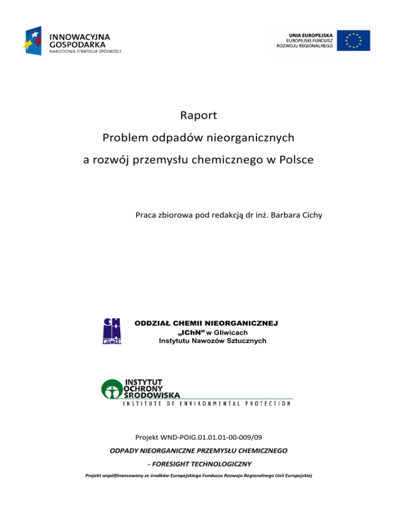 Raport Problem odpadów nieorganicznych a rozwój przemysłu chemicznego w Polsce Praca zbiorowa pod redakcją dr inż. Barbara Cichy ODDZIAŁ CHEMII NIEORGANICZNEJ „IChN” w Gliwicach Instytutu Nawozów Sztucznych Projekt WND-POIG.01.01.01-00-009/09 ODPADY NIEORGANICZNE PRZEMYSŁU CHEMICZNEGO - FORESIGHT TECHNOLOGICZNY Projekt współfinansowany ze środków Europejskiego Funduszu Rozwoju Regionalnego Unii Europejskiej Raport opracowany przez: Instytut Nawozów Sztucznych Oddział Chemii Nieorganicznej IChN w Gliwicach i Instytut Ochrony Środowiska w Warszawie w ramach Projektu: WND-POIG.01.01.01-00-009/09 ODPADY NIEORGANICZNE PRZEMYSŁU CHEMICZNEGO TECHNOLOGICZNY Autorzy opracowania: Barbara Cichy - Redaktor opracowania Krzysztof Czarnomski rozdział 5 Stanisław Folek rozdział 4 Joanna Gluzioska rozdział 3 Magdalena Głogowska rozdział 7 Tomasz Kosioski rozdział 6 Ewa Kużdżał rozdział 2 Wojciech Lubiewa-Wieleżyoski rozdział 1 Renata Osiecka rozdział 5 Andrzej Paszek Rozdział2 Barbara Walawska rozdział 3 Jerzy Zwoździak rozdział 6 - FORESIGHT Spis treści Wprowadzenie Str.1. Rozdział 1. Str.6 Prognozy rozwoju przemysłu chemicznego w Europie za szczególnym uwzględnieniem przemysłu nieorganicznego i nawozowego autor: Wojciech Lubiewa-Wieleżyoski, Prezes Polskiej Izby Przemysłu Chemicznego Rozdział 2. Str.24 Stan aktualny gospodarki odpadami nieorganicznymi w polskim przemyśle chemicznym; inwentaryzacja odpadów nieorganicznych przemysłu chemicznego, autorzy: dr inż. Andrzej Paszek, mgr inż. Ewa Kużdżał (Instytut Nawozów Sztucznych Oddział Chemii Nieorganicznej IChNw Gliwicach) Rozdział 3 Str.48 Kierunki rozwoju wybranych technologii nieorganicznych – przegląd literatury autorzy: dr inż. Barbara Walawska, dr inż. Joanna Gluzioska (Instytut Nawozów Sztucznych Oddział Chemii Nieorganicznej IChN w Gliwicach Rozdział 4. Str.73 Przegląd możliwości odzysku odpadów nieorganicznych przemysłu chemicznego autor: dr inż. Stanisław Folek (Instytut Nawozów Sztucznych Oddział Chemii Nieorganicznej IChN w Gliwicach) Rozdział 5. Str.92 Stan prawny aktualny i przewidywany w krajach Wspólnoty Europejskiej istotny dla gospodarki odpadami nieorganicznymi przemysłu chemicznego autorzy: mgr inż. Krzysztof Czarnomski, mgr inż. Renata Osiecka (Instytut Ochrony Środowiska w Warszawie) Rozdział 6. Str.104 Analiza przewidywanych zmian IPPC o istotnym znaczeniu dla przemysłu nieorganicznego. autorzy: prof.dr hab. Jerzy Zwoździak, (Politechnika Wrocławska), dr inż. Tomasz Kosioski) Rozdział 7. Str.115 Analiza środowiskowo-społeczna autor: mgr Magdalena Głogowska (Instytut Ochrony Środowiska w Warszawie) Podsumowanie Str.122 Wprowadzenie Wyroby przemysłu chemicznego są obecne wszędzie i towarzyszą nam na co dzieo. Większośd z nich to nie produkty rynkowe, ale wyroby przetwarzane następnie przez inne branże przemysłu, np: przemysł motoryzacyjny, tekstylia, produkcja żywności, przemysł elektroniczny, budownictwo itd. Można zaryzykowad twierdzenie, że ekonomiczny dobrostan tej branży wpływa w istotny sposób na poziom życia społeczeostw. Szacuje się, że ludnośd świata od obecnej liczby 6,7 miliarda wzrośnie do 9,2 miliarda w roku 2050. Tak szybki wzrost populacji spowoduje szereg problemów związanych z: produkcją energii, zapewnieniem dostatecznej ilości dobrej jakościowo wody, żywności i leków. Fakty te to wyzwanie dla rozwoju chemii i przemysłu chemicznego. Grupa producentów chemikaliów musi połączyd zasady zrównoważonego rozwoju ze zrównoważoną, czyli opłacalną, gospodarką. Wartośd produkcji europejskiego przemysłu chemicznego wynosi obecnie 566 mld Euro, zatrudnienie 1,2 miliona osób, europejski przemysł europejski wytwarza 30% światowej 1 produkcji chemikaliów (dane dla roku 2008)1. Jednakże udział produkcji europejskiej systematycznie maleje na rzecz chemikaliów wytwarzanych w krajach azjatyckich. Udział sprzedaży produktów chemicznych pochodzących z tej części świata w ciągu ostatnich dziesięciu lat podwoił się. Jeśli przyjrzed się bliżej produkcji sprzedanej wytworzonej przez europejskie przemysł chemiczny, to wiodącą rolę mają takie kraje jak: Niemcy, Francja, Wielka Brytania. Wartośd sprzedaży tych trzech krajów wynosi ponad 50% całkowitej sprzedaży europejskiej branży chemicznej. Sprzedaż polskiego przemysłu chemicznego stanowi nieco ponad 2% rynku europejskiego. Powodem spadku udziału europejskich produktów w światowym rynku chemikaliów są przede wszystkim ceny surowców i paliw oraz nakłady jakie muszą ponosid europejskie firmy branży chemicznej, aby dostosowad swoje technologie do niezwykle wyśrubowanych standardów środowiskowych nakładanych na producentów przez Unię Europejską. Nie bez znaczenia dla kosztów produkcji są konsekwencje prawodawstwa unijnego, które ustala ambitne cele redukcji emisji do środowiska. To, jaką wagę przykłada Wspólnota do kwestii środowiskowych bardzo wyraźnie można zaobserwowad we wzroście regulacji dotyczących środowiska naturalnego i środowiska pracy; podczas gdy w roku 1990 aktów prawnych z tego zakresu było 307 dziś jest ich około 1800. Ten lawinowy wzrost jest dla przedsiębiorców prawdziwym wyzwaniem, nie tylko w zakresie konieczności śledzenia zmian, ale również ciągłego inwestowania w nowe technologie2. Aktualną kondycję polskiego przemysłu chemicznego na tle całej produkcji w Polsce przedstawiają dane w tabelach 1 i 2. Należy zwrócid uwagę, że lata 2008 i 2009 to okres kryzysu w gospodarce światowej. 1 2 Consultation on the future „EU 2020” Strategy, Draft CEFIC Comments; January 2010 W. Lubiewa-Wieleżyoski, Chemik 64(3),2010 2 Tabela 1. Produkcja sprzedana w Polsce 2008-2009 -w milionach PLN (dane GUS) Branża 2008 2009 Dynamika, % 2009:2008 Przetwórstwo 720 694,2 706 943,3 98,1 37 966,8 36 473,6 96,1 Farmaceutyczne 9 558,8 10 646,7 111,4 Wyroby z gumy i tworzywa 41