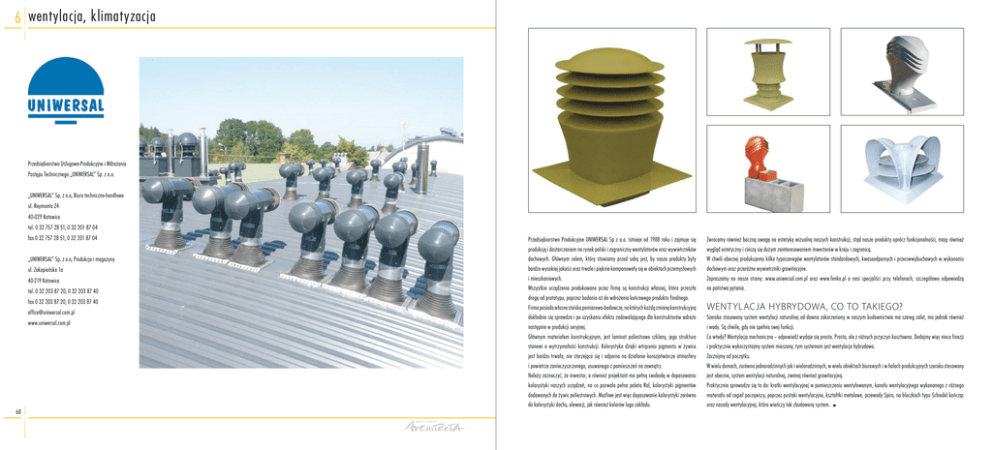 6 wentylacja, klimatyzacja Przedsiębiorstwo Usługowo-Produkcyjne i Wdrażania Postępu Technicznego „UNIWERSAL” Sp. z o.o. „UNIWERSAL” Sp. z o.o, Biuro techniczno-handlowe ul. Reymonta 24 40-029 Katowice tel. 0 32 757 28 51, 0 32 201 87 04 fax 0 32 757 28 51, 0 32 201 87 04 „UNIWERSAL” Sp. z o.o, Produkcja i magazyny ul. Zakopiańska 1a 40-219 Katowice tel. 0 32 203 87 20, 0 32 203 87 40 fax 0 32 203 87 20, 0 32 203 87 40 [email protected] www.uniwersal.com.pl 68 Przedsiębiorstwo Produkcyjne UNIWERSAL Sp z o.o. istnieje od 1988 roku i zajmuje się produkcją i dostarczaniem na rynek polski i zagraniczny wentylatorów oraz wywietrzników dachowych. Głównym celem, który stawiamy przed sobą jest, by nasze produkty były bardzo wysokiej jakości oraz trwale i pięknie komponowały się w obiektach przemysłowych i mieszkaniowych. Wszystkie urządzenia produkowane przez firmę są konstrukcji własnej, która przeszła drogę od prototypu, poprzez badania aż do wdrożenia końcowego produktu finalnego. Firma posiada własne stoiska pomiarowo-badawcze, na których każdą zmianę konstrukcyjną dokładnie się sprawdza i po uzyskaniu efektu zadowalającego dla konstruktorów wdraża następnie w produkcji seryjnej. Głównym materiałem konstrukcyjnym, jest laminat poliestrowo szklany, jego struktura stanowi o wytrzymałości konstrukcji. Kolorystyka dzięki wtrąceniu pigmentu w żywice jest bardzo trwała, nie starzejąca się i odporna na działanie korozjotwórcze atmosfery i powietrza zanieczyszczonego, usuwanego z pomieszczeń na zewnątrz. Należy zaznaczyć, że inwestor, a również projektant ma pełną swobodę w dopasowaniu kolorystyki naszych urządzeń, na co pozwala pełna paleta Ral, kolorystyki pigmentów dodawanych do żywic poliestrowych. Możliwe jest więc dopasowanie kolorystyki zarówno do kolorystyki dachu, elewacji, jak również kolorów logo zakładu. Zwracamy również baczną uwagę na estetykę wizualną naszych konstrukcji, stąd nasze produkty oprócz funkcjonalności, mają również wygląd estetyczny i cieszą się dużym zainteresowaniem inwestorów w kraju i zagranicą. W chwili obecnej produkujemy kilka typoszeregów wentylatorów standardowych, kwasoodpornych i przeciwwybuchowych w wykonaniu dachowym oraz przeróżne wywietrzniki grawitacyjne. Zapraszamy na nasze strony: www.uniwersal.com.pl oraz www.fenko.pl a nasi specjaliści przy telefonach, szczegółowo odpowiedzą na państwa pytania. Wentylacja hybrydowa, co to takiego? Szeroko stosowany system wentylacji naturalnej od dawna zakorzeniony w naszym budownictwie ma szereg zalet, ma jednak również i wady. Są chwile, gdy nie spełnia swej funkcji. Co wtedy? Wentylacja mechaniczna – odpowiedź wydaje się prosta. Prosta, ale z różnych przyczyn kosztowna. Dodajmy więc nieco finezji i praktycznie wykorzystajmy system mieszany, tym systemem jest wentylacja hybrydowa. Zacznijmy od początku. W wielu domach, zarówno jednorodzinnych jak i wielorodzinnych, w wielu obiektach biurowych i w halach produkcyjnych szeroko stosowany jest obecnie, system wentylacji naturalnej, zwanej również grawitacyjną. Praktycznie sprowadza się to do: kratki wentylacyjnej w pomieszczeniu wentylowanym, kanału wentylacyjnego wykonanego z różnego materiału od cegieł począwszy, poprzez pustaki wentylacyjne, kształtki metalowe, przewody Spiro, na bloczkach typu Schiedel kończąc oraz nasady wentylacyjnej, która wieńczy tak zbudowany system. 6 wentylacja, klimatyzacja Przedsiębiorstwo Usługowo-Produkcyjne i Wdrażania Postępu Technicznego „UNIWERSAL” Sp. z o.o. „UNIWERSAL” Sp. z o.o, Biuro techniczno-handlowe ul. Reymonta 24 40-029 Katowice tel. 0 32 757 28 51, 0 32 201 87 04 fax 0 32 757 28 51, 0 32 201 87 04 „UNIWERSAL” Sp. z o.o, Produkcja i magazyny ul. Zakopiańska 1a 40-219 Katowice tel. 0 32 203 87 20, 0 32 203 87 40 fax 0 32 203 87 20, 0 32 203 87 40 [email protected] www.uniwersal.com.pl Zadaniem takiego układu jest zapewnienie norm higienicznych wymiany powietrza w pomieszczeniach w ilościach odpowiednio: kuchnia z oknem zewnętrznym wyposażona w kuchenkę gazową lub węglową – 70 m3/h kuchnia z oknem zewnętrznym, wyposażona w kuchenkę elektryczną – w mieszkaniu do 3 osób –30 m3/h, – w mieszkaniu dla więcej niż 3 osoby – 50 m3/h kuchnia bez okna zewnętrznego wyposażona w kuchenkę elektryczną – 50 m3/h kuchnia bez okna zewnętrznego, wyposażona w kuchenkę gazową, obowiązkowo z mechaniczną wentylacją wywiewną – 70 m3/h łazienka z wc lub bez – 50 m3/h oddzielny wc – 30 m3/h pomieszczenie bezokienne (garderoba) – 15 m3/h pokój mieszkalny oddzielony od pomieszczeń kuchni, łazienki i wc więcej niż dwojgiem drzwi lub pokój znajdujący się na wyższym poziomie w wielopoziomowym domu jednorodzinnym lub w wielopoziomowym mieszkaniu domu wielorodzinnego – 30 m3/h. Wymiana powietrza w ciągu godziny powinna być równa co najmniej kubaturze pokoju. Pytanie jest jednak czy zapewnia? 70 Zdawać musimy sobie sprawę ze zmiennej skuteczności działania takiej wentylacji. Wielu użytkowników obserwuje w swoich mieszkaniach bezruch powietrza w kanałach wentylacyjnych a w skrajnych przypadkach ciągi wsteczne, w których kratka wentylacyjna wywiewna zamienia się nagle w nawiewną i nieprzyjemne chłodne powietrze z różnymi zapachami w sposób niekontrolowany rozchodzi się po pomieszczeniu. Odpowiada za to wiele czynników, usytuowanie budynku względem najczęściej występujących kierunków wiatru, jego wysokość, umiejscowienie wywietrznika na dachu – częste są przypadki gdy wywietrznik jest zabudowany w strefie występujących zawirowań powietrznych, temperatury powietrza zewnętrznego, temperatury pomieszczenia, jak również sposobu doprowadzenia powietrza do budynku czy pomieszczenia. Oczywiście można zaradzić tym negatywnym efektom wentylacji naturalnej, spełniając wszystkie kryteria dobrego jej doboru i właśc