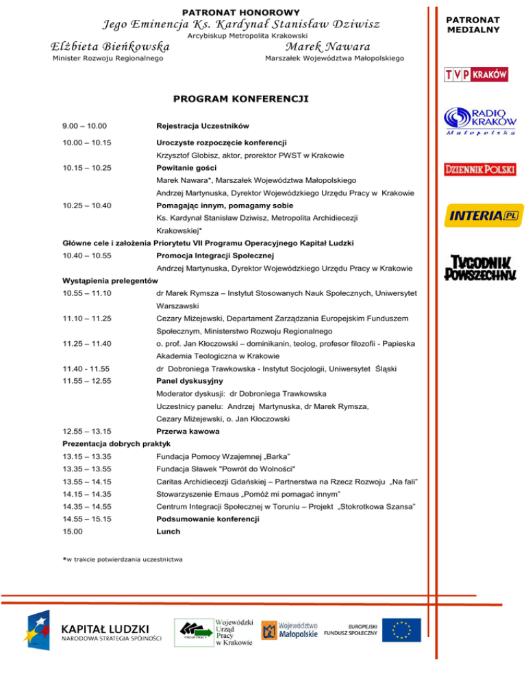 PATRONAT HONOROWY Jego Eminencja Ks. Kardynał Stanisław Dziwisz Arcybiskup Metropolita Krakowski ElŜbieta Bieńkowska Marek Nawara Minister Rozwoju Regionalnego Marszałek Województwa Małopolskiego PROGRAM KONFERENCJI 9.00 – 10.00 Rejestracja Uczestników 10.00 – 10.15 Uroczyste rozpoczęcie konferencji Krzysztof Globisz, aktor, prorektor PWST w Krakowie 10.15 – 10.25 Powitanie gości Marek Nawara*, Marszałek Województwa Małopolskiego Andrzej Martynuska, Dyrektor Wojewódzkiego Urzędu Pracy w Krakowie 10.25 – 10.40 Pomagając innym, pomagamy sobie Ks. Kardynał Stanisław Dziwisz, Metropolita Archidiecezji Krakowskiej* Główne cele i załoŜenia Priorytetu VII Programu Operacyjnego Kapitał Ludzki 10.40 – 10.55 Promocja Integracji Społecznej Andrzej Martynuska, Dyrektor Wojewódzkiego Urzędu Pracy w Krakowie Wystąpienia prelegentów 10.55 – 11.10 dr Marek Rymsza – Instytut Stosowanych Nauk Społecznych, Uniwersytet Warszawski 11.10 – 11.25 Cezary MiŜejewski, Departament Zarządzania Europejskim Funduszem Społecznym, Ministerstwo Rozwoju Regionalnego 11.25 – 11.40 o. prof. Jan Kłoczowski – dominikanin, teolog, profesor filozofii - Papieska Akademia Teologiczna w Krakowie 11.40 - 11.55 dr Dobroniega Trawkowska - Instytut Socjologii, Uniwersytet Śląski 11.55 – 12.55 Panel dyskusyjny Moderator dyskusji: dr Dobroniega Trawkowska Uczestnicy panelu: Andrzej Martynuska, dr Marek Rymsza, Cezary MiŜejewski, o. Jan Kłoczowski 12.55 – 13.15 Przerwa kawowa Prezentacja dobrych praktyk 13.15 – 13.35 Fundacja Pomocy Wzajemnej „Barka” 13.35 – 13.55 Fundacja Sławek "Powrót do Wolności" 13.55 – 14.15 Caritas Archidiecezji Gdańskiej – Partnerstwa na Rzecz Rozwoju „Na fali” 14.15 – 14.35 Stowarzyszenie Emaus „PomóŜ mi pomagać innym” 14.35 – 14.55 Centrum Integracji Społecznej w Toruniu – Projekt „Stokrotkowa Szansa” 14.55 – 15.15 Podsumowanie konferencji 15.00 Lunch *w trakcie potwierdzania uczestnictwa PATRONAT MEDIALNY