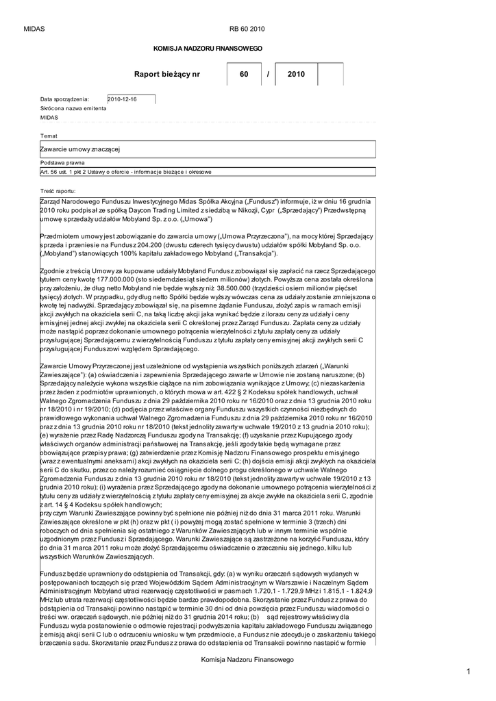 MIDAS RB 60 2010 KOMISJA NADZORU FINANSOWEGO Raport bieżący nr Data sporządzenia: 60 / 2010 2010-12-16 Skrócona nazwa emitenta MIDAS Temat Zawarcie umowy znaczącej Podstawa prawna Art. 56 ust. 1 pkt 2 Ustawy o ofercie - informacje bieżące i okresowe Treść raportu: Zarząd Narodowego Funduszu Inwestycyjnego Midas Spółka Akcyjna („Fundusz") informuje, iż w dniu 16 grudnia 2010 roku podpisał ze spółką Daycon Trading Limited z siedzibą w Nikozji, Cypr („Sprzedający”) Przedwstępną umowę sprzedaży udziałów Mobyland Sp. z o.o. („Umowa”) Przedmiotem umowy jest zobowiązanie do zawarcia umowy („Umowa Przyrzeczona”), na mocy której Sprzedający sprzeda i przeniesie na Fundusz 204.200 (dwustu czterech tysięcy dwustu) udziałów spółki Mobyland Sp. o.o. („Mobyland”) stanowiących 100% kapitału zakładowego Mobyland („Transakcja”). Zgodnie z treścią Umowy za kupowane udziały Mobyland Fundusz zobowiązał się zapłacić na rzecz Sprzedającego tytułem ceny kwotę 177.000.000 (sto siedemdziesiąt siedem milionów) złotych. Powyższa cena została określona przy założeniu, że dług netto Mobyland nie będzie wyższy niż 38.500.000 (trzydzieści osiem milionów pięćset tysięcy) złotych. W przypadku, gdy dług netto Spółki będzie wyższy wówczas cena za udziały zostanie zmniejszona o kwotę tej nadwyżki. Sprzedający zobowiązał się, na pisemne żądanie Funduszu, złożyć zapis w ramach emisji akcji zwykłych na okaziciela serii C, na taką liczbę akcji jaka wynikać będzie z ilorazu ceny za udziały i ceny emisyjnej jednej akcji zwykłej na okaziciela serii C określonej przez Zarząd Funduszu. Zapłata ceny za udziały może nastąpić poprzez dokonanie umownego potrącenia wierzytelności z tytułu zapłaty ceny za udziały przysługującej Sprzedającemu z wierzytelnością Funduszu z tytułu zapłaty ceny emisyjnej akcji zwykłych serii C przysługującej Funduszowi względem Sprzedającego. Zawarcie Umowy Przyrzeczonej jest uzależnione od wystąpienia wszystkich poniższych zdarzeń („Warunki Zawieszające”): (a) oświadczenia i zapewnienia Sprzedającego zawarte w Umowie nie zostaną naruszone; (b) Sprzedający należycie wykona wszystkie ciążące na nim zobowiązania wynikające z Umowy; (c) niezaskarżenia przez żaden z podmiotów uprawnionych, o których mowa w art. 422 § 2 Kodeksu spółek handlowych, uchwał Walnego Zgromadzenia Funduszu z dnia 29 października 2010 roku nr 16/2010 oraz z dnia 13 grudnia 2010 roku nr 18/2010 i nr 19/2010; (d) podjęcia przez właściwe organy Funduszu wszystkich czynności niezbędnych do prawidłowego wykonania uchwał Walnego Zgromadzenia Funduszu z dnia 29 października 2010 roku nr 16/2010 oraz z dnia 13 grudnia 2010 roku nr 18/2010 (tekst jednolity zawarty w uchwale 19/2010 z 13 grudnia 2010 roku); (e) wyrażenie przez Radę Nadzorczą Funduszu zgody na Transakcję; (f) uzyskanie przez Kupującego zgody właściwych organów administracji państwowej na Transakcję, jeśli zgody takie będą wymagane przez obowiązujące przepisy prawa; (g) zatwierdzenie przez Komisję Nadzoru Finansowego prospektu emisyjnego (wraz z ewentualnymi aneksami) akcji zwykłych na okaziciela serii C; (h) dojścia emisji akcji zwykłych na okaziciela serii C do skutku, przez co należy rozumieć osiągnięcie dolnego progu określonego w uchwale Walnego Zgromadzenia Funduszu z dnia 13 grudnia 2010 roku nr 18/2010 (tekst jednolity zawarty w uchwale 19/2010 z 13 grudnia 2010 roku); (i) wyrażenia przez Sprzedającego zgody na dokonanie umownego potrącenia wierzytelności z tytułu ceny za udziały z wierzytelnością z tytułu zapłaty ceny emisyjnej za akcje zwykłe na okaziciela serii C, zgodnie z art. 14 § 4 Kodeksu spółek handlowych; przy czym Warunki Zawieszające powinny być spełnione nie później niż do dnia 31 marca 2011 roku. Warunki Zawieszające określone w pkt (h) oraz w pkt ( i) powyżej mogą zostać spełnione w terminie 3 (trzech) dni roboczych od dnia spełnienia się ostatniego z Warunków Zawieszających lub w innym terminie wspólnie uzgodnionym przez Fundusz i Sprzedającego. Warunki Zawieszające są zastrzeżone na korzyść Funduszu, który do dnia 31 marca 2011 roku może złożyć Sprzedającemu oświadczenie o zrzeczeniu się jednego, kilku lub wszystkich Warunków Zawieszających. Fundusz będzie uprawniony do odstąpienia od Transakcji, gdy: (a) w wyniku orzeczeń sądowych wydanych w postępowaniach toczących się przed Wojewódzkim Sądem Administracyjnym w Warszawie i Naczelnym Sądem Administracyjnym Mobyland utraci rezerwację częstotliwości w pasmach 1.720,1 - 1.729,9 MHz i 1.815,1 - 1.824,9 MHz lub utrata rezerwacji częstotliwości będzie bardzo prawdopodobna. Skorzystanie przez Fundusz z prawa do odstąpienia od Transakcji powinno nastąpić w terminie 30 dni od dnia powzięcia przez Funduszu wiadomości o treści ww. orzeczeń sądowych, nie później niż do 31 grudnia 2014 roku; (b) sąd rejestrowy właściwy dla Funduszu wyda postanowienie o odmowie rejestracji podwyższenia kapitału zakładowego Funduszu związanego z emisją akcji serii C lub o odrzuceniu wniosku w tym przedmiocie, a Fundusz nie zdecyduje o zaskarżeniu takiego orzeczenia sądu. Skorzystanie przez Fundusz z prawa do odstąpienia od Transakcji powinno nastąpić w formie Komisja Nadzoru Finansowego 1 MIDAS RB 60 2010 orzeczenia sądu. Skorzystanie przez Fundusz z prawa do odstąpienia od Transakcji powinno nastąpić w formie pisemnej w ciągu 7 dni roboczych od daty otrzymania przez Fundusz postanowienia o odmowie rejestracji podwyższenia kapitału zakładowego lub o odrzuceniu wniosku w tym przedmiocie. Umowa nie zwiera postanowień dotyczących kar umownych. Umowa została uznana za znaczącą ze względu na jej wartość przekraczającą 10% kapitałów własnych Funduszu. Podstawę prawną sporządzenia niniejszego raportu stanowi art. 56 ust. 1 pkt 2 Ustawy z dnia 2