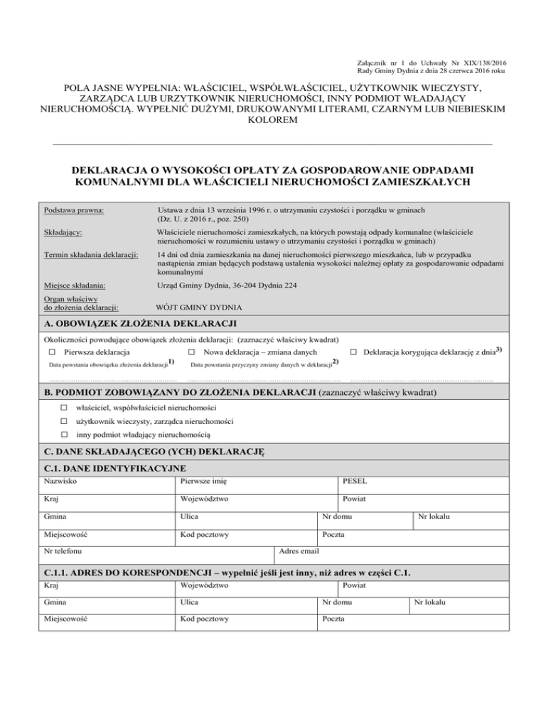 Załącznik nr 1 do Uchwały Nr XIX/138/2016 Rady Gminy Dydnia z dnia 28 czerwca 2016 roku POLA JASNE WYPEŁNIA: WŁAŚCICIEL, WSPÓŁWŁAŚCICIEL, UŻYTKOWNIK WIECZYSTY, ZARZĄDCA LUB URZYTKOWNIK NIERUCHOMOŚCI, INNY PODMIOT WŁADAJĄCY NIERUCHOMOŚCIĄ. WYPEŁNIĆ DUŻYMI, DRUKOWANYMI LITERAMI, CZARNYM LUB NIEBIESKIM KOLOREM ________________________________________________________________________________________________ DEKLARACJA O WYSOKOŚCI OPŁATY ZA GOSPODAROWANIE ODPADAMI KOMUNALNYMI DLA WŁAŚCICIELI NIERUCHOMOŚCI ZAMIESZKAŁYCH Podstawa prawna: Ustawa z dnia 13 września 1996 r. o utrzymaniu czystości i porządku w gminach (Dz. U. z 2016 r., poz. 250) Składający: Właściciele nieruchomości zamieszkałych, na których powstają odpady komunalne (właściciele nieruchomości w rozumieniu ustawy o utrzymaniu czystości i porządku w gminach) Termin składania deklaracji: 14 dni od dnia zamieszkania na danej nieruchomości pierwszego mieszkańca, lub w przypadku nastąpienia zmian będących podstawą ustalenia wysokości należnej opłaty za gospodarowanie odpadami komunalnymi Miejsce składania: Urząd Gminy Dydnia, 36-204 Dydnia 224 Organ właściwy do złożenia deklaracji: WÓJT GMINY DYDNIA A. OBOWIĄZEK ZŁOŻENIA DEKLARACJI Okoliczności powodujące obowiązek złożenia deklaracji: (zaznaczyć właściwy kwadrat) □ □ Pierwsza deklaracja Data powstania obowiązku złożenia deklaracji 1) □ Nowa deklaracja – zmiana danych Deklaracja korygująca deklarację z dnia3) 2) Data powstania przyczyny zmiany danych w deklaracji …..…………………………………………..…… ……………………………………………………………… …………………………………………………….…… B. PODMIOT ZOBOWIĄZANY DO ZŁOŻENIA DEKLARACJI (zaznaczyć właściwy kwadrat) □ □ □ właściciel, współwłaściciel nieruchomości użytkownik wieczysty, zarządca nieruchomości inny podmiot władający nieruchomością C. DANE SKŁADAJĄCEGO (YCH) DEKLARACJĘ C.1. DANE IDENTYFIKACYJNE Nazwisko Pierwsze imię PESEL Kraj Województwo Powiat Gmina Ulica Nr domu Miejscowość Kod pocztowy Poczta Nr telefonu Nr lokalu Adres email C.1.1. ADRES DO KORESPONDENCJI – wypełnić jeśli jest inny, niż adres w części C.1. Kraj Województwo Gmina Ulica Nr domu Miejscowość Kod pocztowy Poczta Powiat Nr lokalu C.2. DANE IDENTYFIKACYJNE WSPÓŁWŁASCICIELA/WSPÓŁMAŁŻONKA Nazwisko Pierwsze imię PESEL Kraj Województwo Powiat Gmina Ulica Nr domu Miejscowość Kod pocztowy Poczta Nr telefonu Nr lokalu Adres email C.2.1. ADRES DO KORESPONDENCJI – wypełnić jeśli jest inny, niż adres w części C.2. Kraj Województwo Gmina Ulica Nr domu Miejscowość Kod pocztowy Poczta Powiat Nr lokalu D. ADRES NIERUCHOMOŚCI ZAMIESZKAŁEJ, KTÓREJ DOTYCZY DEKLARACJA Kraj Województwo Gmina Ulica Nr domu Miejscowość Kod pocztowy Poczta Nr działki4) Powiat Nr lokalu Księga Wieczysta (KW)4) E. DEKLAROWANY SPOSÓB ZBIÓRKI SELEKTYWNY / NIESELEKTYWNY Oświadczam, iż odpady komunalne z nieruchomości zbierane będą w sposób: □ selektywny □ nieselektywny (zmieszany) F. WYSOKOŚĆ MIESIĘCZNEJ OPŁATY5) Oświadczam, że na terenie nieruchomości wskazanej w części D niniejszej deklaracji zamieszkuje: ……….…………. (liczba mieszkańców) Wyliczenie miesięcznej opłaty: ….………………….………. (liczba mieszkańców) X ……………………………… (stawka opłaty) = ………………………….………… zł (iloczyn liczby mieszkańców i stawki opłaty) Wysokość opłaty miesięcznej za gospodarowanie odpadami komunalnymi wynosi ……..…………………..……. zł (słownie ……….……………………………………………………………………………………………..………...) G. ZAŁĄCZNIKI – należy wymienić rodzaj załącznika6) H. PODPIS SKŁADAJĄCEGO(YCH) DEKLARACJĘ …………………………………… (czytelny podpis) ……………………………………… (miejscowość i data) …………………………………… (czytelny podpis) I. ADNOTACJE ORGANU Pouczenie: NINIEJSZA DEKLARACJA STANOWI PODSTAWĘ DO WYSTAWIENIA TYTUŁU WYKONAWCZEGO, zgodnie z przepisami Ustawy z dnia 17 czerwca 1966 r. o postępowaniu egzekucyjnym w administracji. 1. Właściciel nieruchomości jest obowiązany złożyć deklarację o wysokości opłaty za gospodarowanie odpadami komunalnymi do Wójta Gminy Dydnia w terminie 14 dni od dnia zamieszkania na danej nieruchomości pierwszego mieszkańca. 2. W przypadku zmiany danych będących podstawą ustalenia wysokości należnej opłaty za gospodarowanie odpadami komunalnymi, właściciel nieruchomości obowiązany jest złożyć nową deklarację w terminie 14 dni od dnia nastąpienia zmiany. Opłata za gospodarowanie odpadami komunalnymi w zmienionej wysokości należna jest za miesiąc, w którym nastąpiła zmiana. 3. W przypadku gdy w danym miesiącu na danej nieruchomości mieszkaniec zamieszkuje przez część miesiąca, opłatę za gospodarowanie odpadami komunalnymi w miesiącu, w którym nastąpiła zmiana, uiszcza się w gminie, w której dotychczas zamieszkiwał, a w nowym miejscu zamieszkania – począwszy od miesiąca następnego, po którym nastąpiła z miana. 4. Wyliczoną opłatę uiszcza się zgodnie z Uchwałą Rady Gminy Dydnia w sprawie określenia terminu, częstotliwości i trybu uiszczania opłaty za gospodarowanie odpadami komunalnymi. 5. Wysokość zobowiązania określonego w deklaracji o wysokości opłaty za gospodarowanie odpadami komunalnymi obowiązuje za kolejne miesiące do czasu korekty, zmiany danych w deklaracji lub zmiany stawki opłaty za gospodarowanie odpadami komunalnymi. 6. W przypadku gdy deklaracja jest składana przez pełnomocnika właściciela nieruchomości do deklaracji należy dołączyć dokument pełnomocnictwa. Objaśnienia: W przypadku złożenia pierwszej deklaracji nale
