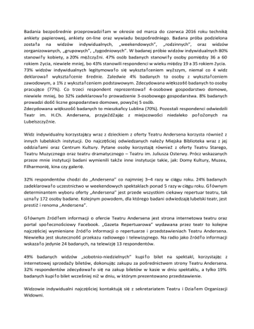 Badania bezpośrednie przeprowadziłam w okresie od marca do czerwca 2016 roku techniką ankiety papierowej, ankiety on-line oraz wywiadu bezpośredniego. Badana próba podzielona została na widzów indywidualnych, „weekendowych”, „rodzinnych”, oraz widzów zorganizowanych, „grupowych”, „tygodniowych”. W badanej próbie widzów indywidualnych 80% stanowiły kobiety, a 20% mężczyźni. 47% osób badanych stanowiły osoby pomiędzy 36 a 60 rokiem życia, niewiele mniej, bo 43% stanowili respondenci w wieku między 19 a 35 rokiem życia. 73% widzów indywidualnych legitymowało się wykształceniem wyższym, niemal co 4 widz deklarował wykształcenie średnie. Zaledwie 4% badanych to osoby z wykształceniem zawodowym, a 1% z wykształceniem podstawowym. Zdecydowana większość badanych to osoby pracujące (77%). Co trzeci respondent reprezentował 4-osobowe gospodarstwo domowe, niewiele mniej, bo 32% zadeklarowało prowadzenie 3-osobowego gospodarstwa. 8% badanych prowadzi dość liczne gospodarstwo domowe, powyżej 5 osób. Zdecydowana większość badanych to mieszkańcy Lublina (70%). Pozostali respondenci odwiedzili Teatr im. H.Ch. Andersena, przyjeżdżając z miejscowości niedaleko położonych na Lubelszczyźnie. Widz indywidualny korzystający wraz z dzieckiem z oferty Teatru Andersena korzysta również z innych lubelskich instytucji. Do najczęściej odwiedzanych należy Miejska Biblioteka wraz z jej oddziałami oraz Centrum Kultury. Pytane osoby korzystają również z oferty Teatru Starego, Teatru Muzycznego oraz teatru dramatycznego – Teatru im. Juliusza Osterwy. Prócz wskazanych przeze mnie instytucji badani wymienili także inne instytucje takie, jak: Domy Kultury, Muzea, Filharmonię, kina czy galerię. 32% respondentów chodzi do „Andersena” co najmniej 3–4 razy w ciągu roku. 24% badanych zadeklarowało uczestnictwo w weekendowych spektaklach ponad 5 razy w ciągu roku. Głównym determinantem wyboru oferty „Andersena” jest przede wszystkim ciekawy repertuar teatru, tak uznały 172 osoby badane. Kolejnym powodem, dla którego badani odwiedzają lubelski teatr, jest prestiż i renoma „Andersena”. Głównym źródłem informacji o ofercie Teatru Andersena jest strona internetowa teatru oraz portal społecznościowy Facebook. „Gazeta Repertuarowa” wydawana przez teatr to kolejne najczęściej wymieniane źródło informacji o repertuarze i przedstawieniach Teatru Andersena. Niewielka jest skuteczność przekazu radiowego i telewizyjnego. Na radio jako źródło informacji wskazało jedynie 24 badanych, na telewizję 13 respondentów. 49% badanych widzów „sobotnio-niedzielnych” kupiło bilet na spektakl, korzystając z internetowej sprzedaży biletów, dokonując zakupu za pośrednictwem strony Teatru Andersena. 32% respondentów zdecydowało się na zakup biletów w kasie w dniu spektaklu, a tylko 19% badanych kupiło bilet wcześniej niż w dniu, w którym prezentowano przedstawienie. Widzowie indywidualni najczęściej kontaktują się z sekretariatem Teatru i Działem Organizacji Widowni. Reasumując wyniki badań, bardzo wysoko respondenci ocenili funkcjonowanie Teatru im. H.Ch. Andersena, biorąc pod uwagę: proponowany przez teatr repertuar, obsługę spektakli, ofertę edukacyjną oraz działania promocyjno-informacyjne. Wszystkie oceniane przez widzów aspekty działalności otrzymały bardzo dobre i dobre oceny. Najwięcej badanych, bo aż 64% najwyżej oceniło obsługę spektakli, 47% przyznało najwyższą ocenę za proponowany przez „Andersena” repertuar. Widzowie indywidualni oczekują od Teatru im. H. Ch. Andersena, by w sposób niezwykle atrakcyjny pokazywał świat teatralnej fikcji, tak aby najmłodszy widz w tym teatrze się nie nudził i aby chciał do niego wrócić. Aby w przyszłości stał się pokoleniem widza dorosłego, świadomie uczestnicząc w wydarzeniach teatralnych i artystycznych. „Oczekuję, że w teatrze dla młodego widza będą stosowane rozwiązania, które są stosowane coraz częściej (choć nie zawsze celowo!) w teatrach dla dorosłych; mówię tu o takich niekonwencjonalnych formach artystycznej wypowiedzi. Mam nadzieję, że jeśli moje dziecko jako dorosły człowiek będzie chciało chodzić do teatru »dorosłego«, to będzie przygotowane na niekonwencjonalne zachowania aktorów, rozwiązania sceniczne, scenograficzne”1 . Teatr lalek to miejsce, gdzie najczęściej dochodzi do pierwszego kontaktu dziecka ze sztuką w ogóle, w tym przypadku z „żywą” sztuką, jaką jest przedstawienie teatralne. Widzowie oczekują również, by teatr w swojej ofercie miał zarówno to, co klasyczne, jak i współczesne. Klasyczne baśnie zawsze będą przyciągały. Bo przecież to my, dorośli, decydujemy o wyborze i uczestnictwie naszych dzieci w teatrze, a my sami oglądaliśmy je z zapartym tchem, pamiętamy te tytuły z naszej przeszłości, wtedy, kiedy to my byliśmy dziećmi. „Chciałabym również, aby teatr zapoznał moje dzieci z całym światem teatralnym, to znaczy żeby dzieci wiedziały, że była taka pani Janina Porazińska, że były takie bajki jak Czerwony Kapturek itd. Chcę, aby teatr pokazywał klasykę w sposób nowoczesny, klasykę, która się wydaje ciężka, nudna i zakurzona. Aby pokazywał, że – przy odrobinie dobrej woli twórcy i odbiorcy – coś takiego, co zostało stworzone lat temu setki, odpowiednio zinterpretowane, może być również dziś interesujące i ciekawe. Oczekiwałabym jednocześnie, żeby teatr sięgał po twórców współczesnych, by zainteresował moje dzieci pewnymi nazwiskami lub prądami literackimi czy artystycznymi, ważnymi dla młodego widza”2 . Badani chcieliby, aby teatr nie był tylko rozrywką, aby zmuszał do refleksji. Żeby nie bał się mówić do najmłodszych o tym, co trudne i ważne. Żeby teatr to nie była tylko sztuka, która ma wypełnić nasze oczekiwania estetyczne, czy też zaspokoić wyłącznie po