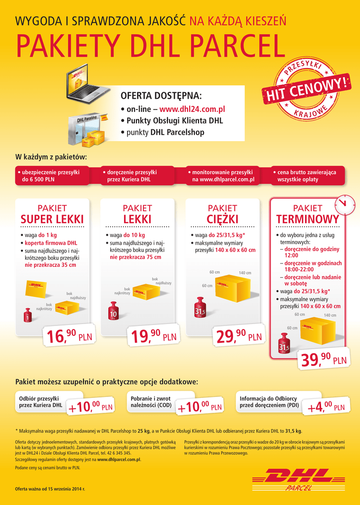 WYGODA I SPRAWDZONA JAKOŚĆ NA KAŻDĄ KIESZEŃ P PAKIETY DHL PARCEL R YŁKI S E Z ! Y W O N E IT C H OFERTA DOSTĘPNA: • on-line – www.dhl24.com.pl • Punkty Obsługi Klienta DHL • punkty DHL Parcelshop KRAJOW E W każdym z pakietów: • ubezpieczenie przesyłki do 6 500 PLN • doręczenie przesyłki przez Kuriera DHL PAKIET • monitorowanie przesyłki na www.dhlparcel.com.pl PAKIET SUPER LEKKI PAKIET LEKKI • waga do 1 kg • koperta firmowa DHL • suma najdłuższego i najkrótszego boku przesyłki nie przekracza 35 cm • waga do 10 kg • suma najdłuższego i najkrótszego boku przesyłki nie przekracza 75 cm PAKIET CIĘŻKI TERMINOWY • waga do 25/31,5 kg* • maksymalne wymiary przesyłki 140 x 60 x 60 cm • do wyboru jedna z usług terminowych: –d oręczenie do godziny 12:00 –d oręczenie w godzinach 18:00-22:00 –d oręczenie lub nadanie w sobotę • waga do 25/31,5 kg* • maksymalne wymiary przesyłki 140 x 60 x 60 cm 60 cm bok najdłuższy 140 cm 60 cm bok najkrótszy bok najdłuższy • cena brutto zawierająca wszystkie opłaty bok najkrótszy 60 cm 16, 90 PLN 19, 29, 90 PLN 90 PLN 140 cm 60 cm 39, 90 PLN Pakiet możesz uzupełnić o praktyczne opcje dodatkowe: Odbiór przesyłki przez Kuriera DHL +10 00 PLN , Pobranie i zwrot należności (COD) +10 00 PLN , Informacja do Odbiorcy przed doręczeniem (PDI) +4 00 PLN , * Maksymalna waga przesyłki nadawanej w DHL Parcelshop to 25 kg, a w Punkcie Obsługi Klienta DHL lub odbieranej przez Kuriera DHL to 31,5 kg. Oferta dotyczy jednoelementowych, standardowych przesyłek krajowych, płatnych gotówką lub kartą (w wybranych punktach). Zamówienie odbioru przesyłki przez Kuriera DHL możliwe jest w DHL24 i Dziale Obsługi Klienta DHL Parcel, tel. 42 6 345 345. Szczegółowy regulamin oferty dostępny jest na www.dhlparcel.com.pl. Podane ceny są cenami brutto w PLN. Oferta ważna od 15 września 2014 r. Przesyłki z korespondencją oraz przesyłki o wadze do 20 kg w obrocie krajowym są przesyłkami kurierskimi w rozumieniu Prawa Pocztowego; pozostałe przesyłki są przesyłkami towarowymi w rozumieniu Prawa Przewozowego.