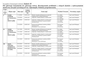 Szczegółowy harmonogram szkolenia: Zadanie 20 Od cyfrowego konsumenta do cyfrowego twórcy. Rozwiązywanie problemów z różnych dziedzin z wykorzystaniem metod oraz narzędzi wywodzących się z informatyki. Podstawy programowania. Grup a (num er) I II III Miejsce zajęć WODN KURSOR ul. Narutowicza 62 20-013 Lublin WODN KURSOR ul. Narutowicza 62 20-013 Lublin Szkoła Policealna Akademia ul. Hrubieszowska 37 Chełm Data zajęć Godziny zajęć (oddo) 11.10.2016 14:00-18:45 19.10.2016 14:00-18:45 25.10.2016 14:00-18:45 27.10.2016 Temat zajęć Metody i narzędzia informatyczne na zajęciach komputerowych i lekcjach informatyki Algorytmy i struktury danych w oczach ucznia Wykład /Ćwiczenia Prowadzący zajęcia mgr Leszek Prokopiak Algorytmy i struktury danych w oczach ucznia Przetwarzanie informacji za pomocą środków informatycznych 1h wykład 5h ćwiczenia 1h wykład 5h ćwiczenia 3h ćwiczenia 1h wykład 2h ćwiczenia 14:00-18:45 Przetwarzanie informacji za pomocą środków informatycznych Informatyka w życiu codziennym 2h ćwiczenia 1h wykład 3h ćwiczenia mgr Leszek Prokopiak 16.11.2016 14:00-18:45 14:00-18:45 21.11.2016 14:00-18:45 Algorytmy i struktury danych w oczach ucznia Przetwarzanie informacji za pomocą środków informatycznych 1h wykład 5h ćwiczenia 1h wykład 5h ćwiczenia 3h ćwiczenia 1h wykład 2h ćwiczenia mgr Leszek Prokopiak 17.11.2016 Metody i narzędzia informatyczne na zajęciach komputerowych i lekcjach informatyki Algorytmy i struktury danych w oczach ucznia 23.11.2016 14:00-18:45 Przetwarzanie informacji za pomocą środków informatycznych Informatyka w życiu codziennym 2h ćwiczenia 1h wykład 3h ćwiczenia mgr Leszek Prokopiak 05.10.2016 15:00-19:45 15:00-19:45 24.10.2016 15:00-19:45 Algorytmy i struktury danych w oczach ucznia Przetwarzanie informacji za pomocą środków informatycznych 1h wykład 5h ćwiczenia 1h wykład 5h ćwiczenia 3h ćwiczenia 1h . wykład 2h ćwiczenia mgr Leszek Prokopiak 06.10.2016 Metody i narzędzia informatyczne na zajęciach komputerowych i lekcjach informatyki Algorytmy i struktury danych w oczach ucznia 26.10.2016 15:00-19:45 Przetwarzanie informacji za pomocą środków informatycznych Informatyka w życiu codziennym 2h ćwiczenia 1h wykład 3h ćwiczenia mgr Leszek Prokopiak mgr Leszek Prokopiak mgr Leszek Prokopiak mgr Leszek Prokopiak mgr Leszek Prokopiak mgr Leszek Prokopiak mgr Leszek Prokopiak IV V VI VII WODN KURSOR 03.10.2016 ul. Partyzantów 9 04.10.2016 22-400 Zamość 15:00-19:45 17.10.2016 15:00-19:45 18.10.2016 15:00-19:45 15:00-19:45 WODN KURSOR 07.11.2016 ul. Partyzantów 9 08.11.2016 22-400 Zamość 15:00-19:45 14.11.2016 15:00-19:45 15.11.2016 15:00-19:45 WODN KURSOR O/Biała Podlaska ul. Narutowicza 66 WODN KURSOR O/Biała Podlaska ul. Narutowicza 66 15:00-19:45 18.10.2016 14:30 – 19:30 20.10.2016 14:30 – 19:30 26.10.2016 14:30 – 18:45 27.10.2016 14:30 – 20:15 03.11.2016 14:30 – 19:30 08.11.2016 14:30 – 19:30 15.11.2016 14:30 – 18:45 17.11.2016 14:30 – 20:15 Metody i narzędzia informatyczne na zajęciach komputerowych i lekcjach informatyki. Algorytmy i struktury danych w oczach ucznia. Algorytmy i struktury danych w oczach ucznia. Przetwarzanie informacji za pomocą środków informatycznych. Przetwarzanie informacji za pomocą środków informatycznych. Informatyka w życiu codziennym. Metody i narzędzia informatyczne na zajęciach komputerowych i lekcjach informatyki. Algorytmy i struktury danych w oczach ucznia. Algorytmy i struktury danych w oczach ucznia. Przetwarzanie informacji za pomocą środków informatycznych. Przetwarzanie informacji za pomocą środków informatycznych. Informatyka w życiu codziennym. Metody i narzędzia informatyczne na zajęciach komputerowych i lekcjach informatyki. Algorytmy i struktury danych w oczach ucznia Przetwarzanie informacji za pomocą środków informatycznych Algorytmy i struktury danych w oczach ucznia Informatyka w życiu codziennym Metody i narzędzia informatyczne na zajęciach komputerowych i lekcjach informatyki. Algorytmy i struktury danych w oczach ucznia Przetwarzanie informacji za pomocą środków informatycznych Algorytmy i struktury danych w oczach ucznia Informatyka w życiu codziennym 1 h wykład 5 h ćwiczenia 1 h wykład 5 h ćwiczenia 3 h ćwiczenia 1 h wykład 2 h ćwiczenia 2 h ćwiczenia 1 h wykład 3 h ćwiczenia 1 h wykład 5 h ćwiczenia 1 h wykład 5 h ćwiczenia 3 h ćwiczenia 1 h wykład 2 h ćwiczenia 2 h ćwiczenia 1 h wykład 3 h ćwiczenia 1 h wykład 5 h ćwiczenia 1 h wykład 5h ćwiczenia 1 h wykład 4 h ćwiczenia 3 h ćwiczenia 1 h wykład 3 h ćwiczenia 1 h wykład 5 h ćwiczenia 1 h wykład 5 h ćwiczenia 1 h wykład 4 h ćwiczenia 3 h ćwiczenia 1 h wykład 3 h ćwiczenia mgr Leszek Prokopiak mgr Leszek Prokopiak mgr Leszek Prokopiak mgr Leszek Prokopiak mgr Leszek Prokopiak mgr Leszek Prokopiak mgr Leszek Prokopiak mgr Leszek Prokopiak mgr Monika Gadomska Wiśniewska mgr Ryszard Dołęga mgr Monika Gadomska Wiśniewska mgr Ryszard Dołęga mgr Monika Gadomska Wiśniewska mgr Ryszard Dołęga mgr Monika Gadomska Wiśniewska mgr Ryszard Dołęga