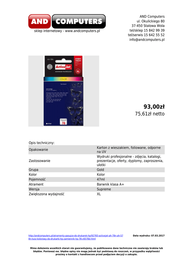 sklep internetowy - www.andcomputers.pl AND Computers ul. Okulickiego 80 37-450 Stalowa Wola tel/sklep 15 842 99 39 tel/serwis 15 642 55 52 [email protected] 93,00zł 75,61zł netto Opis techniczny: Opakowanie Zastosowanie Grupa Kolor Pojemność Atrament Wersja Zwiększona wydajność Karton z wieszakiem, foliowane, odporne na UV Wydruki profesjonalne - zdjęcia, katalogi, prezentacje, oferty, dyplomy, zaproszenia, ulotki Gold Kolor 47ml Barwnik klasa A+ Supreme XL http://andcomputers.pl/atramenty-pasujce-do-drukarek-hp/92783-activejet-ah-78n-ah-57 8n-tusz-kolorowy-do-drukarki-hp-zamiennik-hp-78-c6578d.html Data wydruku: 07.03.2017 Mimo dołożenia wszelkich starań nie gwarantujemy, że publikowane dane techniczne nie zawierają braków lub błędów. Ponieważ ew. błędne opisy nie mogą jednak być podstawą do roszczeń, w przypadku wątpliwości prosimy o kontakt z handlowcem przed podjęciem decyzji o zakupie. Pasuje do drukarek: Kod OEM www Kod Producenta DeskJet 916C, 920C, 920Cvr, 920Cxi, 930Photo, 930C, 932C, 934C, 935C, 940C, 940Cvr, 948C, 950, 952C, 955C, 959C, 960C, 960Cse, 960Cxi, 970C, 970Cse, 970Cxi, 980Cxi, 990C, 990Cse, 990Cxi, 995C, 1180C, 1220C, 1220Cse, 1220Cxi, 1280C, 3810, 3816, 3820,3822, HP 78 C6578D http://www.activejet.plwww AH-78N (AH-578N) http://andcomputers.pl/atramenty-pasujce-do-drukarek-hp/92783-activejet-ah-78n-ah-57 8n-tusz-kolorowy-do-drukarki-hp-zamiennik-hp-78-c6578d.html Data wydruku: 07.03.2017 Mimo dołożenia wszelkich starań nie gwarantujemy, że publikowane dane techniczne nie zawierają braków lub błędów. Ponieważ ew. błędne opisy nie mogą jednak być podstawą do roszczeń, w przypadku wątpliwości prosimy o kontakt z handlowcem przed podjęciem decyzji o zakupie.