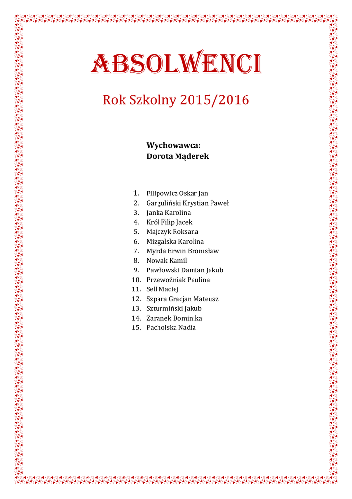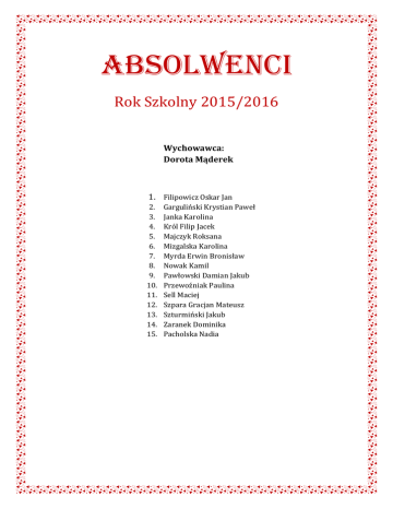 ABSOLWENCI Rok Szkolny 2015/2016 Wychowawca: Dorota Mąderek 1. Filipowicz Oskar Jan 2. 3. 4. 5. 6. 7. 8. 9. 10. 11. 12. 13. 14. 15. Garguliński Krystian Paweł Janka Karolina Król Filip Jacek Majczyk Roksana Mizgalska Karolina Myrda Erwin Bronisław Nowak Kamil Pawłowski Damian Jakub Przewoźniak Paulina Sell Maciej Szpara Gracjan Mateusz Szturmiński Jakub Zaranek Dominika Pacholska Nadia