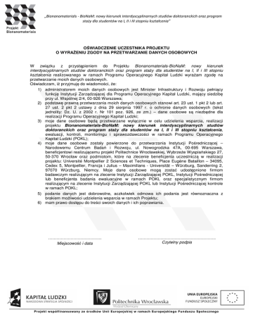 „Bionanomaterials - BioNaM: nowy kierunek interdyscyplinarnych studiów doktoranckich oraz program staży dla studentów na I, II i III stopniu kształcenia” OŚWIADCZENIE UCZESTNIKA PROJEKTU O WYRAŻENIU ZGODY NA PRZETWARZANIE DANYCH OSOBOWYCH W związku z przystąpieniem do Projektu Bionanomaterials-BioNaM: nowy kierunek interdyscyplinarnych studiów doktoranckich oraz program staży dla studentów na I, II i III stopniu kształcenia realizowanego w ramach Programu Operacyjnego Kapitał Ludzki wyrażam zgodę na przetwarzanie moich danych osobowych. Oświadczam, iż przyjmuję do wiadomości, że: 1) administratorem moich danych osobowych jest Minister Infrastruktury i Rozwoju pełniący funkcję Instytucji Zarządzającej dla Programu Operacyjnego Kapitał Ludzki, mający siedzibę przy ul. Wspólnej 2/4, 00-926 Warszawa; 2) podstawę prawną przetwarzania moich danych osobowych stanowi art. 23 ust. 1 pkt 2 lub art. 27 ust. 2 pkt 2 ustawy z dnia 29 sierpnia 1997 r. o ochronie danych osobowych (tekst jednolity: Dz. U. z 2002 r. Nr 101 poz. 926, ze zm.) – dane osobowe są niezbędne dla realizacji Programu Operacyjnego Kapitał Ludzki; 3) moje dane osobowe będą przetwarzane wyłącznie w celu udzielenia wsparcia, realizacji projektu Bionanomaterials-BioNaM: nowy kierunek interdyscyplinarnych studiów doktoranckich oraz program staży dla studentów na I, II i III stopniu kształcenia, ewaluacji, kontroli, monitoringu i sprawozdawczości w ramach Programu Operacyjnego Kapitał Ludzki (POKL); 4) moje dane osobowe zostały powierzone do przetwarzania Instytucji Pośredniczącej – Narodowemu Centrum Badań i Rozwoju, ul. Nowogrodzka 47A, 00-695 Warszawa, beneficjentowi realizującemu projekt Politechnice Wrocławskiej, Wybrzeże Wyspiańskiego 27, 50-370 Wrocław oraz podmiotom, które na zlecenie beneficjenta uczestniczą w realizacji projektu: Université Montpellier 2 Sciences et Techniques, Place Eugène Bataillon – 34095, Cedex 5, Montpellier, Francja i Julius – Maximilians - Universität – Würzburg, Sanderring 2, 97070 Würzburg, Niemcy. Moje dane osobowe mogą zostać udostępnione firmom badawczym realizującym na zlecenie Instytucji Zarządzającej POKL, Instytucji Pośredniczącej lub beneficjenta badania ewaluacyjne w ramach POKL oraz specjalistycznym firmom realizującym na zlecenie Instytucji Zarządzającej POKL lub Instytucji Pośredniczącej kontrole w ramach POKL; 5) podanie danych jest dobrowolne, aczkolwiek odmowa ich podania jest równoznaczna z brakiem możliwości udzielenia wsparcia w ramach Projektu; 6) mam prawo dostępu do treści swoich danych i ich poprawiania. ……………………………….. Miejscowość i data ………………………………………………. Czytelny podpis Projekt współfinansowany ze środków Unii Europejskiej w ramach Europejskiego Funduszu Społecznego