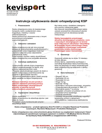 Tel. 0 601 377 054 [email protected] www.kevisport.pl Tel. 0 721 127 721 [email protected] www.sztormiak.eu Instrukcja użytkowania deski ortopedycznej KSP Myć letnią wodą z dodatkiem detergentu przy pomocy nasączonej gąbki. Aby dokonać dezynfekcji/sterylizacji należy używać powszechnie stosowanych płynów przeznaczonych do sterylizacji sprzętu medycznego. 1. Przeznaczenie Deska ortopedyczna służy do bezpiecznego transportu osób z podejrzeniem urazu kręgosłupa, miednicy i urazów wielonarządowych. Deska powinna być stosowana wraz z innymi pomocniczymi przyrządami unieruchamiającymi. 2. Zalecenia i ostrzeżeni Deska ortopedyczna tak jak inne przyrząd służące do unieruchamiania poszkodowanych z podejrzeniem urazu kręgosłupa może być używana wyłącznie przez odpowiednio przeszkolone osoby. Przed każdym użyciem należy skontrolować deskę ortopedyczną oraz pozostałe akcesoria. 3. Instrukcja użytkowania -Unieruchomić odcinek szyjny kręgosłupa. -Ułożyć poszkodowanego na desce, przy pomocy odpowiedniej ilości osób. -Przypiąć poszkodowanego pasami do deski w sposób wykluczający przemieszczenie się pacjenta w jakimkolwiek kierunku. -Za pomocą stabilizatora głowy ustalić pozycję głowy pacjenta na desce ortopedycznej. Niniejsza instrukcja nie jest poradą w zakresie udzielania pierwszej pomocy. Należy przestrzegać obowiązujących procedur w zakresie technik unieruchamiania poszkodowanych. 4. Czyszczenie i dezynfekcja Wyrób niesterylny. Deska ortopedyczna nie absorbuje płynów i jest łatwa do mycia. Po każdym użyciu konieczne jest umycie i dezynfekcja deski. Należy bezwzględnie przestrzegać aktualnie obowiązujących przepisów, norm i wytycznych obowiązujących na terenie kraju dotyczących sterylizacji i dezynfekcji. W przypadku mycia chemicznego należy bezwzględnie przestrzegać wskazówek producenta środka chemicznego. Przestrzegać czasu i koncentracji. 5. Gwarancja Gwarancji udziela się na okres 12 miesięcy od daty zakupu. Zmiany barwy, zaplamienia wynikające z normalnej eksploatacji natury kosmetycznej, które nie wpływają na walory eksploatacyjne deski ortopedycznej są wyłączone z okresu gwarancji. 6. Dane techniczne • Długość 182 cm. • Szerokość 45 cm. • Wysokość 6,5 cm. • Waga 7,2 kg. • Nośność 159 kg. • Wykonana z tworzywa sztucznego, zmywalna. • Przepuszczalna dla promieni X, MRI, CT. • Mocowanie pasów 7 na stronę. • Odległość uchwytów od podłoża 3,5 cm. • Zwężenie końca dystalnego. • Dodatnia pływalność. • Uchwyty transportowe umożliwiają wygodny i bezpieczny uchwyt w rękawicach. • Kompatybilna z większością stabilizatorów głowy. Deska ortopedyczna – produkt zgłoszony (Kod PL/CA01) w Urzędzie Rejestracji Produktów Leczniczych, Wyrobów Medycznych i Produktów Biobójczych. Deska ortopedyczna oraz unieruchomienie głowy klockowe są urządzeniami medycznymi Class1 odpowiadającymi zasadniczym wymogom opisanym w aneksie I i VII (Medical Device Directiv) do Dyrektywy Rady 93/42/EWG (z uwzględnieniem 2007/47/EC). Producent P.R.China 04-063 WARSZAWA, UL. BIAŁOWIESKA 7/9 Tel. 0 22 875 04 34, fax 0 22 875 04 33 NIP 521-206-18-94