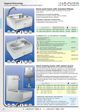 Hygiene Technology Técnica para la higiene · Urządzenia do zachowania higieny Hand wash basin with standard fittings knee operation, chromium-plated, swing taps, hot and cold mixer valves. Lavamanos con accesorios estándar, accionamiento por pedal, cromado, grifos orientable, válvulas mezcladoras de frío y caliente. Umywalka w wykonaniu standardowym z włącznikiem kolanowym z ruchoma‚ wylewka‚ z mieszalnikiem wody ciepłej-zimnej. Basin dimensions · Dim. del fregadero · Wymiary umywalki A max. 50% Art.-Nr. A 470 x 410 x 240 mm 370 x 340 x 150 mm ~6,2 kg 500210 B 550 x 440 x 250 mm 520 x 310 x 150 mm ~6,4 kg 500310 At additional cost · A coste adicional · Za dopłatą 500414 Thermostatic mixing battery Batería termostática Z mieszalnikiem - termostatem B max. 50% Sensor with signal delay and switching-off safety device (after 2 min. approx.) Sensor con señal de retraso y accesorio de desconexión de seguridad (después de 2 minutos aproximadamente) Fotokomórka wyłączająca - wyregulowana na 2 min. 500413 Tap with sensor, mains voltage, 230V Grifo con sensor, conexión a la red principal 230V Fotokomórka przy wylewce, praca w sieci, 230 V 500416 Tap with sensor, mains voltage/battery Grifo con sensor, conexión a la red principal/batería Fotokomórka przy wylewce, zasilanie sieciowo / bateryjne 500417 Splash guard for 5000210 Pantalla antisalpicaduras para 500210 Ścianka chroniąca przed opryskiwaniem dla Art. 500210 500420-470 Splash guard for 5000310 Pantalla antisalpicaduras para 500310 Ścianka chroniąca przed opryskiwaniem dla Art. 500310 500420-550 Hand washing basin with splash guard with fixed stainless steel tap. Choice of sensor or knee operation, cold and warm mixer tap. Optional: pedestal (A) or rear wall plate (B) Lavamanos con pantalla antisalpicaduras y desagüe fijo de acero fino. A elección con sensor o accionamiento por pedal, válvula de mezcla de agua fría y caliente. Opcional: con patas (A), placa trasera (B) para colgar. Umywalka ze ścianką chroniącą przed opryskiwaniem avec écoulez wylewką ze stali nierdzewnej na fotokomórkę lub włącznik kolanowy, regulacja temperatury wody. Opcje: Na stopach (A), z przytwierdzeniem do ściany (B). Art.-Nr. 450 x 450 x 240/655 mm 355 x 330 x 160 mm ~11,0 kg 500510-SN A 450 x 450 x 240/655 mm 355 x 330 x 160 mm ~11,0 kg 500510-SB 450 x 450 x 240/655 mm 355 x 330 x 160 mm ~11,0 kg 500510-K A 150 x 150 x 600 mm ---------- ~12,0 kg 500511-1 B 497 x 625 x 1,25 mm ---------- ~4,2 kg 500512-1 Technical data · Datos técnicos · Dane techniczne SN: Main voltage · Tensión de la red · Zasilanie: 230 V / 50 Hz SB: Battery · Batería · Baterie: Protection system · Sistema de protección · Zabezpieczenie: 1 x 6 V Li Ion IP 65 Water inlet · Toma de agua · Średnica rury doprowadzającej wodę: max. 50% 20 Water outlet · Desagüe · Średnica rury oprowadzającej wodę: +49 54 07 / 890-0 · +49 54 07 / 890-100 R 1/2 “ R 1 1/2“