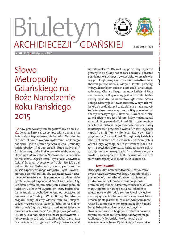 Nr 01 (360) • 02 stycznia 2016 Słowo Metropolity Gdańskiego na Boże Narodzenie Roku Pańskiego 2015 się człowiekiem”. Objawił się po to, aby „zgładzić grzechy” (1 J 3, 5), aby nas zbawić i odkupić, pozostać pośród nas w Eucharystii, w Kościele, w sercach wierzących. Przyłączmy się do radości świadków tego zbawczego wydarzenia, Maryi i Józefa, pasterzy, którzy „do Betlejem spieszno pobieżeli”, anielskiego, radosnego Gloria… Czego nas uczy Betlejem! Uczy nas prawdy, ze Bóg obecny jest w kościele. Matce naszej, posłudze Sakramentów, głoszeniu Słowa Bożego. Obecny jest Nowonarodzony w czynach miłosierdzia co do duszy i co do ciała, ale nade wszystko Boże Narodzenie uczy nas, ze Bóg powinien być obecny w naszym życiu. Bowiem „Narodzenie Jezusa w Betlejem nie jest faktem, który można uznać za zamkniętą przeszłość. Przed Nim staje bowiem cała ludzka historia: Jego obecność oświeca naszą teraźniejszość i przyszłość świata. On jest «żyjącym » (por. Ap 1, 18), Tym « Który jest, i Który był i Który przychodzi» (Ap 1, 4). Przed Nim zgina się każde kolano istot niebieskich, ziemskich i podziemnych, a wszelki język wyznaje, że On jest Panem (por. Flp 2, 10-11). Spotykając Chrystusa, każdy człowiek odkrywa tajemnice własnego życia!” - to słowa św. Jana Pawła II, zaczerpnięte z bulli Incarnationis misterium ogłaszającej Wielki Jubileusz Roku 2000. Z nów przeżywamy ten błogosławiony dzień, kiedy naszą katolicką wspólnotę wiary, a wraz z nią świat cały, obiega radosna wiadomość o Narodzeniu Pańskim. O tym zbawczym wydarzeniu, na którego nadejście - jak to ujmuje ojczysta kolęda - „mnodzy ludzie ubodzy (...) długo czekali, długo wzdychali / Aż niebo rozgorzało; Piekło zawarte, niebo otwarte, Słowo się Ciałem stało”. W Noc Narodzenia nadeszła pełnia czasu. „Ojciec zesłał Syna jako Zbawiciela świata” (1 J 4, 14). Urzeczywistnił obietnice, jakie dał ludowi Starego Testamentu, oczekującemu na nadejście zapowiedzianego Mesjasza, „Syna Dawida”, którego Bóg miał posłać, aby zapoczątkować nastanie Jego Królestwa. A miejscem Jego narodzin miało być Betlejem, jak zapowiadał Prorok Michaesz: „A ty, Betlejem, Efrata, najmniejsze jesteś wśród plemion judzkich! Z ciebie mi wyjdzie Ten, który będzie władał w Izraelu, a pochodzenie Jego od początku, od dni wieczności” (Mi 5,1). W noc Bożego Narodzenia drogami wiary idziemy właśnie tam, do Betlejem, „gdzie mizerna cicha, stajenka licha pełna niebieskiej chwały”, gdzie „leżący, przed nami śpiący, w promieniach Jezus mały”. Syn „Boga żywego” (Mt 16, 16), który „dla nas, ludzi, i dla naszego zbawienia ¬jak wyznajemy w Credo - zstąpił z nieba. I za sprawą Ducha Świętego przyjął ciało z Maryi Dziewicy i stał Centrum Informacyjne Archidiecezji Gdańskiej www.gdansk.gosc.pl ISSN 2083-4403 Umiłowani! 1 Biuletyn Archidiecezji Gdańskiej 01 stycznia 2016 Dzieciątku, dziś nam narodzonemu, przynieśmy owoce naszej adwentowej drogi. Naszych refleksji, postanowień, namysłu. Wpatrzeni w ciemność grudniowej nocy, która tego dnia „w jasności promienistej brodzi”, odsłońmy, wobec Jezusa, Syna Maryi, tajemnice naszego życia, tak jak nam to zalecał nasz wielki rodak, św. Jan Paweł II. Niech w nie spojrzy. Niech w to, co w nim złe naprawi. Niech umocni pobłogosławi to, co w naszym życiu dobre. A czas ku temu jest w tym roku szczególny. Radość Świąt Bożego Narodzenia, obchodzonych – chwała nam za to - z bogatym sztafażem polskich zwyczajów, nakłada się na bieg Nadzwyczajnego Jubileuszu Miłosierdzia. Proklamował go w Kościele powszechnym Ojciec Święty Franciszek w Biuletyn Archidiecezji Gdańskiej 01 stycznia 2016 Centrum Informacyjne Archidiecezji Gdańskiej www.gdansk.gosc.pl nr 01 (360) uroczystość Niepokalanego Poczęcia Najświętszej Maryi Panny, tej, którą Bóg wybrał „z miłości przed założeniem świata, aby była święta i nieskalna przed Jego obliczem” (por. Ef 1,4) i stała się ziemską Matka Bożego Syna. Podczas Nadzwyczajnego Jubileuszu Miłosierdzia, który zakończy się w uroczystość liturgiczną Jezusa Chrystusa Króla Wszechświata 20 listopada 2016 roku, mamy w szczególny sposób kontemplować tajemnicę Miłosierdzia Bożego. Jest ona drogą, „która - jak to ujął Ojciec Święty Franciszek w bulli Misericordiae vultus - łączy Boga z człowiekiem, ponieważ otwiera serce na nadzieję bycia kochanym na zawsze, pomimo ograniczeń naszego grzechu”. Jubileusz Miłosierdzia ma w nas utwierdzać i pogłębiać prawdę o tym, że Bóg Ojciec jest „miłosierny i litościwy, cierpliwy, bogaty w łaskę i wierność” (Wj 34, 6), także o tym, że swe miłosierdzie objawił w tajemnicy Chrystusa, który jest „obliczem miłosierdzia Ojca”. Bowiem kto widzi Syna, widzi też i Ojca (por. J 14, 9). Ten rok wzywa nas – wspólnotę Kościoła i wspólnotę narodu - do podjęcia poważnego, do głębi przemyślnego i konsekwentnego wysiłku, którego celem jest nasze nawrócenie, wyznanie grzechów, pokuta, skrucha, postanowienie poprawy, zadośćuczynienie za doznane zło. Nadzwyczajny Jubileusz Miłosierdzia to wezwanie do przemiany naszych serc, do porządkowania sumień, do duchowego wzrostu. To także czas szczególnej łaski, jaką ofiaruje nam nasza pełna miłosierdzia i dobroci Matka – Kościół Katolicki i Chrystusowy Namiestnik, Ojciec Święty Franciszek. To z Jego woli Porta sancta - Drzwi Święte, otwierane do tej pory z okazji Roku Jubileuszowego w czterech rzymskich bazylikach, zostały uroczyście otwarte w katedrach biskupich, w wybranych świątyniach w całym Kościele powszechnym. Także w naszej oliwskiej katedrze, także w siedemnastu innych świątyniach i kaplicach gdańskiej archidiecezji. Drzwi Święte - Bramy Miłosierdzia otwarte ku Bogu, który przebacza i ofiaruję nadzieję cz
