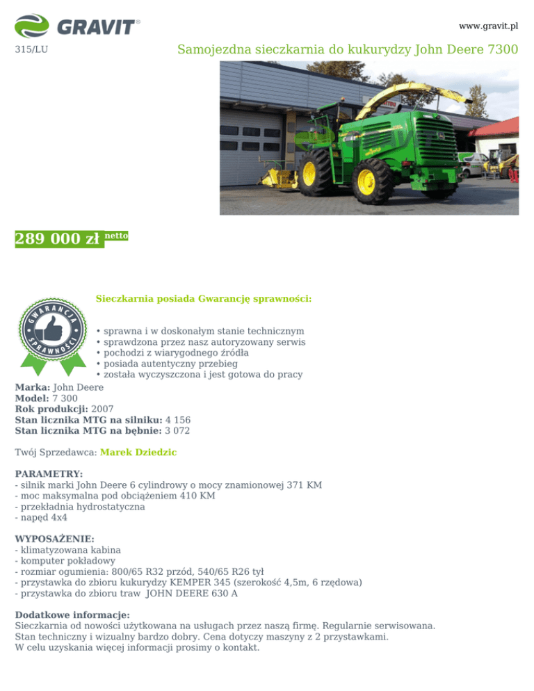 www.gravit.pl Samojezdna sieczkarnia do kukurydzy John Deere 7300 315/LU 289 000 zł netto Sieczkarnia posiada Gwarancję sprawności: • sprawna i w doskonałym stanie technicznym • sprawdzona przez nasz autoryzowany serwis • pochodzi z wiarygodnego źródła • posiada autentyczny przebieg • została wyczyszczona i jest gotowa do pracy Marka: John Deere Model: 7 300 Rok produkcji: 2007 Stan licznika MTG na silniku: 4 156 Stan licznika MTG na bębnie: 3 072 Twój Sprzedawca: Marek Dziedzic PARAMETRY: - silnik marki John Deere 6 cylindrowy o mocy znamionowej 371 KM - moc maksymalna pod obciążeniem 410 KM - przekładnia hydrostatyczna - napęd 4x4 WYPOSAŻENIE: - klimatyzowana kabina - komputer pokładowy - rozmiar ogumienia: 800/65 R32 przód, 540/65 R26 tył - przystawka do zbioru kukurydzy KEMPER 345 (szerokość 4,5m, 6 rzędowa) - przystawka do zbioru traw JOHN DEERE 630 A Dodatkowe informacje: Sieczkarnia od nowości użytkowana na usługach przez naszą firmę. Regularnie serwisowana. Stan techniczny i wizualny bardzo dobry. Cena dotyczy maszyny z 2 przystawkami. W celu uzyskania więcej informacji prosimy o kontakt.