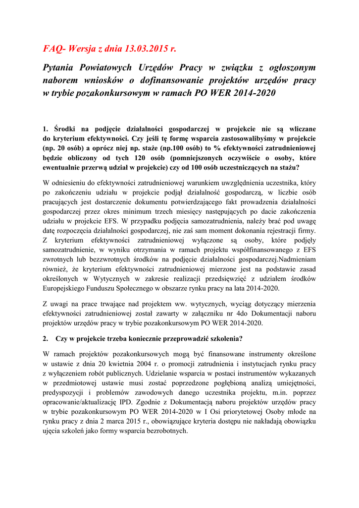 FAQ- Wersja z dnia 13.03.2015 r. Pytania Powiatowych Urzędów Pracy w związku z ogłoszonym naborem wniosków o dofinansowanie projektów urzędów pracy w trybie pozakonkursowym w ramach PO WER 2014-2020 1. Środki na podjęcie działalności gospodarczej w projekcie nie są wliczane do kryterium efektywności. Czy jeśli tę formę wsparcia zastosowalibyśmy w projekcie (np. 20 osób) a oprócz niej np. staże (np.100 osób) to % efektywności zatrudnieniowej będzie obliczony od tych 120 osób (pomniejszonych oczywiście o osoby, które ewentualnie przerwą udział w projekcie) czy od 100 osób uczestniczących na stażu? W odniesieniu do efektywności zatrudnieniowej warunkiem uwzględnienia uczestnika, który po zakończeniu udziału w projekcie podjął działalność gospodarczą, w liczbie osób pracujących jest dostarczenie dokumentu potwierdzającego fakt prowadzenia działalności gospodarczej przez okres minimum trzech miesięcy następujących po dacie zakończenia udziału w projekcie EFS. W przypadku podjęcia samozatrudnienia, należy brać pod uwagę datę rozpoczęcia działalności gospodarczej, nie zaś sam moment dokonania rejestracji firmy. Z kryterium efektywności zatrudnieniowej wyłączone są osoby, które podjęły samozatrudnienie, w wyniku otrzymania w ramach projektu współfinansowanego z EFS zwrotnych lub bezzwrotnych środków na podjęcie działalności gospodarczej.Nadmieniam również, że kryterium efektywności zatrudnieniowej mierzone jest na podstawie zasad określonych w Wytycznych w zakresie realizacji przedsięwzięć z udziałem środków Europejskiego Funduszu Społecznego w obszarze rynku pracy na lata 2014-2020. Z uwagi na prace trwające nad projektem ww. wytycznych, wyciąg dotyczący mierzenia efektywności zatrudnieniowej został zawarty w załączniku nr 4do Dokumentacji naboru projektów urzędów pracy w trybie pozakonkursowym PO WER 2014-2020. 2. Czy w projekcie trzeba koniecznie przeprowadzić szkolenia? W ramach projektów pozakonkursowych mogą być finansowane instrumenty określone w ustawie z dnia 20 kwietnia 2004 r. o promocji zatrudnienia i instytucjach rynku pracy z wyłączeniem robót publicznych. Udzielanie wsparcia w postaci instrumentów wykazanych w przedmiotowej ustawie musi zostać poprzedzone pogłębioną analizą umiejętności, predyspozycji i problemów zawodowych danego uczestnika projektu, m.in. poprzez opracowanie/aktualizację IPD. Zgodnie z Dokumentacją naboru projektów urzędów pracy w trybie pozakonkursowym PO WER 2014-2020 w I Osi priorytetowej Osoby młode na rynku pracy z dnia 2 marca 2015 r., obowiązujące kryteria dostępu nie nakładają obowiązku ujęcia szkoleń jako formy wsparcia bezrobotnych. Jednakże należy podkreślić, że zgodnie z Instrukcją wypełniania wniosku o dofinansowanie projektu pozakonkursowego powiatowego urzędu pracy... PUP-y zobowiązane są do„(…)wybrania wszystkich wskaźników produktu i rezultatu określonych dla danego poddziałania w SzOP.”, w tym również rezultatu „ Liczba osób poniżej 30 lat, które uzyskały kwalifikacje po opuszczeniu Programu”. Kwalifikacje rozumie się jako „(…)formalny wynik oceny i walidacji, który uzyskuje się w sytuacji, kiedy właściwy organ uznaje, że dana osoba osiągnęła efekty uczenia się spełniające określone standardy”. W związku z tym istnieje obligo do ujęcia szkoleń w projekcie. WUP w tym roku nie narzuca udziału procentowego osób objętych tą formą wsparcia, co nie znaczy, że w kolejnych latach nie będzie to praktykowane. 3. Czy umowa o dofinansowanie projektu będzie podpisana na rok 2015 czy od razu na cały okres realizacji projektu? Zgodnie z dokumentacją naboru projektów urzędów pracy w trybie pozakonkursowym PO WER 2014-2020 projekt realizowany jest od 1 stycznia 2015 r. – 31 grudnia 2015 r. W związku z powyższym umowa podpisywana jest na okres realizacji projektu w danym roku tj. od 1 stycznia 2015r. do 31 grudnia 2015r. 4. W projekcie można zatrudnić w ramach kosztów pośrednich (do 3% kosztów bezpośrednich projektu) osobę do zarządzania projektem. Czy ta osoba będzie mogła kontynuować zatrudnienie w kolejnych latach realizacji projektu? Zgodnie z powyższym projekt realizowany jest w okresie od 1 stycznia 2015 r. – 31 grudnia 2015 r., zatem osoba zatrudniona do zarządzania projektem zatrudniona jest na okres realizacji projektu w danym roku. 5. Czy aby wypłacić wynagrodzenie z kosztów pośrednich (3%) to można tego dokonać tylko wtedy, gdy zostały poniesione w danym miesiącu, wydatki z kosztów bezpośrednich. Czy wydatki w ramach kosztów pośrednich można ponosić tylko do 3% wydatków w danym miesiącu? W przypadku projektów pozakonkursowych PUP, koszty pośrednie to koszty administracyjne związane z zarządzaniem projektem, o których mowa w art. 9 ust. 2 d ustawy o promocji zatrudnienia (…).Wnioskodawca nie ma możliwości wykazania żadnej z kategorii kosztów pośrednich ujętych w ww. art. ustawy o promocji zatrudnienia (…) w kosztach bezpośrednich projektu. W tej części wnioskodawca wpisuje w polu % kosztów pośrednich w ramach projektu, jaki planuje przeznaczyć na zarządzanie/obsługę projektu; przy czym zgodnie z art. 9 ust. 2d ustawy o promocji zatrudnienia (…) koszty te nie mogą stanowić więcej niż 3% kwoty przyznanej ze środków Funduszu Pracy będących w dyspozycji samorządu województwa na realizację projektu. System sam wylicza na podstawie określonej wartości procentowej, wartość w złotych w ramach projektu jaka będzie przeznaczana na koszty pośrednie. W związku z tym, iż Beneficjent konstruuje założenia budżetowe na cały rok realizacji projektu, koszty pośrednie wyliczane są w skali całego roku. Beneficjent sam decyduje, jak będzie wydatkował w danym miesiącu koszty pośrednie, niezależnie od wydatków poniesionych w danym miesiącu z kosztów bezpośrednich. Suma poniesionych kosztó