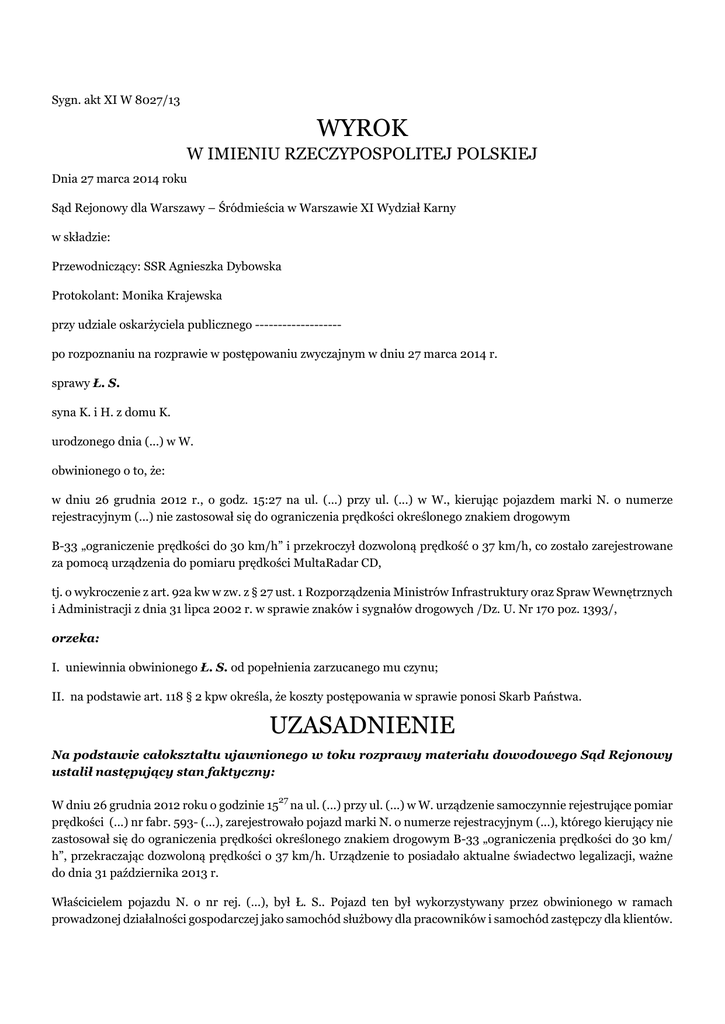Sygn. akt XI W 8027/13 WYROK W IMIENIU RZECZYPOSPOLITEJ POLSKIEJ Dnia 27 marca 2014 roku Sąd Rejonowy dla Warszawy – Śródmieścia w Warszawie XI Wydział Karny w składzie: Przewodniczący: SSR Agnieszka Dybowska Protokolant: Monika Krajewska przy udziale oskarżyciela publicznego ------------------po rozpoznaniu na rozprawie w postępowaniu zwyczajnym w dniu 27 marca 2014 r. sprawy Ł. S. syna K. i H. z domu K. urodzonego dnia (...) w W. obwinionego o to, że: w dniu 26 grudnia 2012 r., o godz. 15:27 na ul. (...) przy ul. (...) w W., kierując pojazdem marki N. o numerze rejestracyjnym (...) nie zastosował się do ograniczenia prędkości określonego znakiem drogowym B-33 „ograniczenie prędkości do 30 km/h” i przekroczył dozwoloną prędkość o 37 km/h, co zostało zarejestrowane za pomocą urządzenia do pomiaru prędkości MultaRadar CD, tj. o wykroczenie z art. 92a kw w zw. z § 27 ust. 1 Rozporządzenia Ministrów Infrastruktury oraz Spraw Wewnętrznych i Administracji z dnia 31 lipca 2002 r. w sprawie znaków i sygnałów drogowych /Dz. U. Nr 170 poz. 1393/, orzeka: I. uniewinnia obwinionego Ł. S. od popełnienia zarzucanego mu czynu; II. na podstawie art. 118 § 2 kpw określa, że koszty postępowania w sprawie ponosi Skarb Państwa. UZASADNIENIE Na podstawie całokształtu ujawnionego w toku rozprawy materiału dowodowego Sąd Rejonowy ustalił następujący stan faktyczny: W dniu 26 grudnia 2012 roku o godzinie 1527 na ul. (...) przy ul. (...) w W. urządzenie samoczynnie rejestrujące pomiar prędkości (...) nr fabr. 593- (...), zarejestrowało pojazd marki N. o numerze rejestracyjnym (...), którego kierujący nie zastosował się do ograniczenia prędkości określonego znakiem drogowym B-33 „ograniczenia prędkości do 30 km/ h”, przekraczając dozwoloną prędkości o 37 km/h. Urządzenie to posiadało aktualne świadectwo legalizacji, ważne do dnia 31 października 2013 r. Właścicielem pojazdu N. o nr rej. (...), był Ł. S.. Pojazd ten był wykorzystywany przez obwinionego w ramach prowadzonej działalności gospodarczej jako samochód służbowy dla pracowników i samochód zastępczy dla klientów. Ł. S. od września 2012 r. przebywał za granicą (w dniu 2 września 2012 r. przekroczył granicę Serbii). Do Polski obwiniony wrócił w styczniu 2013 r. Zdjęcie wykonane przez urządzenie samoczynnie rejestrujące pomiar prędkości (...) w dniu 26 grudnia 2012 roku o godzinie 1527 na ul. (...) nie zawiera wizerunku obwinionego. Powyższy stan faktyczny Sąd ustalił na podstawie: wyjaśnień obwinionego (k. 50), notatki urzędowej (k. 1), zdjęcia (k. 4), świadectwa z legalizacji (k. 5), kserokopii wniosku o wydanie dowodu osobistego (k. 16). Sąd zważył, co następuje : Obwiniony Ł. S. nie przyznał się do popełnienia zarzucanego mu czynu. Wyjaśnił, iż w dniu 26 grudnia 2012 r., nie mógł prowadzić samochodu marki N. o numerze rejestracyjnym (...), ponieważ w tym czasie przebywał za granicą. Samochód marki N. był zaś wykorzystywany do celów prowadzonej przez niego działalności gospodarczej jako samochód służbowy dla pracowników i samochód zastępczy dla klientów. Ponadto wyjaśnił, że nie rozpoznaje osoby na zdjęciu wykonanym przez urządzenie samoczynnie rejestrującym pomiar prędkości. Sąd uznał wyjaśnienia obwinionego w całości za wiarygodne. Wyjaśnienia obwinionego były przy tym spójne, konsekwentne i logiczne i brak było jakichkolwiek przeciwdowodów prawdziwość tych wyjaśnień podważających. W tym miejscu należy wskazać, że Sąd nie kwestionuje wiarygodności dowodów dołączonych do wniosku o ukaranie, tj. notatek urzędowych (w tym dokonanych w oparciu o prowadzone rejestry i bazy), świadectwa legalizacji, wniosku o wydanie dowodu osobistego wraz ze zdjęciem czy jakości zdjęcia wykonanego przez urządzenie M.. Potwierdzają one jedyne fakt przekroczenie dopuszczalnej prędkości przez kierującego pojazdem marki N. nr rej (...), to, że obwiniony był właścicielem tego pojazdu, a także, że złożył w kwietniu 2005 r. wniosek o wydanie dowodu osobistego. Dowody te są jednak niewystarczające do podważenia wiarygodności wyjaśnień obwinionego i nie pozwalają na przypisanie mu sprawstwa wykroczenia z art. 92a kw. Stwierdzić trzeba, że wyjaśnienia obwinionego odnośnie przebywania przez niego poza granicami kraju w okresie od września 2012 r. do stycznia 2013 r. potwierdzają pieczęcie w paszporcie, który został przez obwinionego okazany w toku rozprawy (w tym pieczęć z dnia 2 września 2012 r. stwierdzająca przekroczenie w tym dniu granic Unii Europejskiej). Za wiarygodne uznać należy także wyjaśnienia obwinionego odnośnie tego, że nie rozpoznaje się on na zdjęciu wykonanym przez urządzenie samoczynnie rejestrując pomiar prędkości. W tym zakresie wyjaśnień obwinionego nie może skutecznie podważyć wynik porównania zdjęć z k. 4 i k. 16. Stanowisko oskarżyciela publicznego, który skierował przeciwko obwinionemu wniosek o ukaranie opierało się wyłącznie o fakt, iż obwiniony jest właścicielem pojazdu marki N. nr rej (...) (który to fakt nie był w ogóle sporny w niniejszym postępowaniu) oraz o założenie, że osoba, której wizerunek został utrwalony na zdjęciu na k. 4, to ta sama osoba, której zdjęcie znajduje się na k. 16, czyli obwiniony. Sąd zwraca uwagę, że zdjęcie obwinionego wykonane dla celów uzyskania dowodu osobistego pochodzi najpóźniej z kwietnia 2005 r. (data złożenia wniosku o wydanie dowodu osobistego), a zatem sprzed ponad 8 lat przed zdarzeniem objętym wnioskiem o ukaranie w niniejszej sprawie. Pogłębiona analiza obu zdjęć, nawet przy uwzględnieniu nieuniknionych zmian w wyglądzie człowieka na przestrzeni około 8 lat, prowadzi do wniosku, że zdjęcia te nie zawierają wizerunku tej samej osoby, co zdjęcie na k. 4. Sąd uznał przy tym wyjaśnienia obwinionego w tej kwestii za wiarygodne, mając ta