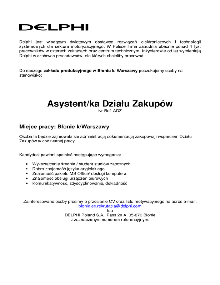 Delphi jest wiodącym światowym dostawcą rozwiązań elektronicznych i technologii systemowych dla sektora motoryzacyjnego. W Polsce firma zatrudnia obecnie ponad 4 tys. pracowników w czterech zakładach oraz centrum technicznym. Inżynierowie od lat wymieniają Delphi w czołówce pracodawców, dla których chcieliby pracować. Do naszego zakładu produkcyjnego w Błoniu k/ Warszawy poszukujemy osoby na stanowisko: Asystent/ka Działu Zakupów Nr Ref. ADZ Miejce pracy: Błonie k/Warszawy Osoba ta będzie zajmowała sie administracją dokumentacją zakupową i wsparciem Działu Zakupów w codziennej pracy. Kandydaci powinni spełniać następujące wymagania: • • • • • Wykształcenie średnie / student studiów zaocznych Dobra znajomość języka angielskiego Znajomość pakietu MS Office/ obsługi komputera Znajomość obsługi urządzeń biurowych Komunikatywność, zdyscyplinowanie, dokładność Zainteresowane osoby prosimy o przesłanie CV oraz listu motywacyjnego na adres e-mail: [email protected] lub DELPHI Poland S.A., Pass 20 A, 05-870 Błonie z zaznaczonym numerem referencyjnym.