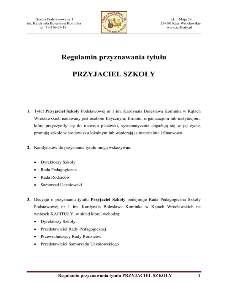 Szkoła Podstawowa nr 1 im. Kardynała Bolesława Kominka tel. 71-316-65-18 ul. 1 Maja 59, 55-080 Kąty Wrocławskie www.sp1katy.pl Regulamin przyznawania tytułu PRZYJACIEL SZKOŁY 1. Tytuł Przyjaciel Szkoły Podstawowej nr 1 im. Kardynała Bolesława Kominka w Kątach Wrocławskich nadawany jest osobom fizycznym, firmom, organizacjom lub instytucjom, które przyczyniły się do rozwoju placówki, systematycznie angażują się w jej życie, promują szkołę w środowisku lokalnym lub wspierają ją materialnie i finansowo. 2. Kandydatów do przyznania tytułu mogą wskazywać: Dyrektorzy Szkoły Rada Pedagogiczna Rada Rodziców Samorząd Uczniowski 3. Decyzję o przyznaniu tytułu Przyjaciel Szkoły podejmuje Rada Pedagogiczna Szkoły Podstawowej nr 1 im. Kardynała Bolesława Kominka w Kątach Wrocławskich na wniosek KAPITUŁY, w skład której wchodzą: Dyrektorzy Szkoły Przedstawiciel Rady Pedagogicznej Przewodniczący Rady Rodziców Przedstawiciel Samorządu Uczniowskiego Regulamin przyznawania tytułu PRZYJACIEL SZKOŁY 1 Szkoła Podstawowa nr 1 im. Kardynała Bolesława Kominka tel. 71-316-65-18 ul. 1 Maja 59, 55-080 Kąty Wrocławskie www.sp1katy.pl 4. Nadanie honorowego tytułu Przyjaciel Szkoły odbywa się podczas uroczystości szkolnych. 5. Nominowani zostają zaproszeni telefonicznie lub listownie na uroczystość wręczenia tytułu. 6. Aktu wręczenia dokonuje Dyrektor Szkoły lub Wicedyrektor Szkoły. 7. Przyjaciel Szkoły zostaje nagrodzony pamiątkową statuetką oraz wpisem na stronie internetowej szkoły www.sp1katy.pl 8. Regulamin wchodzi w życie z dniem 25.03.2014 r. Regulamin przyznawania tytułu PRZYJACIEL SZKOŁY 2