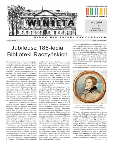 QU Z\GDQLH MXELOHXV]RZH 3 , 6 0 2 % , % / , 2 7 ( . , 5 $ & = < 6 . , & + Rok XVIII ISSN 1509–6343 Jubileusz 185-lecia Biblioteki RaczyĔskich „PoniewaĪ nie było w tej czĊĞci kraju publicznego ksiĊgozbioru, który by dla nas i nastĊpców przechowywał skarby dziejopisarstwa i piĞmiennictwa ojczystego, krzewił przy tym zamiłowanie do nich i ułatwiał prace i badania na tym polu, stworzył RaczyĔski taki zakład, który krocie kosztował” – napisał współczesny hrabiemu Marceli Motty w Przechadzkach po mieĞcie. ZałoĪenie w Poznaniu polskiej biblioteki publicznej w warunkach zaboru pruskiego i zapewnienie jej trwałych Ğrodków utrzymania było przedsiĊwziĊciem niełatwym i kosztownym. Silna motywacja musiała zatem kierowaü Edwardem RaczyĔskim, który dzieło to zrealizował osobistym wysiłkiem i własnym nakładem finansowym. Jest oczywiste, Īe bez impulsów wypływających z jego postawy patriotycznej i troski o sprawy narodowe trudno byłoby o tak wielką ofiarnoĞü i zaangaĪowanie. WĞród wielu wzbudzających podziw dokonaĔ hrabiego Edwarda, ufundowanie Biblioteki stało siĊ faktem o najwiĊkszej doniosłoĞci społecznej. JuĪ w I połowie XIX w. była to – rzec moĪna – demokratyczna instytucja kultury, dostĊpna dla kaĪdego „bez róĪnicy osób”, czyli bez wzglĊdu na pochodzenie społeczne, wykształcenie, religiĊ i narodowoĞü. W czasach zaborów stanowiła jeden z najwaĪniejszych warsztatów pracy dla polskich działaczy narodowych i oĞwiatowych, uczonych, pisarzy i kształcącej siĊ młodzieĪy, zwłaszcza uczniów Gimnazjum Ğw. Marii Magdaleny. Pomimo podejmowanych przez zaborców prób jej zniemczenia po Ğmierci fundatora i jego syna Rogera, Biblioteka RaczyĔskich nie uległa całkowitej germanizacji. Nie była ona wówczas jedyną polską biblioteką w Poznaniu i Wielkopolsce. RównoczeĞnie działała Biblioteka Kórnicka, a póĨniej Biblioteka PoznaĔskiego Towarzystwa przyjaciół Nauk oraz biblioteki Towarzystwa Czytelni Ludowych. DziałalnoĞü tych bibliotek stanowiła czĊĞü wielkiego programu pracy organicznej w Wielkopolsce, natomiast znaczenie samej Biblioteki RaczyĔskich miało wymiar nie tylko praktyczny, lecz takĪe symboliczny. Była ona bowiem w czasach niewoli politycznej pierwszą na tak duĪą skalĊ rodzimą inicjatywą, instytucją wywołującą poczucie dumy narodowej. Po odzyskaniu niepodległoĞci po I wojnie Ğwiatowej BibliotekĊ przejĊły władze polskie. JednakĪe na skutek powojennego kryzysu i całkowitej w tym czasie niewydolnoĞci fundacji RaczyĔskiego, która dotąd BibliotekĊ utrzymywała, została ona praktycznie bez Ğrodków na utrzymanie i prowadzenie działalnoĞci. Groziło jej przejĞcie na karty historii. Dopiero w 1924 roku, dziĊki wczeĞniejszym staraniom dyrektora Antoniego Bederskiego oraz kolejnych prezydentów Poznania, Jarogniewa DrwĊskiego i Cyryla Ratajskiego, przeszła na utrzymanie miasta. Odtąd zaczął siĊ jej pomyĞlny rozwój, wzrastały zbiory i bardzo znacznie czytelnictwo. A swoje 100-lecie w 1929 r. Biblioteka powitała piĊknie odnowionym gmachem i pomnikową publikacją Edward RaczyĔski i jego dzieło autorstwa dyrektora Andrzeja Wojtkowskiego. Druga wojna Ğwiatowa i okres okupacji hitlerowskiej przyniosły Bibliotece RaczyĔskich prawdziwą tragediĊ. Uratował ją wprawdzie przed likwidacją Józef Aleksander RaczyĔski pochodzący ze zniemczonej kurlandzkiej linii rodu, co było wielką jego zasługą, lecz dostĊpna była wyłącznie dla Niemców. W styczniu 1945 roku, podczas walk o PoznaĔ, prawie całkowitemu zniszczeniu uległ budynek Biblioteki i spłonął w nim ksiĊgozbiór liczący ok. 180 tysiĊcy woluminów. Wydawało siĊ, Īe to koniec Biblioteki RaczyĔskich. Okazało siĊ jednak, Īe ciągłoĞü istnienia Biblioteki moĪe byü zachowana, gdyĪ ocalało blisko 20 tysiĊcy rĊkopisów i starych druków, które wczeĞniej Józef A. RaczyĔski wywiózł do swego pałacu w Obrzycku i powróciły one po wojnie do Poznania. W lutym 1945 roku Zarząd Miejski w Poznaniu podjął uchwałĊ o utworzeniu Biblioteki Edward hrabia RaczyĔski (1786–1845), portret autorstwa Andrzeja Jeziorkowskiego wg Carla Adolpha Henninga Publicznej w Poznaniu, natomiast juĪ w sierpniu tegoĪ roku Kolegium Zarządu zdecydowało o połączeniu z nią Biblioteki RaczyĔskich. RozpoczĊła ona działalnoĞü w XIX-wiecznym budynku szkolnym przy ul. ĝw. Marcin 65. W roku 1956 oddano do uĪytku historyczny gmach przy pl. WolnoĞci, odrestaurowany pod kierunkiem architekt Janiny Czarneckiej, przy współpracy jej mĊĪa prof. Władysława Czarneckiego – przedwojennego architekta miasta Poznania. Biblioteka RaczyĔskich nie tylko w sposób materialny, ale i symboliczny podniosła siĊ z ruin. W czasach zaborów i w okresie miĊdzywojennym zdecydowaną wiĊkszoĞü czytelników dokoĔczenie na s. 2 Jubileusz 185-lecia dokoĔczenie ze s. 1 Biblioteki stanowiła polska inteligencja, natomiast po roku 1945 krąg czytelników rozszerzył siĊ znacznie o inne warstwy społeczne i dzieci szkolne. Zgodnie bowiem z ówczesną polityką paĔstwa, która kładła nacisk na umasowienie oĞwiaty i kultury, Biblioteka aktywnie podjĊła upowszechnianie czytelnictwa i wyszła z ksiąĪką poza tradycyjne mury, organizując na terenie miasta sieü filii i punktów bibliotecznych. Było to tym bardziej uzasadnione, Īe władze ze wzglĊdów ideologiczno-politycznych uniemoĪliwiły reaktywacjĊ Towarzystwa Czytelni Ludowych. Nie wdając siĊ w ocenĊ ideologicznych przesłanek tak zwanej kultury masowej, stwierdziü trzeba, iĪ w zakresie czytelnictwa Biblioteka RaczyĔskich odnotowywała w kolejnych powojennych latach spore sukcesy iloĞciowe. W kaĪdym okresie historycznym wpływ na funkcjonowanie Biblioteki i podejmowanie przez nią okreĞlonych zadaĔ wywierały uwarunkowania kulturowe, polityczne, prawno-organizacyjne, materialne i kadrowe, a takĪe zasobnoĞü i ranga jej 