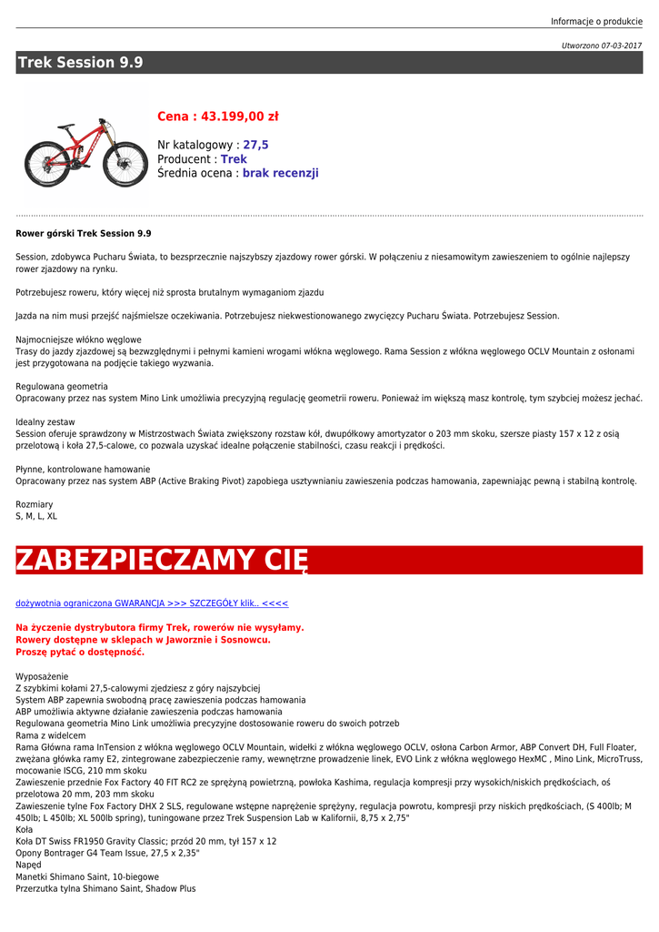 Informacje o produkcie Utworzono 07-03-2017 Trek Session 9.9 Cena : 43.199,00 zł Nr katalogowy : 27,5 Producent : Trek Średnia ocena : brak recenzji Rower górski Trek Session 9.9 Session, zdobywca Pucharu Świata, to bezsprzecznie najszybszy zjazdowy rower górski. W połączeniu z niesamowitym zawieszeniem to ogólnie najlepszy rower zjazdowy na rynku. Potrzebujesz roweru, który więcej niż sprosta brutalnym wymaganiom zjazdu Jazda na nim musi przejść najśmielsze oczekiwania. Potrzebujesz niekwestionowanego zwycięzcy Pucharu Świata. Potrzebujesz Session. Najmocniejsze włókno węglowe Trasy do jazdy zjazdowej są bezwzględnymi i pełnymi kamieni wrogami włókna węglowego. Rama Session z włókna węglowego OCLV Mountain z osłonami jest przygotowana na podjęcie takiego wyzwania. Regulowana geometria Opracowany przez nas system Mino Link umożliwia precyzyjną regulację geometrii roweru. Ponieważ im większą masz kontrolę, tym szybciej możesz jechać. Idealny zestaw Session oferuje sprawdzony w Mistrzostwach Świata zwiększony rozstaw kół, dwupółkowy amortyzator o 203 mm skoku, szersze piasty 157 x 12 z osią przelotową i koła 27,5-calowe, co pozwala uzyskać idealne połączenie stabilności, czasu reakcji i prędkości. Płynne, kontrolowane hamowanie Opracowany przez nas system ABP (Active Braking Pivot) zapobiega usztywnianiu zawieszenia podczas hamowania, zapewniając pewną i stabilną kontrolę. Rozmiary S, M, L, XL ZABEZPIECZAMY CIĘ dożywotnia ograniczona GWARANCJA >>> SZCZEGÓŁY klik.. <<<< Na życzenie dystrybutora firmy Trek, rowerów nie wysyłamy. Rowery dostępne w sklepach w Jaworznie i Sosnowcu. Proszę pytać o dostępność. Wyposażenie Z szybkimi kołami 27,5-calowymi zjedziesz z góry najszybciej System ABP zapewnia swobodną pracę zawieszenia podczas hamowania ABP umożliwia aktywne działanie zawieszenia podczas hamowania Regulowana geometria Mino Link umożliwia precyzyjne dostosowanie roweru do swoich potrzeb Rama z widelcem Rama Główna rama InTension z włókna węglowego OCLV Mountain, widełki z włókna węglowego OCLV, osłona Carbon Armor, ABP Convert DH, Full Floater, zwężana główka ramy E2, zintegrowane zabezpieczenie ramy, wewnętrzne prowadzenie linek, EVO Link z włókna węglowego HexMC , Mino Link, MicroTruss, mocowanie ISCG, 210 mm skoku Zawieszenie przednie Fox Factory 40 FIT RC2 ze sprężyną powietrzną, powłoka Kashima, regulacja kompresji przy wysokich/niskich prędkościach, oś przelotowa 20 mm, 203 mm skoku Zawieszenie tylne Fox Factory DHX 2 SLS, regulowane wstępne naprężenie sprężyny, regulacja powrotu, kompresji przy niskich prędkościach, (S 400lb; M 450lb; L 450lb; XL 500lb spring), tuningowane przez Trek Suspension Lab w Kalifornii, 8,75 x 2,75" Koła Koła DT Swiss FR1950 Gravity Classic; przód 20 mm, tył 157 x 12 Opony Bontrager G4 Team Issue, 27,5 x 2,35" Napęd Manetki Shimano Saint, 10-biegowe Przerzutka tylna Shimano Saint, Shadow Plus Korba Shimano Saint, 36T Oś suportu Uszczelniane łożysko kompaktowe Kaseta Shimano Ultegra 1125, 10-rzędowa Łańcuch Shimano XTR Pedały Wellgo MG-1, korpus z magnezu, oś chromowo-molibdenowa, wymienne sworznie Elementy Siodełko Bontrager Evoke 3, drążone tytanowe szyny Sztyca Bontrager Rhythm Elite, 2-śrubowe jarzmo, 31,6 mm, zerowe przesunięcie Kierownica Bontrager Rhythm Pro, włókno węglowe OCLV, 31,8 mm, wznios 15 mm Mostek Bontrager Direct Mount, 31,8 mm Uchwyty Bontrager Rhythm, podwójna blokada Stery Cane Creek IS-3, E2, wkład ze stopu Zestaw hamulcowy Hydrauliczne hamulce tarczowe Shimano Saint