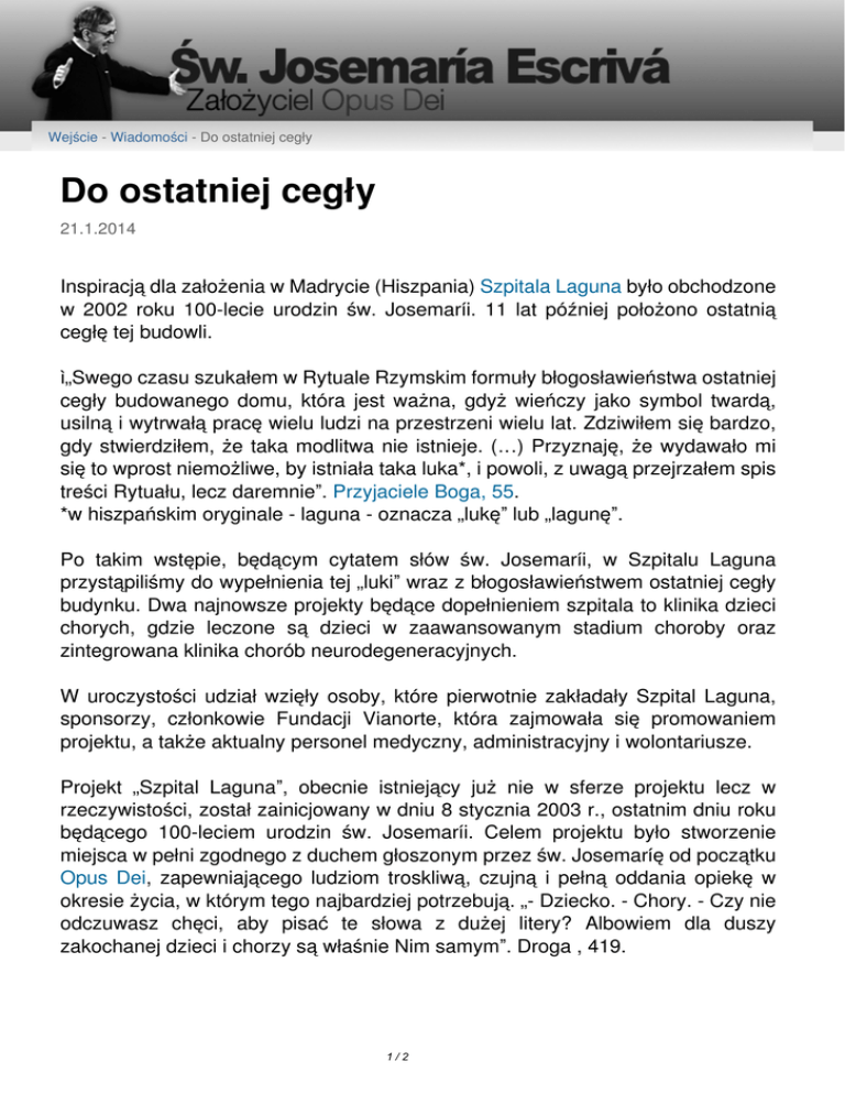 Wejście - Wiadomości - Do ostatniej cegły Do ostatniej cegły 21.1.2014 Inspiracją dla założenia w Madrycie (Hiszpania) Szpitala Laguna było obchodzone w 2002 roku 100-lecie urodzin św. Josemaríi. 11 lat później położono ostatnią cegłę tej budowli. „Swego czasu szukałem w Rytuale Rzymskim formuły błogosławieństwa ostatniej cegły budowanego domu, która jest ważna, gdyż wieńczy jako symbol twardą, usilną i wytrwałą pracę wielu ludzi na przestrzeni wielu lat. Zdziwiłem się bardzo, gdy stwierdziłem, że taka modlitwa nie istnieje. (…) Przyznaję, że wydawało mi się to wprost niemożliwe, by istniała taka luka*, i powoli, z uwagą przejrzałem spis treści Rytuału, lecz daremnie”. Przyjaciele Boga, 55. *w hiszpańskim oryginale - laguna - oznacza „lukę” lub „lagunę”. Po takim wstępie, będącym cytatem słów św. Josemaríi, w Szpitalu Laguna przystąpiliśmy do wypełnienia tej „luki” wraz z błogosławieństwem ostatniej cegły budynku. Dwa najnowsze projekty będące dopełnieniem szpitala to klinika dzieci chorych, gdzie leczone są dzieci w zaawansowanym stadium choroby oraz zintegrowana klinika chorób neurodegeneracyjnych. W uroczystości udział wzięły osoby, które pierwotnie zakładały Szpital Laguna, sponsorzy, członkowie Fundacji Vianorte, która zajmowała się promowaniem projektu, a także aktualny personel medyczny, administracyjny i wolontariusze. Projekt „Szpital Laguna”, obecnie istniejący już nie w sferze projektu lecz w rzeczywistości, został zainicjowany w dniu 8 stycznia 2003 r., ostatnim dniu roku będącego 100-leciem urodzin św. Josemaríi. Celem projektu było stworzenie miejsca w pełni zgodnego z duchem głoszonym przez św. Josemaríę od początku Opus Dei, zapewniającego ludziom troskliwą, czujną i pełną oddania opiekę w okresie życia, w którym tego najbardziej potrzebują. „- Dziecko. - Chory. - Czy nie odczuwasz chęci, aby pisać te słowa z dużej litery? Albowiem dla duszy zakochanej dzieci i chorzy są właśnie Nim samym”. Droga , 419. 1/2 W Szpitalu Laguna staramy się wiernie, do ostatniej cegły i w najdrobniejszych szczegółach, działać zgodnie z duchem, którym kierował się św. Josemaría, łącząc ciężką, wytrwałą i pełną oddania pracę z miłością i czułością dla każdej osoby. W skład Szpitala Laguna wchodzi obecnie centrum opieki paliatywnej, oddział opieki dziennej dla pacjentów z chorobą Alzheimera, centrum rehabilitacji i opieki zastępczej, szkoła pielęgniarska oraz centrum badawcze. Od dnia otwarcia szpital zapewnił opiekę ponad tysiącu pacjentom, kilkuset osobom starszym oraz tysiącom rodzin, którym zapewnia wsparcie, szkolenia i konsultacje. 2/2 Powered by TCPDF (www.tcpdf.org)
