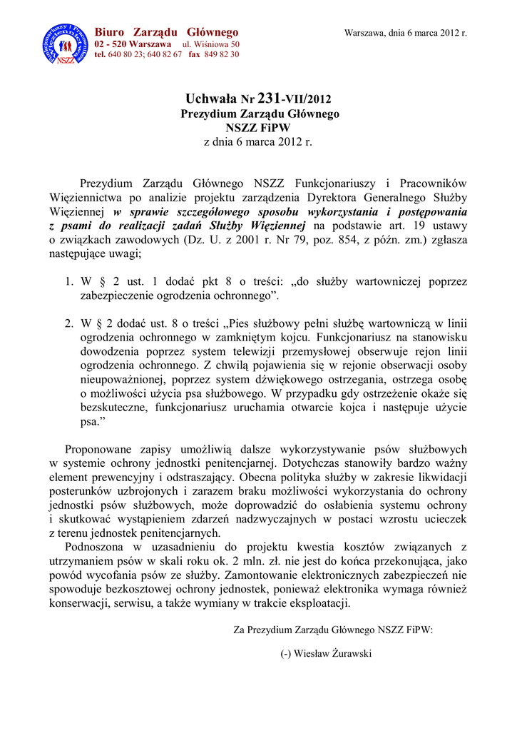 Biuro Zarządu Głównego Warszawa, dnia 6 marca 2012 r. ul. Wiśniowa 50 tel. 640 80 23; 640 82 67 fax 849 82 30 02 - 520 Warszawa Uchwała Nr 231-VII/2012 Prezydium Zarządu Głównego NSZZ FiPW z dnia 6 marca 2012 r. Prezydium Zarządu Głównego NSZZ Funkcjonariuszy i Pracowników Więziennictwa po analizie projektu zarządzenia Dyrektora Generalnego Służby Więziennej w sprawie szczegółowego sposobu wykorzystania i postępowania z psami do realizacji zadań Służby Więziennej na podstawie art. 19 ustawy o związkach zawodowych (Dz. U. z 2001 r. Nr 79, poz. 854, z późn. zm.) zgłasza następujące uwagi; 1. W § 2 ust. 1 dodać pkt 8 o treści: „do służby wartowniczej poprzez zabezpieczenie ogrodzenia ochronnego”. 2. W § 2 dodać ust. 8 o treści „Pies służbowy pełni służbę wartowniczą w linii ogrodzenia ochronnego w zamkniętym kojcu. Funkcjonariusz na stanowisku dowodzenia poprzez system telewizji przemysłowej obserwuje rejon linii ogrodzenia ochronnego. Z chwilą pojawienia się w rejonie obserwacji osoby nieupoważnionej, poprzez system dźwiękowego ostrzegania, ostrzega osobę o możliwości użycia psa służbowego. W przypadku gdy ostrzeżenie okaże się bezskuteczne, funkcjonariusz uruchamia otwarcie kojca i następuje użycie psa.” Proponowane zapisy umożliwią dalsze wykorzystywanie psów służbowych w systemie ochrony jednostki penitencjarnej. Dotychczas stanowiły bardzo ważny element prewencyjny i odstraszający. Obecna polityka służby w zakresie likwidacji posterunków uzbrojonych i zarazem braku możliwości wykorzystania do ochrony jednostki psów służbowych, może doprowadzić do osłabienia systemu ochrony i skutkować wystąpieniem zdarzeń nadzwyczajnych w postaci wzrostu ucieczek z terenu jednostek penitencjarnych. Podnoszona w uzasadnieniu do projektu kwestia kosztów związanych z utrzymaniem psów w skali roku ok. 2 mln. zł. nie jest do końca przekonująca, jako powód wycofania psów ze służby. Zamontowanie elektronicznych zabezpieczeń nie spowoduje bezkosztowej ochrony jednostek, ponieważ elektronika wymaga również konserwacji, serwisu, a także wymiany w trakcie eksploatacji. Za Prezydium Zarządu Głównego NSZZ FiPW: (-) Wiesław Żurawski