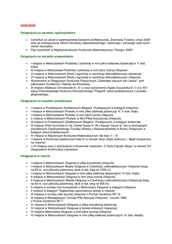 2008/2009 Osiągnięcia na szczeblu ogólnopolskim: • • Certyfikat za udział w ogólnopolskiej kampanii profilaktycznej „Zachowaj Trzeźwy umysł 2008” oraz za propagowanie wśród młodzieŜy odpowiedzialnego, radosnego i zdrowego stylu Ŝycia dwóch laureatów. Pięć wyróŜnień w Międzynarodowym Konkursie Matematycznym "Kangur 2009". Osiągnięcia na szczeblu wojewódzkim: • • • • • • I miejsce w Mistrzostwach Podstrefy Lubińskiej w mini piłce siatkowej dziewcząt kl. V (kat. trójki). III miejsce w Mistrzostwa Podstrefy Lubińskiej w mini piłce noŜnej chłopców. VI miejsce w Mistrzostwach Strefy Legnickiej w czwórboju lekkoatletycznym dziewcząt. VI miejsce w Mistrzostwach Strefy Legnickiej w czwórboju lekkoatletycznym chłopców. WyróŜnienie w Okręgowym Konkursie Plastycznym „Zwierzęta naszych pól i lasów” pod patronatem Kuratorium Oświaty we Wrocławiu. III miejsce (Mateusz Chrostowski kl. IV c) oraz wyróŜnienie (Agata Suszyńska kl. V a w XIV edycji Dolnośląskiego Konkursu Recytatorskiego "Pegazik" szkół podstawowych z powiatu głogowskiego. Osiągnięcia na szczeblu powiatowym: • • • • • • • • • I miejsce w Powiatowych Sztafetowych Biegach Przełajowych w kategorii chłopców. I miejsce w Mistrzostwach Powiatu w mini piłkę siatkową dziewcząt kl. V (kat. trójki) I miejsce w Mistrzostwach Powiatu w mini piłce noŜnej chłopców. II miejsce w Mistrzostwach Powiatu w Mini Piłkę Koszykową Chłopców. III miejsce w Powiatowych Sztafetowych Biegach Przełajowych w kategorii dziewcząt. III miejsce (Piotr Kuchnicki kl. 6a, Daniel Husar kl. 5b i Kacper Osuch kl. 5a) w eliminacjach powiatowych Ogólnopolskiego Turnieju Wiedzy o Bezpieczeństwie w Ruchu Drogowym w kategorii szkół podstawowych. IV miejsce w Rejonowym Konkursie Matematycznym dla klas V – VI. I miejsce w Konkursie plastycznym klas IV w ramach akcji „Bądź widoczny – Bądź bezpieczny na rowerze”. I i III miejsce oraz 2 wyróŜnienia w Konkursie Literackim „O Złoty Pączek Głogu” w ramach XV Głogowskich Konfrontacji Literackich. Osiągnięcia w rejonie: • • • • • • • • • • • • • I miejsce w Mistrzostwach Głogowa w piłkę koszykową chłopców. I miejsce w Mistrzostwach Miasta Głogowa w Czwórboju Lekkoatletycznym Chłopców (bieg na 60 m, rzut piłeczką palantową, skok w dal, bieg na 1000 m). I miejsce w Mistrzostwach Głogowa w mini piłkę siatkową dziewcząt kl. IV (kat. trójki). II miejsce w Mistrzostwach Głogowa w mini piłce noŜnej chłopców. II miejsce w Mistrzostwach Miasta Głogowa w Czwórboju Lekkoatletycznym Dziewcząt (bieg na 60 m, rzut piłeczką palantową, skok w dal, bieg na 600 m). II miejsce w turnieju mini koszykówki o Mistrzostwo Głogowa w kategorii chłopców. II miejsce w kategorii "Najbardziej usportowiona szkoła w mieście". III miejsce w turnieju piłki ręcznej chłopców o Puchar Dyrektora SP-12. III miejsce w Mikołajkowym Turnieju Piłki Ręcznej Chłopców - rocznik 1996 o Puchar Dyrektora SP-7. IV miejsce w Mistrzostwach Głogowa w piłkę koszykową dziewcząt. IV miejsce w Mistrzostwach Głogowa w tenisie stołowym dziewcząt. IV miejsce Mistrzostwa Głogowa w mini piłce ręcznej chłopców. IV miejsce w Mistrzostwach Głogowa w mini piłkę siatkową dziewcząt kl. IV (kat. dwójki). • • • • • • • • • • • • • • • • • • • IV miejsce Szymona Rozmysłowskiego w zawodach pływackich o Mistrzostwo Głogowa stylem klasycznym, na dystansie 25 m, w kategorii klas II. V miejsce Borysa Chrabańskiego w zawodach pływackich o Mistrzostwo Głogowa stylem klasycznym, na dystansie 50 m, w kategorii klas III. Dyplom uznania dla szkoły w podziękowaniu za kontynuację udziału w programie "Szkoły Przyjazne Środowisku". I miejsce Zespół Redakcyjny gazetki szkolnej "Europejczyk" (Marlena Wróblewska, Katarzyna Szlempo, Adrianna Głuszek, Agata Urbanowicz, Paulina Walczak, Anna Krysztopolska z kl. VI a) w V edycji Konkursu na najciekawszą gazetkę szkolną w kategorii szkół podstawowych. I miejsce w IV Międzyszkolnym Konkursie Wiedzy Przyrodniczej. I i II miejsce oraz wyróŜnienie w IV międzyszkolny Konkurs Plastyczny, Literacki i Fotograficzny „Kwiaty Polskie - Niezapominajka” w kat. Klas I- III oraz IV – VI. II miejsce zespół wokalny "DO-Re-Mi" w II Festiwalu Piosenki Patriotycznej "Vivat Polonia" w kategorii szkoły podstawowe klasy 4-6. II miejsce w IV Konkursie Piosenki Dziecięcej „Podaruj mi słońce”. II miejsce w konkursie „Czyściciel świata” - kategoria makulatura. III miejsce w Międzyszkolnym Konkursie Ortograficznym „Ortografek” dla uczniów klas III. III miejsce w Międzyszkolnym DruŜynowym Turnieju Uczniów kl. III „Tęgie Głowy”. III miejsce i wyróŜnienie w Międzyszkolnym Konkursie (w formie plastycznej) z cyklu „Polskie drogi do niepodległości”- z okazji 90 rocznicy Odzyskania Niepodległości pt.: „TERAZ BĘDZIE POLSKA". III miejsce i 3 wyróŜnienia w V Międzyszkolnym Konkursie Graficznym pn. „Najciekawszy Ekslibris”. IV i VI miejsce w Konkursie Wiedzy Ekologicznej w ramach XV Głogowskiego Konkursu Ekologicznego pod patronatem Prezydenta Miasta Głogowa „Zapobieganie produkcji odpadów i promocja recyklingu”. V miejsce w III Międzyszkolnym Konkursie Matematyczno – Przyrodniczym „Samouczek”. Dwa wyróŜnienia w Międzyszkolnym Konkursie Czytelniczym „Apetyt na polską ksiąŜkę”. WyróŜnienie w Konkursie rysunkowym „Woda największym skarbem". WyróŜnienie w II Międzyszkolnym Konkursie Plastycznym „Latawiec Moich marzeń”. WyróŜnienie w Konkursie religijnym „Ewangelia wg św. Mateusza”.