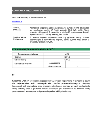 KOMPANIA WĘGLOWA S.A. 40-039 Katowice, ul. Powstańców 30 www.kwsa.pl PROFIL ZAKŁADU Kompania Węglowa jest największą w europie firmą zajmującą się produkcją węgla. W firmie pracuje 65,7 tyś. osób. Firma grupuje 16 kopalń i 5 zakładów a zdolność wydobywcza kopalń wynosi około 53 miliony ton węgla rocznie. GOSPODARKA ŚCIEKOWA Z terenu kopalń odprowadzane są głównie wody dołowe pochodzące z odwodnienia kopalń, ścieki bytowe oraz ścieki z procesów produkcyjnych. KOPALNIA WĘGLA KAMIENNEGO „POKÓJ” m3/d Gospodarka ściekowa Ogółem 1 201,0 Do kanalizacji 1 201,0 Do wód lub do ziemi oczyszczone - nieoczyszczone - !!! Kopalnia „Pokój” w całości zagospodarowuje wody kopalniane w związku z czym nie odprowadza wód dołowych do cieków powierzchniowych. Stężony koncentrat soli powstający przy procesie odwróconej osmozy w stacji uzdatniania wody dołowej oraz z płukania filtrów żwirowych jest kierowany do stawów wody przemysłowej, a następnie zużywany do podsadzki hydraulicznej.