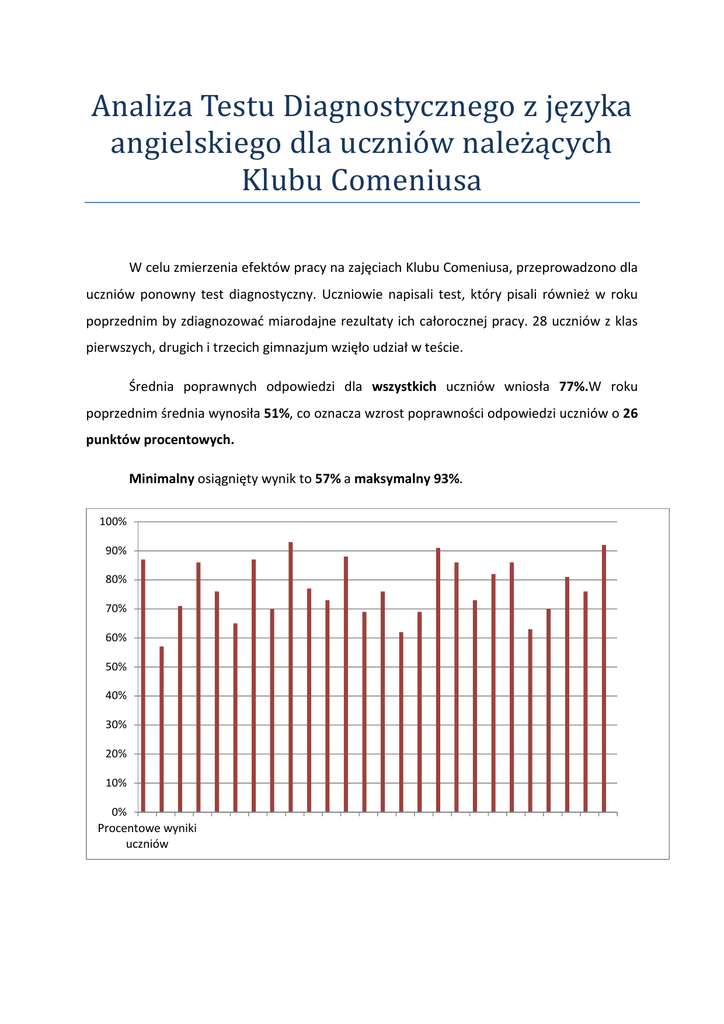 Analiza Testu Diagnostycznego z języka angielskiego dla uczniów należących Klubu Comeniusa W celu zmierzenia efektów pracy na zajęciach Klubu Comeniusa, przeprowadzono dla uczniów ponowny test diagnostyczny. Uczniowie napisali test, który pisali również w roku poprzednim by zdiagnozować miarodajne rezultaty ich całorocznej pracy. 28 uczniów z klas pierwszych, drugich i trzecich gimnazjum wzięło udział w teście. Średnia poprawnych odpowiedzi dla wszystkich uczniów wniosła 77%.W roku poprzednim średnia wynosiła 51%, co oznacza wzrost poprawności odpowiedzi uczniów o 26 punktów procentowych. Minimalny osiągnięty wynik to 57% a maksymalny 93%. 100% 90% 80% 70% 60% 50% 40% 30% 20% 10% 0% Procentowe wyniki uczniów Porównując oba przeprowadzone testy warto zauważyć, iż każdy z uczniów polepszył osiągnięty wynik.Wyniki testów w których uczniowie poprawili swoje osiągnięcia kształtują się następująco: Polepszenie wyników testu Uczniowie którzy polepszyli wynik o 30 % Uczniowie którzy polepszyli wynik o 20-25 % Uczniowie którzy polepszyli wynik o 15-20 % Uczniowie którzy polepszyli wynik o 10-15 % Uczniowie którzy polepszyli wynik o mniej niż 10 % Znaczny wzrost efektywności uczniów zauważyć można w ćwiczeniach gramatycznych. Tylko jedna osoba uzyskała wynik poniżej połowy punktów w części gramatycznej, reszta wyników kształtowała się około 70% poprawnych odpowiedzi. Ćwiczenia na słownictwo również wyłoniły tylko jedną osobę która uzyskała połowę możliwych punktów do zdobycia. W części „reagowanie językowe” wszyscy uczniowie osiągnęli ponad połowę możliwych punktów do zdobycia. Trójka uczniów osiągnęła 50 % próg skuteczności w czytaniu, zaś czwórka uczniów w tej części testu uzyskało 100%. Podsumowując, uczniowie dzięki współpracy i zaangażowaniu włożonemu w pracę Klubu Comenius znacznie polepszyli swoje wyniki na teście językowym.