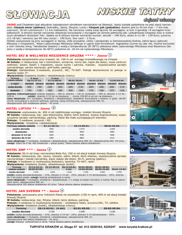 JASNÁ pod Chopkiem jest aktualnie największym ośrodkiem narciarskim na Słowacji. Jasna została podzielona na pięć stacji narciarskie: Chopok sever (północ): Zahradky, Jasna, Otupne, Lucky i Chopok juh (południe). Razem jest tu 45 km tras – 7 km tras czarnych, 18 km czerwonych i 11 km niebieskich. Na narciarzy czeka tutaj łącznie 30 wyciągów, w tym 4 gondole i 8 wyciągów krzesełkowych. 6-dniowy karnet narciarski obejmuje korzystanie z wyciągów po stronie północnej jak i południowej Chopoka oraz w wybranych ośrodkach Wysokich Tatr. Opłata za 6-dniowy karnet narciarski wynosi: dorośli – 199 Euro, dzieci 6-12 lat – 139 Euro, juniorzy (12-18 lat) i seniorzy (po 60 roku życia) – 159 Euro. Key card – 2 Euro. Hotele usytuowane są przy wyciągach w Jasnej, wille prywatne, chaty i pensjonaty w Demianowskiej Dolinie, która łączy Liptovski Mikulasz z Chopokiem. Rejon Liptovskiego Mikulasza obfituje w ujęcia wód termalnych. Kąpieliska czynne są cały rok, można korzystać z nich również zimą; Tatralandia (baseny z wodą o temperaturze 26-38°C) położona obok Liptovskiego Mikulasza oraz Besenova (baseny z wodą o temperaturze 36-40°C) położona ok. 18 km od Liptowskiego Mikulasza. HOTEL SKI & WELLNESS RESIDENCE DRUŻBA **** - Jasna 1 Położenie: bezpośrednio przy trasach, ok. 150 m od wyciągu krzesełkowego na Chopok W hotelu: 2 restauracje, bar z kominkiem, winiarnia, nocny bar, kącik dla dzieci, nowe centrum wellness: basen, basen z masażami, sauna sucha i parowa, masaże; wypożyczalnia sprzętu narciarskiego, serwis narciarski, grill-bufet, parking. Pokoje: standardowe 2-osobowe, prysznic, WC, TV-SAT. Pokoje ekonomiczne to pokoje w dawnej części 3*. Wyżywienie śniadania (bufet) i obiadokolacje (menu) Turnusy sobota-sobota w części 5 nocy 18.12-27.12. 5 nocy 27.12-09.01. 09.01-30.01. 30.01-13.03. 13.03-03.04. standard ekonom standard ekonom standard ekonom standard ekonom standard ekonom osoba dorosła 1650 1500 2390 2200 2400 2130 2500 2390 2260 2130 dostawka 1190 1120 1590 1460 1650 1530 1700 1650 1570 1530 1 BASEN dopłaty (obowiązkowe): kolacja wigilijna – 200 zł, dziecko - 120 zł; Sylwester – 450 zł, dziecko 2-12 lat 320 zł. zniżki: dziecko 2-12 lat na dostawce - minus 150,00 zł od cen na dostawce. cena obejmuje: 5/7 noclegów, śniadania i obiadokolacje, bezpłatne korzystanie z basenu w godz. 08.0010.00, korzystanie z centrum wellness, parking, taksę klimatyczną, ubezpieczenie NW, KL. Ubezpieczenie SKI dodatkowo płatne – 45 zł/os. 2 HOTEL LIPTOV ** - Jasna Położenie: usytuowany ok. 200 m od najbliższego wyciągu –kolejki linowej Otupne W hotelu: restauracja, bar, sala telewizyjna, bilard, tenis stołowy, ściana wspinaczkowa, wypożyczalnia sprzętu narciarskiego, parking. Hotel dla mało wymagających klientów. Pokoje: 2-osobowe, prysznic i WC. Wyżywienie: śniadania i obiadokolacje Turnusy sobota-sobota 01.12-25.12. 25.12-09.01. 09.01-02.04. osoba dorosła 950 1475 1350 dostawka 890 990 890 dziecko 6-12 lat 690 990 900 dziecko do 6 lat 600 885 810 1 cena obejmuje: 7 noclegów, śniadania i obiadokolacje, ubezpieczenie NW, KL. Ubezpieczenie SKI -45 zł/os. uwagi: dzieci do 6 lat, bez świadczeń – pobyt gratis. Taksa lokalna płatna dodatkowo. HOTEL SNP *** - Jasna 3 2 Położenie: 50 m od trasy narciarskiej Biela Put, 250 m od stacji kolejki linowej Otupne. W hotelu: restauracja, bar, sauna, masaże, salon, bilard, tenis stołowy, wypożyczalnia sprzętu narciarskiego i szkoła narciarska, kącik zabaw dla dzieci, Wi-Fi, parking (płatny). Pokoje: 2-osobowe (z możliwością dostawki), łazienka, TV-SAT, radio. Wyżywienie: śniadania (bufet), obiadokolacje (bufet) Turnusy sobota-sobota 12.12-22.12. 29.03-07.05. 22.12-29.12. 29.12-02.01. 4 dni 02.01-09.01. 13.02-05.03. 09.01-30.01. 05.03-24.03. 30.01-13.02. osoba dorosła 1359 1595 1450 1795 1560 1795 zniżki: osoba dorosła/dostawka – 15%, dziecko 3-15 lat – 25%, dziecko 3-15 lat/dostawka – 45%, dziecko do 3 lat-pobyt gratis. uwagi: kolacja sylwestrowa w cenie. cena obejmuje: 7 noclegów, śniadania i obiadokolacje, 1 x wstęp na basen termalny w hotelu Maj w Liptowskim Janie, ubezpieczenie NW, KL. Ubezpieczenie SKI płatne dodatkowo-45 zł/os. Taksa lokalna płatna dodatkowo. HOTEL JAN SVERMA ** - Jasna 3 4 Położenie: usytuowany przy Vrbickim Plesie na wysokości 1150 m npm, 400 m od stacji kolejki linowej Otupne. W hotelu: restauracja, bar, fitness, bilard, tenis stołowy, parking. Pokoje: 2-osobowe (z możliwością dostawki - rozkładany fotel), prysznic/WC, TV, telefon. Wyżywienie: śniadania (bufet), obiadokolacje (menu). Terminy 29.12-02.01. (4 dni) 02.01-05.03. 05.03-05.04. osoba dorosła 1150 1290 1100 zniżki: osoba dorosła/dostawka – 15%, dziecko 3-15 lat – 25%, dziecko 3-15 lat/dostawka – 45%. cena obejmuje: 7 noclegów, śniadania i obiadokolacje, ubezpieczenie NW, KL. Ubezpieczenie SKI płatne dodatkowo - 45 zł/os. uwagi: Kolacja sylwestrowa w cenie. Taksa lokalna płatna dodatkowo. TURYSTA KRAKÓW ul. Długa 47 tel. 012 4228164, 4225247 4 www.turysta.krakow.pl BASEN HOTEL FIM *** - Demianowska Dolina 1 Położenie: usytuowany w Demianowskiej Dolinie, obok Jaskini Slobody, najbliższe centrum narciarskie – Zahradky (5 km). W hotelu: restauracja, kawiarnia, salonik, basen, sauny, centrum rehabilitacji, fitness, bilard, pokój zabaw i gier dla dzieci, parking. Pokoje: 2-osobowe (z możliwością dostawki), prysznic, WC, TV-SAT, radio, telefon Wyżywienie: śniadania (bufet), kolacje (menu) 1 dzieci do 15 lat gratis Terminy niedziela-niedziela 22.12-27.12. 5 dni 27.12-02.01. 5 dni 10.01-29.01.* 29.01-06.03. osoba dorosła 1190 1550 1270 1420 zniżki: dziecko do 4 lat gratis, dziecko 4-15 lat/dostawka– 45%. *Dziecko do 15 lat/dostawka – pobyt gratis. cena obejmuje: 5/7 noclegów, śniadania i obiadokolacje, korzystanie z basenu, fitness, ubezpieczenie. uwagi: Kolacja wigilijna i sylwestrowa w cenie. Ubezpieczenie SKI p