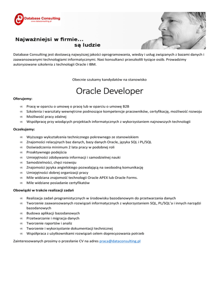 Database Consulting jest dostawcą najwyższej jakości oprogramowania, wiedzy i usług związanych z bazami danych i zaawansowanymi technologiami informatycznymi. Nasi konsultanci przeszkolili tysiące osób. Prowadzimy autoryzowane szkolenia z technologii Oracle i IBM. Obecnie szukamy kandydatów na stanowisko Oracle Developer Oferujemy: • • • • Pracę w oparciu o umowę o pracę lub w oparciu o umowę B2B Szkolenia i warsztaty wewnętrzne podnoszące kompetencje pracowników, certyfikację, możliwość rozwoju Możliwość pracy zdalnej Współpracę przy wiodących projektach informatycznych z wykorzystaniem najnowszych technologii Oczekujemy: • • • • • • • • • • Wyższego wykształcenia technicznego pokrewnego ze stanowiskiem Znajomości relacyjnych baz danych, bazy danych Oracle, języka SQL i PL/SQL Doświadczenia minimum 2 lata pracy w podobnej roli Proaktywnego podejścia Umiejętności zdobywania informacji i samodzielnej nauki Samodzielności, chęci rozwoju Znajomości języka angielskiego pozwalającą na swobodną komunikację Umiejętności dobrej organizacji pracy Mile widziana znajomość technologii Oracle APEX lub Oracle Forms. Mile widziane posiadanie certyfikatów Obowiązki w trakcie realizacji zadań • • • • • • • Realizacja zadań programistycznych w środowisku bazodanowym do przetwarzania danych Tworzenie zaawansowanych rozwiązań informatycznych z wykorzystaniem SQL, PL/SQL’a i innych narządzi bazodanowych Budowa aplikacji bazodanowych Przetwarzanie i migracja danych Tworzenie raportów i analiz Tworzenie i wykorzystanie dokumentacji technicznej Współpraca z użytkownikami rozwiązań celem doprecyzowania potrzeb Zainteresowanych prosimy o przesłanie CV na adres [email protected]