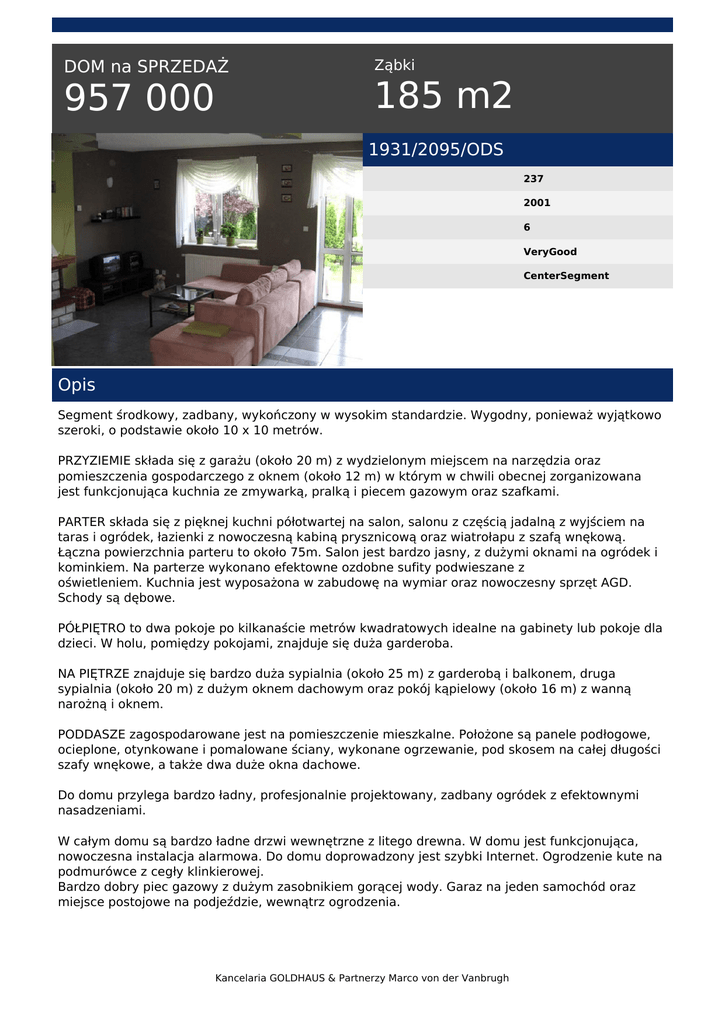 DOM na SPRZEDAŻ 957 000 Ząbki 185 m2 1931/2095/ODS 237 2001 6 VeryGood CenterSegment Opis Segment środkowy, zadbany, wykończony w wysokim standardzie. Wygodny, ponieważ wyjątkowo szeroki, o podstawie około 10 x 10 metrów. PRZYZIEMIE składa się z garażu (około 20 m) z wydzielonym miejscem na narzędzia oraz pomieszczenia gospodarczego z oknem (około 12 m) w którym w chwili obecnej zorganizowana jest funkcjonująca kuchnia ze zmywarką, pralką i piecem gazowym oraz szafkami. PARTER składa się z pięknej kuchni półotwartej na salon, salonu z częścią jadalną z wyjściem na taras i ogródek, łazienki z nowoczesną kabiną prysznicową oraz wiatrołapu z szafą wnękową. Łączna powierzchnia parteru to około 75m. Salon jest bardzo jasny, z dużymi oknami na ogródek i kominkiem. Na parterze wykonano efektowne ozdobne sufity podwieszane z oświetleniem. Kuchnia jest wyposażona w zabudowę na wymiar oraz nowoczesny sprzęt AGD. Schody są dębowe. PÓŁPIĘTRO to dwa pokoje po kilkanaście metrów kwadratowych idealne na gabinety lub pokoje dla dzieci. W holu, pomiędzy pokojami, znajduje się duża garderoba. NA PIĘTRZE znajduje się bardzo duża sypialnia (około 25 m) z garderobą i balkonem, druga sypialnia (około 20 m) z dużym oknem dachowym oraz pokój kąpielowy (około 16 m) z wanną narożną i oknem. PODDASZE zagospodarowane jest na pomieszczenie mieszkalne. Położone są panele podłogowe, ocieplone, otynkowane i pomalowane ściany, wykonane ogrzewanie, pod skosem na całej długości szafy wnękowe, a także dwa duże okna dachowe. Do domu przylega bardzo ładny, profesjonalnie projektowany, zadbany ogródek z efektownymi nasadzeniami. W całym domu są bardzo ładne drzwi wewnętrzne z litego drewna. W domu jest funkcjonująca, nowoczesna instalacja alarmowa. Do domu doprowadzony jest szybki Internet. Ogrodzenie kute na podmurówce z cegły klinkierowej. Bardzo dobry piec gazowy z dużym zasobnikiem gorącej wody. Garaz na jeden samochód oraz miejsce postojowe na podjeździe, wewnątrz ogrodzenia. Kancelaria GOLDHAUS & Partnerzy Marco von der Vanbrugh W domu i najbliższej okolicy jest bardzo cicho i spokojnie. Niedaleko domu są przystanki autobusowe (także linia nocna), a w niedalekie j przyszłości wykonana zostanie linia tramwajowa. W domu i ogrodzie nie słychać odgłosów komunikacji, czy ruchu miejskiego. 101/ Goldhaus Nieruchomości tel. +48/22622-52-30 email: [email protected] Kancelaria GOLDHAUS & Partnerzy Marco von der Vanbrugh Powered by TCPDF (www.tcpdf.org)