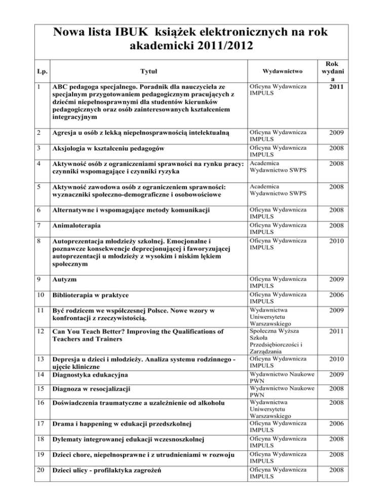 Nowa lista IBUK książek elektronicznych na rok akademicki 2011/2012 Lp. Tytuł 1 ABC pedagoga specjalnego. Poradnik dla nauczyciela ze specjalnym przygotowaniem pedagogicznym pracujących z dziećmi niepełnosprawnymi dla studentów kierunków pedagogicznych oraz osób zainteresowanych kształceniem integracyjnym 2 Agresja u osób z lekką niepełnosprawnością intelektualną 3 4 Wydawnictwo Oficyna Wydawnicza IMPULS Rok wydani a 2011 Oficyna Wydawnicza IMPULS Oficyna Wydawnicza Aksjologia w kształceniu pedagogów IMPULS Aktywność osób z ograniczeniami sprawności na rynku pracy: Academica Wydawnictwo SWPS czynniki wspomagające i czynniki ryzyka 2009 2008 2008 5 Aktywność zawodowa osób z ograniczeniem sprawności: wyznaczniki społeczno-demograficzne i osobowościowe Academica Wydawnictwo SWPS 2008 6 Alternatywne i wspomagające metody komunikacji 2008 7 Animaloterapia 8 Autoprezentacja młodzieży szkolnej. Emocjonalne i poznawcze konsekwencje deprecjonującej i faworyzującej autoprezentacji u młodzieży z wysokim i niskim lękiem społecznym Oficyna Wydawnicza IMPULS Oficyna Wydawnicza IMPULS Oficyna Wydawnicza IMPULS 9 Autyzm 2009 10 Biblioterapia w praktyce 11 Być rodzicem we współczesnej Polsce. Nowe wzory w konfrontacji z rzeczywistością. 12 Can You Teach Better? Improving the Qualifications of Teachers and Trainers 13 14 Depresja u dzieci i młodzieży. Analiza systemu rodzinnego ujęcie kliniczne Diagnostyka edukacyjna 15 Diagnoza w resocjalizacji 16 Doświadczenia traumatyczne a uzależnienie od alkoholu 17 Drama i happening w edukacji przedszkolnej 18 Dylematy integrowanej edukacji wczesnoszkolnej 19 Dzieci chore, niepełnosprawne i z utrudnieniami w rozwoju 20 Dzieci ulicy - profilaktyka zagrożeń Oficyna Wydawnicza IMPULS Oficyna Wydawnicza IMPULS Wydawnictwa Uniwersytetu Warszawskiego Społeczna Wyższa Szkoła Przedsiębiorczości i Zarządzania Oficyna Wydawnicza IMPULS Wydawnictwo Naukowe PWN Wydawnictwo Naukowe PWN Wydawnictwa Uniwersytetu Warszawskiego Oficyna Wydawnicza IMPULS Oficyna Wydawnicza IMPULS Oficyna Wydawnicza IMPULS Oficyna Wydawnicza IMPULS 2008 2010 2006 2009 2011 2010 2009 2008 2008 2006 2008 2008 2008 21 22 23 24 25 26 27 28 29 30 31 32 33 34 35 36 37 38 39 40 41 42 43 44 Oficyna Wydawnicza IMPULS Oficyna Wydawnicza IMPULS Oficyna Wydawnicza Dziecko z zaburzeniami rozwoju i zachowania w klasie IMPULS szkolnej Dziecko z zespołem nadpobudliwości psychoruchowej ADHD i Oficyna Wydawnicza IMPULS ADD Wydawnictwo Lekarskie Dziecko z zespołem wad wrodzonych PZWL Edukacja akademicka szansą na aktywizację zawodową osób z Academica Wydawnictwo SWPS ograniczeniem sprawności Oficyna Wydawnicza Edukacja alternatywna w XXI wieku IMPULS Oficyna Wydawnicza Edukacja i sfera publiczna. Idee i doświadczenia pedagogiki IMPULS radykalnej Wydawnictwo WAM Edukacja kreatywna Oficyna Wydawnicza Edukacja małego dziecka, t. 1. Teoretyczne odniesienia, IMPULS tendencje i problemy Oficyna Wydawnicza Edukacja małego dziecka, t. 2. Wychowanie i kształcenie w IMPULS praktyce Oficyna Wydawnicza Edukacja małego dziecka, t.3. Nowe konteksty, poglądy i IMPULS doświadczenia Oficyna Wydawnicza Edukacja w przebiegu życia. Od dzieciństwa do starości IMPULS Oficyna Wydawnicza Edukacja w wolności IMPULS Wydawnictwa Edukacja zdrowotna Akademickie i Profesjonalne Wydawnictwo WAM Edukacyjne przestrzenie zdrowia Stowarzyszenie Wyższej Europa multimedialna. Od Acta Diurna do Europa.eu Użyteczności Publicznej Instytut NaukowoBadawczy MOVEABLE 2010 Wydawnictwo Uniwersytetu Jagiellońskiego Ewaluacja w nadzorze pedagogicznym, t. 2. Odpowiedzialność Wydawnictwo Uniwersytetu Jagiellońskiego Wydawnictwo Ewaluacja w nadzorze pedagogicznym, t. 3 Autonomia Uniwersytetu Jagiellońskiego Oficyna Wydawnicza Fenomen sekt IMPULS Wydawnictwo Naukowe Finansowanie oświaty w Polsce. Diagnoza, dylematy, Scholar możliwości Wydawnictwo Naukowe Fonetyka i fonologia współczesnego języka polskiego. PWN Ćwiczenia Wydawnictwo Naukowe Funkcjonowanie psychospołeczne dzieci z astmą w średnim Akademii Pomorskiej w wieku szkolnym Słupsku 2010 Wydawnictwo Naukowe Scholar Wydawnictwo Naukowe PWN Wydawnictwo Naukowe PWN 2008 Dziecko - aktywny uczestnik porodu. Zagadnienie interdyscyplinarne Dziecko autystyczne z zespołem Aspergera Ewaluacja w nadzorze pedagogicznym, t. 1. Konteksty 45 Genetyka zachowania w psychologii i psychiatrii 46 Genetyka. Krótkie wykłady 47 Gramatyka języka angielskiego z ćwiczeniami 2007 2007 2010 2004 2008 2010 2010 2008 2010 2010 2010 2010 2008 2009 2009 2011 2010 2010 2007 2009 2010 2010 2010 2008 48 49 50 51 52 53 54 55 56 57 58 59 60 61 Wydawnictwo Uniwersytetu Jagiellońskiego Oficyna Wydawnicza Idea integracji a wychowanie IMPULS Wydawnictwa Identyfikacja wartości osobistych w badaniach Uniwersytetu psychologicznych Warszawskiego Academica Inni czy podobni? Charakterystyka osób z ograniczeniem Wydawnictwo SWPS sprawności Oficyna Wydawnicza Instytucje wsparcia dziecka i rodziny IMPULS Wydawnictwo Naukowe Integracyjne kształcenie niepełnosprawnych PWN Inteligencja i zdolności twórcze dzieci w początkowym okresie Oficyna Wydawnicza IMPULS edukacji Interwencja kryzysowa. Pomoc w kryzysach psychologicznych Wydawnictwa Akademickie i Profesjonalne Oficyna Wydawnicza Istota czytania IMPULS Academica Jak działa wola, czyli dynamika umysłu Wydawnictwo SWPS Oficyna Wydawnicza Jak krok po kroku wprowadzać dzieci o specjalnych IMPULS potrzebach edukacyjnych w świat zabawy i nauki 2010 Oficyna Wydawnicza IMPULS Academica Jaka pomoc i dla kogo? Wsparcie indywidualne i instytucjonalne a aktywizacja zawodowa osób z ograniczeniem Wydawnictwo SWPS 2007 Harmonizując napięcie. Nowe spojrzenie w profilaktyce uzależnień Jak uczyć uczenia się? sprawności Kategorie pojęciowe edukacji w przestrzeni interdyscyplinarnych interpretacji Wydawnictwo Uniwersytetu Jagiellońskiego Oficyna Wydawnicza IMPULS 62 Koncepcja edukacji fizycznej. Zdrowie-Sport-Rek