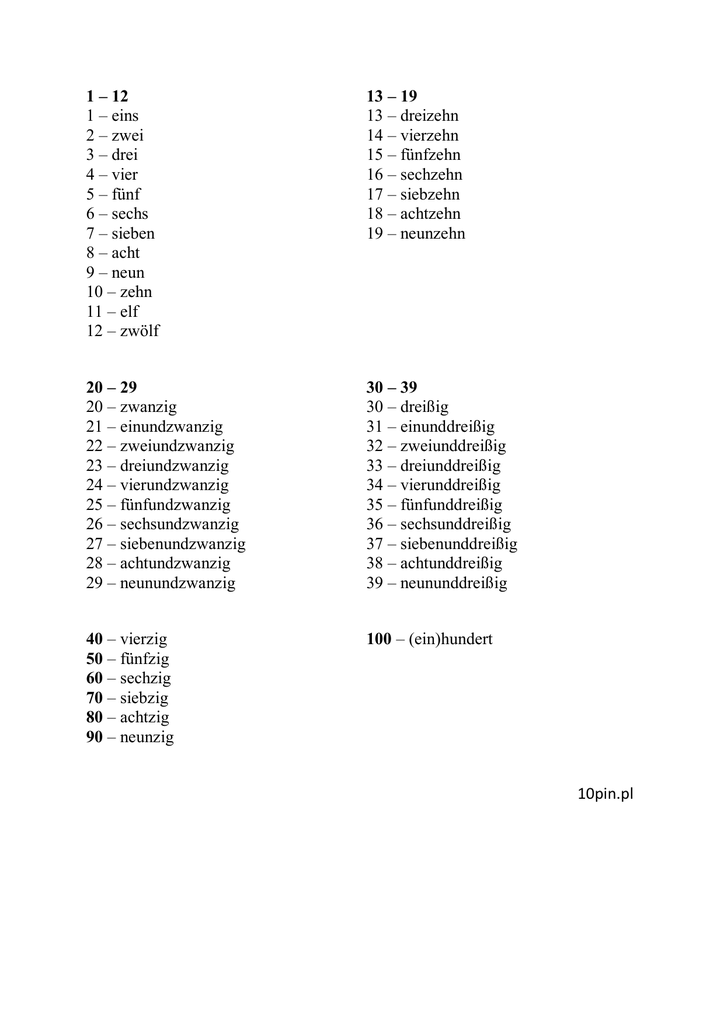 1 – 12 1 – eins 2 – zwei 3 – drei 4 – vier 5 – fünf 6 – sechs 7 – sieben 8 – acht 9 – neun 10 – zehn 11 – elf 12 – zwölf 13 – 19 13 – dreizehn 14 – vierzehn 15 – fünfzehn 16 – sechzehn 17 – siebzehn 18 – achtzehn 19 – neunzehn 20 – 29 20 – zwanzig 21 – einundzwanzig 22 – zweiundzwanzig 23 – dreiundzwanzig 24 – vierundzwanzig 25 – fünfundzwanzig 26 – sechsundzwanzig 27 – siebenundzwanzig 28 – achtundzwanzig 29 – neunundzwanzig 30 – 39 30 – dreißig 31 – einunddreißig 32 – zweiunddreißig 33 – dreiunddreißig 34 – vierunddreißig 35 – fünfunddreißig 36 – sechsunddreißig 37 – siebenunddreißig 38 – achtunddreißig 39 – neununddreißig 40 – vierzig 50 – fünfzig 60 – sechzig 70 – siebzig 80 – achtzig 90 – neunzig 100 – (ein)hundert 10pin.pl