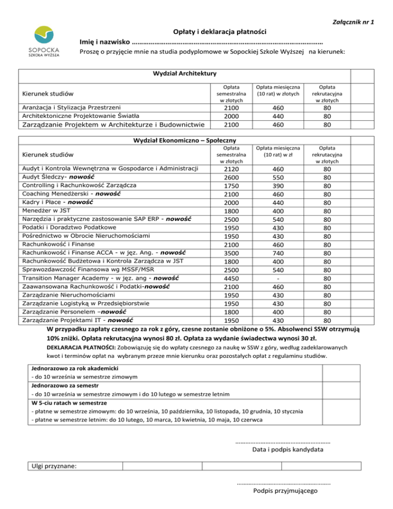 Załącznik nr 1 Opłaty i deklaracja płatności Imię i nazwisko ………………………………………………………………………………………… Proszę o przyjęcie mnie na studia podyplomowe w Sopockiej Szkole Wyższej na kierunek: Wydział Architektury Kierunek studiów Aranżacja i Stylizacja Przestrzeni Architektoniczne Projektowanie Światła Zarządzanie Projektem w Architekturze i Budownictwie Opłata semestralna w złotych Opłata miesięczna (10 rat) w złotych Opłata rekrutacyjna w złotych 2100 2000 2100 460 440 460 80 80 80 Opłata miesięczna (10 rat) w zł Opłata rekrutacyjna w złotych Wydział Ekonomiczno – Społeczny Kierunek studiów Opłata semestralna w złotych Audyt i Kontrola Wewnętrzna w Gospodarce i Administracji 2120 460 80 Audyt Śledczy- nowość 2600 550 80 Controlling i Rachunkowość Zarządcza 1750 390 80 Coaching Menedżerski - nowość 2100 460 80 Kadry i Płace - nowość 2000 440 80 Menedżer w JST 1800 400 80 Narzędzia i praktyczne zastosowanie SAP ERP - nowość 2500 540 80 Podatki i Doradztwo Podatkowe 1950 430 80 Pośrednictwo w Obrocie Nieruchomościami 1950 430 80 Rachunkowość i Finanse 2100 460 80 Rachunkowość i Finanse ACCA - w jęz. Ang. - nowość 3500 740 80 Rachunkowość Budżetowa i Kontrola Zarządcza w JST 1800 400 80 Sprawozdawczość Finansowa wg MSSF/MSR 2500 540 80 Transition Manager Academy - w jęz. ang - nowość 4450 80 Zaawansowana Rachunkowość i Podatki-nowość 2100 460 80 Zarządzanie Nieruchomościami 1950 430 80 Zarządzanie Logistyką w Przedsiębiorstwie 1950 430 80 Zarządzanie Personelem –nowość 1800 400 80 Zarządzanie Projektami IT - nowość 1950 430 80 W przypadku zapłaty czesnego za rok z góry, czesne zostanie obniżone o 5%. Absolwenci SSW otrzymują 10% zniżki. Opłata rekrutacyjna wynosi 80 zł. Opłata za wydanie świadectwa wynosi 30 zł. DEKLARACJA PŁATNOŚCI: Zobowiązuję się do wpłaty czesnego za naukę w SSW z góry, według zadeklarowanych kwot i terminów opłat na wybranym przeze mnie kierunku oraz pozostałych opłat z regulaminu studiów. Jednorazowo za rok akademicki - do 10 września w semestrze zimowym Jednorazowo za semestr - do 10 września w semestrze zimowym i do 10 lutego w semestrze letnim W 5-ciu ratach w semestrze - płatne w semestrze zimowym: do 10 września, 10 października, 10 listopada, 10 grudnia, 10 stycznia - płatne w semestrze letnim: do 10 lutego, 10 marca, 10 kwietnia, 10 maja, 10 czerwca ………………………………………………… Data i podpis kandydata Ulgi przyznane: ……………………………………………….. Podpis przyjmującego