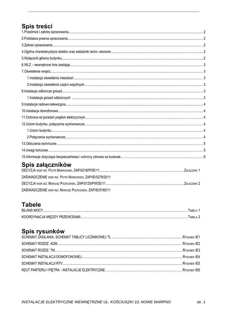 Spis treści 1.Przedmiot i zakres opracowania.......................................................................................................................................................... 2 2.Podstawa prawna opracowania........................................................................................................................................................... 2 3.Zakres opracowania............................................................................................................................................................................ 2 4.Ogólna charakterystyka obiektu oraz wskaźniki techn.-ekonom......................................................................................................... 2 5.Wyłącznik główny budynku................................................................................................................................................................. 2 6.WLZ – wewnętrzne linie zasilając........................................................................................................................................................ 3 7.Oświetlenie wnętrz.............................................................................................................................................................................. 3 1.Instalacja oświetlenia mieszkań.................................................................................................................................................... 3 2.Instalacja oświetlenia części wspólnych........................................................................................................................................ 3 8.Instalacje odbiorcze gniazd................................................................................................................................................................. 3 1.Instalacja gniazd odbiorczych ..................................................................................................................................................... 3 9.Instalacja radiowo-telewizyjna............................................................................................................................................................. 4 10.Instalacja domofonowa...................................................................................................................................................................... 4 11.Ochrona od porażeń prądem elektrycznym....................................................................................................................................... 4 12.Uziom budynku, połączenia wyrównawcze....................................................................................................................................... 4 1.Uziom budynku............................................................................................................................................................................. 4 2.Połączenia wyrównawcze............................................................................................................................................................. 4 13.Obliczenia techniczne....................................................................................................................................................................... 5 14.Uwagi końcowe................................................................................................................................................................................. 5 15.Informacje dotyczące bezpieczeństwa i ochrony zdrowia na budowie.............................................................................................. 6 Spis załączników DECYZJA MGR INŻ. PIOTR MARKOWSKI, ZAP/0218/POE/11................................................................................................ ZAŁĄCZNIK 1 ZAŚWIADCZENIE MGR INŻ. PIOTR MARKOWSKI, ZAP/IE/0278/2011 DECYZJA MGR INŻ. MARIUSZ PIĄTKOWSKI, ZAP/0125/PWOE/11......................................................................................... ZAŁĄCZNIK 2 ZAŚWIADCZENIE MGR INŻ. MARIUSZ PIĄTKOWSKI, ZAP/IE/0165/11 Tabele BILANS MOCY..................................................................................................................................................................... TABELA 1 KOORDYNACJA MIĘDZY PRZEWODAMI.......................................................................................................................... TABELA 2 Spis rysunków SCHEMAT ZASILANIA, SCHEMAT TABLICY LICZNIKOWEJ TL ................................................................................RYSUNEK IE1 SCHEMAT ROZDZ. ADM.............................................................................................................................................. RYSUNEK IE2 SCHEMAT ROZDZ. TM................................................................................................................................................. RYSUNEK IE3 SCHEMAT INSTALACJI DOMOFONOWEJ................................................................................................................... RYSUNEK IE4 SCHEMAT INSTALACJI RTV........................................................................................................................................ RYSUNEK IE5 RZUT PARTERU I PIĘTRA - INSTALACJE ELEKTRYCZNE........................................................................................RYSUNEK IE6 INSTALACJE ELEKTRYCZNE WEWNĘTRZNE UL. KOŚCIUSZKI 10, NOWE WARPNO str. 1 1. Przedmiot i zakres opracowania Projekt budowlano-wykonawczy dla nowo modernizowanego obiektu: temat /obiekt /część : Ocieplenie ścian zewnętrznych budynku, kolorystyka i remont elementów konstrukcji w budynku mieszkalnym wielorodzinnym adres inwestycji : ul. Warszawska 35, Nowe Warpno Inwestor i adres inwestora : Zakład Gospodarki Komunalnej w Now
