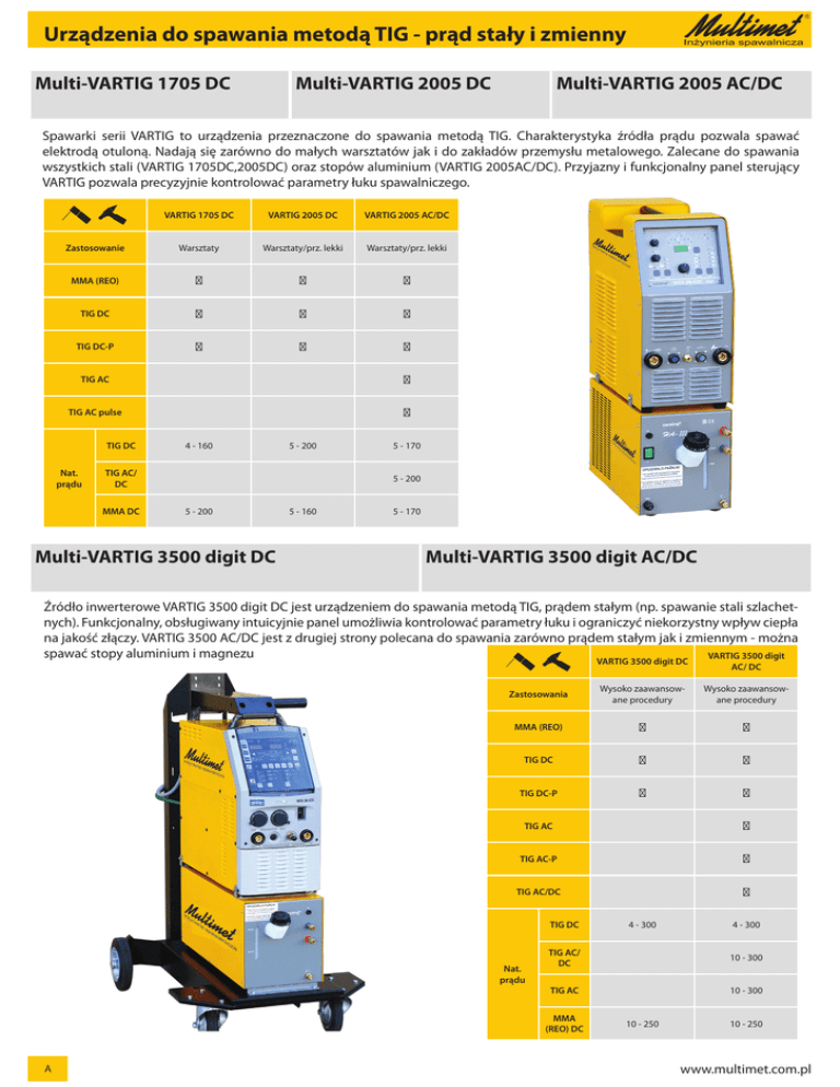 Urządzenia do spawania metodą TIG - prąd stały i zmienny Multi-VARTIG 1705 DC Multi-VARTIG 2005 DC Multi-VARTIG 2005 AC/DC Spawarki serii VARTIG to urządzenia przeznaczone do spawania metodą TIG. Charakterystyka źródła prądu pozwala spawać elektrodą otuloną. Nadają się zarówno do małych warsztatów jak i do zakładów przemysłu metalowego. Zalecane do spawania wszystkich stali (VARTIG 1705DC,2005DC) oraz stopów aluminium (VARTIG 2005AC/DC). Przyjazny i funkcjonalny panel sterujący VARTIG pozwala precyzyjnie kontrolować parametry łuku spawalniczego. VARTIG 1705 DC VARTIG 2005 DC VARTIG 2005 AC/DC Zastosowanie Warsztaty Warsztaty/prz. lekki Warsztaty/prz. lekki MMA (REO) ✓ ✓ ✓ TIG DC ✓ ✓ ✓ TIG DC-P ✓ ✓ ✓ TIG AC ✓ TIG AC pulse ✓ TIG DC Nat. prądu 4 - 160 5 - 200 TIG AC/ DC MMA DC 5 - 170 5 - 200 5 - 200 Multi-VARTIG 3500 digit DC 5 - 160 5 - 170 Multi-VARTIG 3500 digit AC/DC Źródło inwerterowe VARTIG 3500 digit DC jest urządzeniem do spawania metodą TIG, prądem stałym (np. spawanie stali szlachetnych). Funkcjonalny, obsługiwany intuicyjnie panel umożliwia kontrolować parametry łuku i ograniczyć niekorzystny wpływ ciepła na jakość złączy. VARTIG 3500 AC/DC jest z drugiej strony polecana do spawania zarówno prądem stałym jak i zmiennym - można spawać stopy aluminium i magnezu VARTIG 3500 digit VARTIG 3500 digit DC Zastosowania Wysoko zaawansowane procedury Wysoko zaawansowane procedury MMA (REO) ✓ ✓ TIG DC ✓ ✓ TIG DC-P ✓ ✓ TIG AC ✓ TIG AC-P ✓ TIG AC/DC ✓ TIG DC Nat. prądu 4 - 300 4 - 300 TIG AC/ DC 10 - 300 TIG AC 10 - 300 MMA (REO) DC A AC/ DC 10 - 250 10 - 250 www.multimet.com.pl