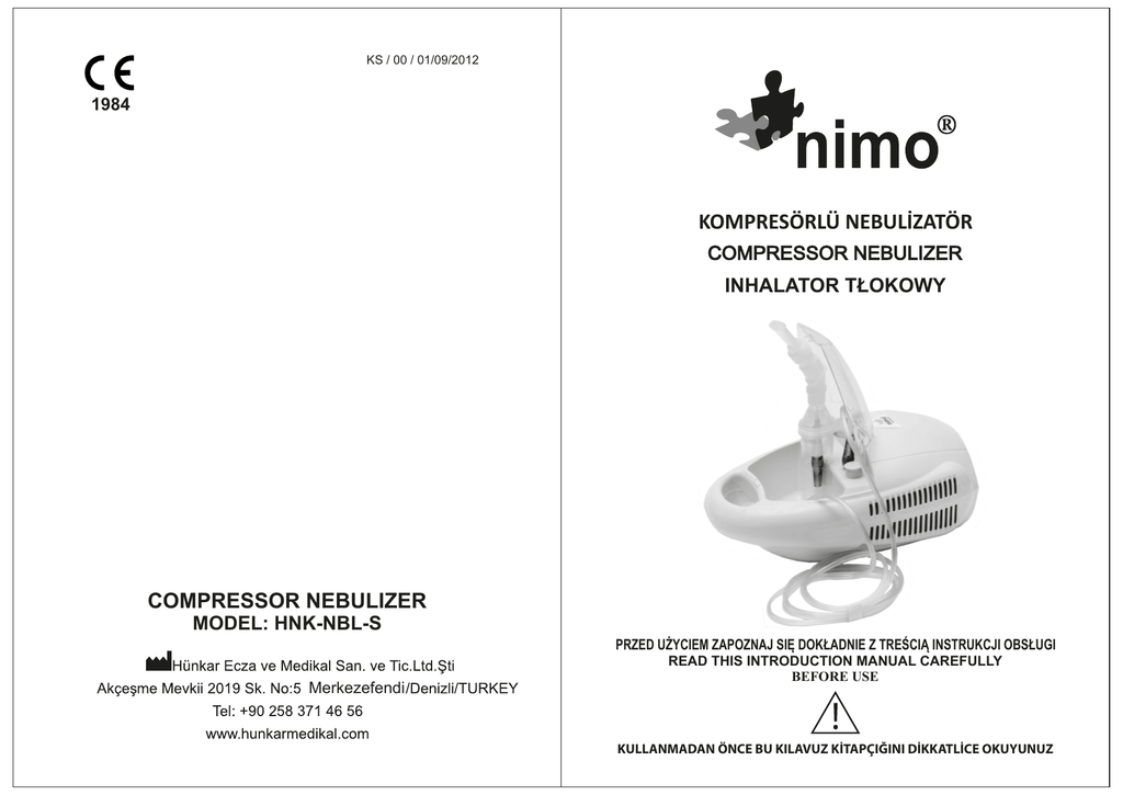 KS / 00 / 01/09/2012 1984 KOMPRESÖRLÜ NEBULİZATÖR INHALATOR TŁOKOWY COMPRESSOR NEBULIZER MODEL: HNK-NBL-S Merkezefendi PRZED UŻYCIEM ZAPOZNAJ SIĘ DOKŁADNIE Z TREŚCIĄ INSTRUKCJI OBSŁUGI READ THIS INTRODUCTION MANUAL CAREFULLY BEFORE USE KULLANMADAN ÖNCE BU KILAVUZ KİTAPÇIĞINI DİKKATLİCE OKUYUNUZ KOMPRESÖRLÜ NEBULİZATÖR MODEL NO.: HNK-NBL-S TALİMATLAR İÇİNDEKİLER 1. 2. 3. 4. 5. 6. 7. Giriş Ürün Tanıtımı Önemli Güvenlik Önlemleri Kompresörlü İlaç Kabınınızi Kullanılması Temizleme Yedek Parçalar & Opsiyonel Aksesuarlar Teknik Özellikler Sayfa 2 Sayfa 3 Sayfa 3 Sayfa 4 Sayfa 5 Sayfa 6 Sayfa 6 1. GİRİŞ Nimo Nebulizatörü satın aldığınız için teşekkür ederiz. Doktor tarafından yazılan ilacın, bronşiyal akciğer yollarına etkin bir şekilde ulaştırılması için tasarlanmış olan kompakt bir medikal cihazdır. Uygun bakım ve kullanımla. siizlere uzun yıllar güvenilir tedavi sağlayacaktır. Bu ürün. astım, alerjiler ve diğer solunum bozukluklarının başarılı bir şekilde tedavisi için geliştirilmiştir. Hava tüpünden ilaç kabına püskürtece doğru gelen bir hava akımı oluşturur. Hava ilaç kabına girdiğinde, kolaylıkla solunması için yazılan ilacı aerosol buğusuna dönüştürecektir. NİMO S Bu ürünün, lisanslı bir doktor ve/veya bir solunum terapisti gözetiminde kullanılması gerekmektedir. Bu ürün özellikleri hakkında bilgi edinmek için bu kılavuz kitapçığı tam olarak okumanızı kuvvetle tavsiye ediyoruz.Bu ürünün tasarlandığı amaç dışında her hangi bir şekilde kullanımından daima kaçınılmalıdır. 2 15 Czyszczenie inhalatora 1.Codziennie przecieraj inhalator zwilżoną szmatką. 2.Nie używaj żadnych środków czyszczących w proszku lub gąbek do szorowania, gdyż mogą one uszkodzić powierzchnię urządzenia. 2. ÜRÜN TANIMLAMASI 1- Nebulizatör kapağı 2- Hava filtresi kapağı 3- Tüp konnektörü 4- Nebulizatör ilaç kabı koyma yeri 5- Açma kapama düğmesi 6- Yetişkin Maske 7- Çocuk Maske 8- İlaç kabı 9- Ağızlık 10- Hava tüpü 11- Hava filtresi yedeği 12- Elektrik kablo yeri 13- Hava açıklıkları Wymiana filtra 1.Nie używaj bawełny ani żadnych innych materiałów. Nie myj ani nie czyść filtra. Używaj wyłącznie filtrów od dystrybutora produktu. Nie używaj urządzenia bez filtra. 2.Filtr należy wymieniać co 30 dni lub gdy filtr stanie się szary. 3.Wymiana filtra: A.Usuń pokrywę filtra. B.Zastąp zużyty filtr nowym. C.Umieść pokrywę filtra na swoim miejscu. 6. WYMIANA CZĘŚCI I DODATKOWE AKCESORIA Części wymienne są dostępne u lokalnego dystrybutora. 7. SPECYFIKACJA Źródło zasilania Pobór mocy Pojemność pojemnika na lek Wielkość cząsteczek AC 230V /50Hz 60 W 8ml frakcja respirabilna 0.5 - 5μm 80% Ochrona przed porażeniem prądem elektrycznym - sprzęt Klasy II - zawiera części typu BF - ustnik, końcówka w kształcie smoczka dla niemowląt oraz maseczka. Zabezpieczenie przed wnikaniem wody - IPX0 (brak specjalnej ochrony) Poziom bezpieczeństwa w obecności łatwopalnych środków znieczulających lub tlenu - brak AP/APG (Nie nadaje się do użytku w obecności łatwopalnych środków znieczulających lub tlenu) 14 Depolama esnasında dikkat edilmesi gereken hususlar: 1. Üniteyi, doğrudan gün ışığına, yüksek sıcaklığa ya da neme maruz kalacak şekilde depolamayınız. 2. Üniteyi ufak çocukların erişemeyeceği yerlerde depolayınız. 3. Kullanılmadığında üniteyi daima fişten çekik olarak muhafaza ediniz. Temizlik esnasında dikkat edilmesi gereken hususlar: 1. Üniteyi suya batırmayınız. Bu ünitenin hasar görmesine yol açabilmektedir. 2. Temizlik öncesinde ünitenin elektrik bağlantısını kesiniz. 3. Bu kılavuzda tarif edildiği şekilde her kullanım sonrasında gerekli tüm parçaları temizleyiniz. 3 4. KOMPRESORLU ILAÇ KABININ KULLANILMASI Not: İlk sefer çalıştırmadan önce, ilaç kabını tam manasıyla temizlenmesi gerekmektedir. 1. Kompresörlü ilaç kabınızı düz ve sabit bir zemine yerleştiriniz. Oturduğunuzda kontrollere kolaylıkta ulaşabileceğinizden emin olunuz. 2. Temizlik kapağını açınız ve içindeki aksesuarları çıkarınız. Önemli: İlk sefer çalıştırmadan önce, bu kitapçıktaki “ Temizlik Prosedürleri” bölümüne bakmak suretiyle püskürtecin tam manasıyla temizlenmesi gerekmektedir. 3. İlaç kabını sökmek için, ilaç kabının üst kısmını nazikçe saat yönünün aksi istikametinde çeviriniz. 4. İlaç kabının alt kısmını, doktorunuzca verilen ilaçla doldurunuz. Alt kısmın içine huni konduğundan emin olunuz. -resim-(Huniyi içine yerleştiriniz ve ilacı doldurunuz) 1.Wypełnij dolną część nebulizatora lekarstwem przepisanym przez lekarza. Upewnij się, że impaktor jest umieszczony w dolnej części nebulizatora. Rozmieść impaktor i wlej lek -------------2.Delikatnie przekręć górną część nebulizatora zgodnie z ruchem wskazówek zegara, by z powrotem zmontować urządzenie. Upewnij się, że dolna i górna część są dobrze dopasowane. 1.Załóż końcówkę rurki łączącej na wylot powietrza z kompresora. 2.Drugą końcówkę rurki łączącej nałóż na wlot powietrza do nebulizatora. 3.Przymocuj ustnik lub maseczkę (zgodnie z Twoimi preferencjami) do górnej części nebulizatora. 4.Podłącz przewód zasilający do odpowiedniego gniazdka elektrycznego. Upewnij się na tym etapie, czy przycisk zasilania jest ustawiony na „OFF” (wyłączony). 5.Naciśnij przycisk zasilania, by uruchomić urządzenie. Ważne: Silnik kompresora posiada zabezpieczenie termiczne, które wyłącza urządzenie w przypadku zagrożenia przegrzaniem. W przypadku wyłączenia inhalatora przy pomocy zabepieczenia termicznego należy: a. Wyłączyć inhalator. b. Odłączyć inhalator z gniazdka elektrycznego. c. Odczekać 30 minut na ochłodzenie silnika kompresora przed wznowieniem użytkowania inha