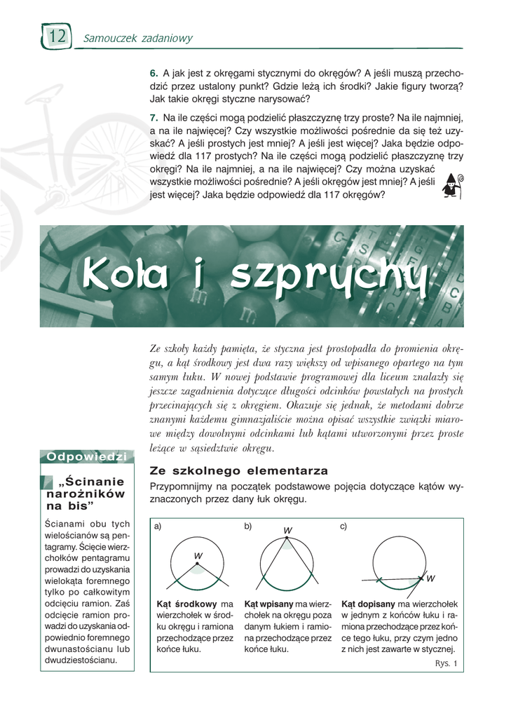 12 Samouczek zadaniowy 6. A jak jest z okrêgami stycznymi do okrêgów? A jeli musz¹ przechodziæ przez ustalony punkt? Gdzie le¿¹ ich rodki? Jakie figury tworz¹? Jak takie okrêgi styczne narysowaæ? 7. Na ile czêci mog¹ podzieliæ p³aszczyznê trzy proste? Na ile najmniej, a na ile najwiêcej? Czy wszystkie mo¿liwoci porednie da siê te¿ uzyskaæ? A jeli prostych jest mniej? A jeli jest wiêcej? Jaka bêdzie odpowied dla 117 prostych? Na ile czêci mog¹ podzieliæ p³aszczyznê trzy okrêgi? Na ile najmniej, a na ile najwiêcej? Czy mo¿na uzyskaæ wszystkie mo¿liwoci porednie? A jeli okrêgów jest mniej? A jeli jest wiêcej? Jaka bêdzie odpowied dla 117 okrêgów? Ko³a i szprychy Odpowiedzi cinanie naro¿ników na bis cianami obu tych wielocianów s¹ pentagramy. ciêcie wierzcho³ków pentagramu prowadzi do uzyskania wielok¹ta foremnego tylko po ca³kowitym odciêciu ramion. Za odciêcie ramion prowadzi do uzyskania odpowiednio foremnego dwunastocianu lub dwudziestocianu. Ze szko³y ka¿dy pamiêta, ¿e styczna jest prostopad³a do promienia okrêgu, a k¹t rodkowy jest dwa razy wiêkszy od wpisanego opartego na tym samym ³uku. W nowej podstawie programowej dla liceum znalaz³y siê jeszcze zagadnienia dotycz¹ce d³ugoci odcinków powsta³ych na prostych przecinaj¹cych siê z okrêgiem. Okazuje siê jednak, ¿e metodami dobrze znanymi ka¿demu gimnazjalicie mo¿na opisaæ wszystkie zwi¹zki miarowe miêdzy dowolnymi odcinkami lub k¹tami utworzonymi przez proste le¿¹ce w s¹siedztwie okrêgu. Ze szkolnego elementarza Przypomnijmy na pocz¹tek podstawowe pojêcia dotycz¹ce k¹tów wyznaczonych przez dany ³uk okrêgu. a) b) c) K¹t rodkowy ma wierzcho³ek w rodku okrêgu i ramiona przechodz¹ce przez koñce ³uku. K¹t wpisany ma wierzcho³ek na okrêgu poza danym ³ukiem i ramiona przechodz¹ce przez koñce ³uku. K¹t dopisany ma wierzcho³ek w jednym z koñców ³uku i ramiona przechodz¹ce przez koñce tego ³uku, przy czym jedno z nich jest zawarte w stycznej. Rys. 1 Samouczek zadaniowy 13 A teraz spróbuj sam odpowiedzeæ na kilka pytañ: 1) czy ka¿dy ³uk okrêgu wyznacza jaki k¹t a) rodkowy, b) wpisany, c) dopisany? 2) ile jest k¹tów a) rodkowych, b) wpisanych, c) dopisanych wyznaczonych przez dany ³uk? Zachodzi twierdzenie: k¹t rodkowy jest dwa razy wiêkszy od k¹ta wpisanego lub dopisanego opartego na tym samym ³uku. Sk¹d my to wiemy? Rozwa¿my najpierw szczególne po³o¿enie k¹ta rodkowego i wpisanego opartych na tym samym ³uku, gdy jedno z ramion k¹ta wpisanego przechodzi przez rodek okrêgu (jak na rys. 2a). Widaæ, ¿e k¹t a jest zewnêtrzny w trójk¹cie, w którym nieprzyleg³e do niego k¹ty wewnêtrzne wynosz¹ b (dlaczego?), zatem a = 2b. Oczywicie k¹t wpisany i rodkowy mog¹ le¿eæ tak¿e inaczej wzglêdem siebie, np. jak na rysunkach 2b lub 2c. W obu tych przypadkach poprowadzono pomocnicz¹ liniê przerywan¹, która pozwala sprowadziæ rozumowanie do przypadku z rysunku 2a. Jak? Czy s¹ to ju¿ wszystkie mo¿liwe wzajemne po³o¿enia k¹ta rodkowego i wpisanego opartych na tym samym ³uku? a) b) c) b = a Rys. 2 Pozosta³ jeszcze przypadek k¹ta dopisanego opartego na tym samym ³uku, co k¹t rodkowy (rys. 3). Zauwa¿my, ¿e b + x = 90° oraz a + 2 x = 180°. St¹d mamy, ¿e a = 2 b. b = a Rys. 3 A teraz spróbuj sam uzasadniæ poni¿sze fakty: 1) k¹ty rodkowe oparte na przystaj¹cych ³ukach s¹ przystaj¹ce, 2) k¹ty dopisane lub wpisane oparte na tym samym ³uku lub na przystaj¹cych ³ukach s¹ przystaj¹ce. Czy twierdzenia odwrotne do powy¿szych s¹ prawdziwe? Sformu³uj je i uzasadnij lub obal. W artykule wielokrotnie korzystamy z faktu, ¿e k¹t zewnêtrzny trójk¹ta jest sum¹ k¹tów wewnêtrznych do niego nieprzyleg³ych. z = 180° - g = a + b + g - g = a + b Sztafeta pokoleñ, czyli Primaaprilisowe wzory Uzupe³nij zdania tak, by by³y prawdziwe (i zaraz potem o nich zapomnij). 5. Kwadrat o boku ......... ma pole równe 4a i obwód ......... Kwadrat o boku ......... ma obwód równy a2 i pole .......... 10. Kwadrat o boku ......... ma pole równe pr2 i obwód ....... Ko³o o promieniu ........ ma pole równe a2 i obwód ...... 15. Ko³o o promieniu ...... ma pole równe 2pr i obwód ....... Ko³o o promieniu ...... ma obwód równy pr2 i pole ......... 20. Szecian o krawêdzi ........ ma objêtoæ równ¹ pr3 i pole powierzchni ......... Kula o promieniu ............ ma objêtoæ równ¹ a3 i pole powierzchni .......... Odpowiedzi szukajcie wewn¹trz numeru. 14 Samouczek zadaniowy Odpowiedzi Co tam w Opolskiem? OMOM 1. Zauwa¿, ¿e + = + Liczba ma wartoæ 4. 2. (1, 1) i (3, 2). 3. Udowodnij, ¿e $$ = 6 gdzie S pole $0 6$ DABC, SA pole DBCM. St¹d $0 = 6% + 6& S pole B $0 6$ DACM, SC pole DABM. Zapisz analogicznie pozosta³e równoci. Dodaj otrzymane wyra¿enia i skorzystaj z faktu, ¿e [ + Ì dla x > 0. [ 4. A Ç B = A. K¹ty miêdzy szprychami Zauwa¿my, ¿e w opisanym wy¿ej twierdzeniu ramiona rozwa¿anych k¹tów by³y zawsze stycznymi lub siecznymi okrêgu. Istniej¹ jeszcze inne k¹ty, których ramiona maj¹ tê w³asnoæ. Przyjmijmy, ¿e takie k¹ty s¹ wyznaczone przez 2 ³uki o roz³¹cznych wnêtrzach (jak na rys. 4). a) KKM 1. 19,5%. 2. Pole 30, obwód 30. 3. Parzysty 48, Nieparzysty 63. 4. ¼« ²³ Ö ¾ 5. [ -- ½ ¹ 6. 1984 i 2002. 7. 964. 8. cd. na stronie 16 c) d) Rys. 4 Okazuje siê, ¿e we wszystkich przypadkach mo¿na równie ³atwo wyznaczyæ miary tych k¹tów. Pomocnicze linie przerywane na rys. 5 tworz¹ trójk¹t, w którym szukany k¹t b jest zewnêtrzny (rys. 5a) lub wewnêtrzny (rys. 5bd), dziêki czemu ³atwo go obliczyæ za pomoc¹ k¹tów wpisanych opartych na ³ukach wyznaczaj¹cych szukany k¹t. a) 5. Podnie obie strony do kwadratu i sprowad nierównoæ do postaci: EF - DG Ì . b) b) c) d) Rys. 5 Mo¿emy wiêc sformu³owaæ ogólniejsze twierdzenie, które w³anie udowodnilimy: k¹t, którego ramiona s¹ zawarte w stycznych lub siecznych do okrêgu, jest: sum¹ (jeli jego wierzch