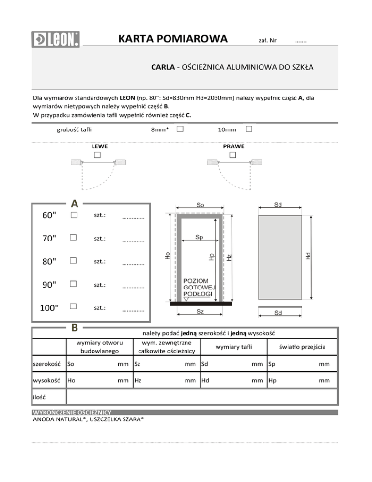 KARTA POMIAROWA zał. Nr ……. CARLA - OŚCIEŻNICA ALUMINIOWA DO SZKŁA Dla wymiarów standardowych LEON (np. 80": Sd=830mm Hd=2030mm) należy wypełnić część A, dla wymiarów nietypowych należy wypełnić część B. W przypadku zamówienia tafli wypełnić również część C. 8mm* grubość tafli 10mm LEWE PRAWE A 60" szt.: ………….. 70" szt.: ………….. 80" szt.: ………….. 90" szt.: ………….. 100" szt.: ………….. B należy podać jedną szerokość i jedną wysokość wymiary otworu budowlanego wym. zewnętrzne całkowite ościeżnicy wymiary tafli światło przejścia szerokość So mm Sz mm Sd mm Sp mm wysokość Ho mm Hz mm Hd mm Hp mm ilość WYKOŃCZENIE OŚCIEŻNICY ANODA NATURAL*, USZCZELKA SZARA* C zał. Nr ……. ZAMAWIAM TAFLĘ KOD (wg karty katalogowej): ………………………………… INFORMACJE DODATKOWE / AKCESORIA (WG KATALOGU LEON) Dla akcesoriów należy podać nazwę, kod i jeżeli występuje rodzaj i kolor oraz ilość (np. okucia DORMA Classic, chrom satyna, 2 komplety) 1. ……………………………………………………………………………………………………………………………………………………………………… 2. ……………………………………………………………………………………………………………………………………………………………………… 3. ……………………………………………………………………………………………………………………………………………………………………… 4. ……………………………………………………………………………………………………………………………………………………………………… 5. ……………………………………………………………………………………………………………………………………………………………………… ……………………………………………………………………………………………………………………………………………………………………… ……………………………………………………………………………………………………………………………………………………………………… ……………………………………………………………………………………………………………………………………………………………………… ……………………………………………………………………………………………………………………………………………………………………… ……………………………………………………………………………………………………………………………………………………………………… SATYNA (dopłata) dostępne przy zamówieniu tafli. Do drzwi pojedyńczych dla tafli satynowanych należy określić stronę satynowania zaznaczając jedną ze stron na poniższym schemacie. UWAGA 1.WYMIARY LICZONE SĄ OD POZIOMU GOTOWEJ PODŁOGI. JEŻELI PODŁOGA NIE JEST WYKOŃCZONA TO OD WYMIARU Ho NALEŻY ODJĄĆ WYSOKOŚĆ PODŁOGI, 2. OŚCIEŻNICA DO SOMODZIELNEGO ZŁOŻENIA. * WARIANT STANDARDOWY, PRZY BRAKU WYBORU PRZYJMUJE SIĘ ZAZNACZONĄ OPCJĘ ZAMAWIAJĄCY NAZWA ……………………………………………………………………………………………………………………………………………………… ……………………………………………………………………………………………………………………………………………………… ADRES ……………………………………………………………………………………………………………………………………………………… ……………………………………………………………………………………………………………………………………………………… e-mail ……………………………………………………………………………………………………………………………………………………… NIP ……………………………………………………………………………………………………………………………………………………… DATA ZŁOŻENIA ZAMÓWIENIA PIECZĘĆ – CZYTELNY PODPIS