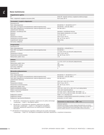 PL Dane techniczne Zagadnienia ogólne IP IP30 (IP: stopień ochrony urządzenia elektrycznego) Maks. wilgotność względna otoczenia (RH) 95 % przy 20 °C DE Termostat i czujnik wilgotności ES DK Oznaczenie CE Testy niskonapięciowe EN 60730-1* i EN 60730-2-9*** Testy EMC (wymagania kompatybilności elektromagnetycznej) EN 60730-1 i EN 301-489-3 Testy ERM (zagadnienia kompatybilności elektromagnetycznej i widma częstotliwości radiowej) EN 300 220-3 Aprobata i certyfikacja KNX Aprobata i certyfikacja Konnex Zasilanie Dwie baterie alkaliczne 1,5 V AAA Napięcie 2,2 V do 3,6 V Temperatura robocza Od 0 °C do +45 °C Temperatura przechowywania Od -10 °C do +65 °C Częstotliwość radiowa 868,3 MHz Cykl pracy nadajnika 1 % Programator FI Oznaczenie CE Testy niskonapięciowe EN 60730-1 i EN 60730-2-1 Testy EMC (wymagania kompatybilności elektromagnetycznej) EN 60730-1 Zasilanie 11 V DC ±10 % ze skrzynki połączeniowej Temperatura robocza Od 0 °C do +55 °C Temperatura przechowywania Od -20 °C do +70 °C Maksymalny pobór mocy 1W FR Antena Zasilanie 11 V DC ±10 % ze skrzynki połączeniowej Maksymalny pobór mocy 1W Częstotliwość radiowa 868,3 MHz Cykl pracy nadajnika 1 % Klasa odbiornika 2 Skrzynka połączeniowa NO NL IT Oznaczenie CE Testy niskonapięciowe EN 60730-1* i EN 60730-2-1*** Testy EMC (wymagania kompatybilności elektromagnetycznej) EN 60730-1 i EN 301-489-3 Testy ERM (zagadnienia kompatybilności elektromagnetycznej i widma częstotliwości radiowej) EN 300 220-3 Zasilanie 230 V AC +10/-15 %, 50 Hz Temperatura robocza Od 0 °C do +55 °C Temperatura przechowywania Od -20 °C do +70 °C Maksymalny pobór mocy 70 W Wyjście przekaźnika pompy 230 V AC +10/-15 %, 250 V AC 2 μA maksymalnie Wejście ogrzewanie/chłodzenie Tylko styk bezpotencjałowy Wyjścia z zaworów 24 V DC ±10 %, 436 mA maks. dla wyjść 1 i 2 24 V DC ±10 %, 218 mA maks. dla wyjść 3 do 12 Podłączenie zasilania Kabel 1 m z wtyczką euro Podłączenie pompy przewody o maksymalnej powierzchni przekroju 1,5 mm² Podłączenie ogrzewanie/chłodzenie przewody 1,5 mm² maks. *) PT **) EN 60730-1 Automatyczne regulatory elektryczne do użytku domowego i podobnego -- Część 1: Wymagania ogólne EN 60730-2-1 Automatyczne regulatory elektryczne do użytku domowego i podobnego -- Część 2-1: Wymagania szczegółowe dotyczące regulatorów elektrycznych do elektrycznych urządzeń domowych Stosowane w całej Europie 0682 Deklaracja zgodności: Niniejszym oświadczamy na naszą wyłączną odpowiedzialność, że produkty, których dotyczy niniejsza instrukcja, spełniają wszystkie zasadnicze wymagania Dyrektywy 1999/5/WE Parlamentu Europejskiego i Rady z marca 1999 r. w sprawie urządzeń radiowych i końcowych urządzeń telekomunikacyjnych. SE ***) EN 60730-2-9 Automatyczne regulatory elektryczne do użytku domowego i podobnego -- Część 2-9: Wymagania szczegółowe dotyczące regulatorów z czujnikami temperatury 52 SYSTEM UPONOR RADIO DEM · I N S T R U K C J A M O N TA Ż U I O B S Ł U G I