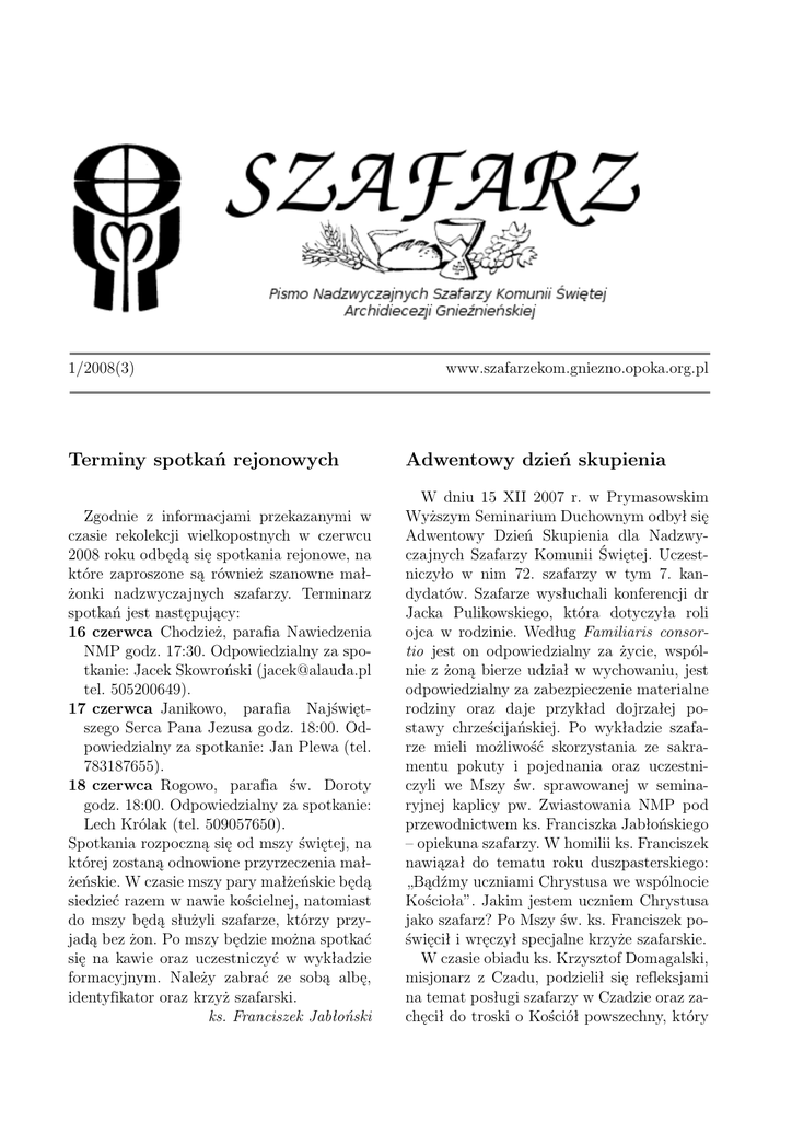 1/2008(3) www.szafarzekom.gniezno.opoka.org.pl Terminy spotkań rejonowych Adwentowy dzień skupienia Zgodnie z informacjami przekazanymi w czasie rekolekcji wielkopostnych w czerwcu 2008 roku odbędą się spotkania rejonowe, na które zaproszone są również szanowne małżonki nadzwyczajnych szafarzy. Terminarz spotkań jest następujący: 16 czerwca Chodzież, parafia Nawiedzenia NMP godz. 17:30. Odpowiedzialny za spotkanie: Jacek Skowroński ([email protected] tel. 505200649). 17 czerwca Janikowo, parafia Najświętszego Serca Pana Jezusa godz. 18:00. Odpowiedzialny za spotkanie: Jan Plewa (tel. 783187655). 18 czerwca Rogowo, parafia św. Doroty godz. 18:00. Odpowiedzialny za spotkanie: Lech Królak (tel. 509057650). Spotkania rozpoczną się od mszy świętej, na której zostaną odnowione przyrzeczenia małżeńskie. W czasie mszy pary małżeńskie będą siedzieć razem w nawie kościelnej, natomiast do mszy będą służyli szafarze, którzy przyjadą bez żon. Po mszy będzie można spotkać się na kawie oraz uczestniczyć w wykładzie formacyjnym. Należy zabrać ze sobą albę, identyfikator oraz krzyż szafarski. ks. Franciszek Jabłoński W dniu 15 XII 2007 r. w Prymasowskim Wyższym Seminarium Duchownym odbył się Adwentowy Dzień Skupienia dla Nadzwyczajnych Szafarzy Komunii Świętej. Uczestniczyło w nim 72. szafarzy w tym 7. kandydatów. Szafarze wysłuchali konferencji dr Jacka Pulikowskiego, która dotyczyła roli ojca w rodzinie. Według Familiaris consortio jest on odpowiedzialny za życie, wspólnie z żoną bierze udział w wychowaniu, jest odpowiedzialny za zabezpieczenie materialne rodziny oraz daje przykład dojrzałej postawy chrześcijańskiej. Po wykładzie szafarze mieli możliwość skorzystania ze sakramentu pokuty i pojednania oraz uczestniczyli we Mszy św. sprawowanej w seminaryjnej kaplicy pw. Zwiastowania NMP pod przewodnictwem ks. Franciszka Jabłońskiego – opiekuna szafarzy. W homilii ks. Franciszek nawiązał do tematu roku duszpasterskiego: „Bądźmy uczniami Chrystusa we wspólnocie Kościoła”. Jakim jestem uczniem Chrystusa jako szafarz? Po Mszy św. ks. Franciszek poświęcił i wręczył specjalne krzyże szafarskie. W czasie obiadu ks. Krzysztof Domagalski, misjonarz z Czadu, podzielił się refleksjami na temat posługi szafarzy w Czadzie oraz zachęcił do troski o Kościół powszechny, który 2 Rekolekcje dla nadzwyczajnych szafarzy Komunii świętej w Rościnnie jest misyjny ze swej natury. Informacje na temat posługi szafarzy w Archidiecezji Katowickiej przekazał szafarz posługujący w tej diecezji. Na zakończenie dnia skupienia szafarze spotkali się z ks. Arcybiskupem w Rezydencji Arcybiskupiej. Ks. opiekun zdał ks. Arcybiskupowi relację w jaki sposób szafarze objęci są formacją w archidiecezji: rekolekcje, dzień skupienia, spotkanie rejonowe oraz poinformował o innych inicjatywach takich jak: wydrukowanie specjalnej książeczki do posługi szafarzy, zrobienie krzyża szafarskiego, identyfikatorów, strony internetowej, okolicznościowej gazetki oraz specjalnych legitymacji. Życzenia świąteczne i jubileuszowe z okazji 50. rocznicy kapłaństwa ks. Arcybiskupa złożył w imieniu szafarzy p. Wacław Gieburowski. Ks. Arcybiskup wyraził radość ze spotkania, wskazał na to, aby wraz z duchowością eucharystyczną była także postawa eucharystyczna, na co wskazuje Sacramentum caritatis. Odpowiedział także na pytanie szafarzy, którzy zainteresowani byli stałym diakonatem. Ks. Arcybiskup w swoim przemówieniu powiedział, że osobiste spotkanie z szafarzami to coś więcej, niż tylko wiedza o nich i ich posłudze. Wspominał również swoje przeżycia związane z pierwszym podejściem do tabernakulum po święceniach diakonatu, dodając że w perspektywie wielu lat sporo się zmieniło w patrzeniu na świeckich i ich posługę przy ołtarzu. Ks. Arcybiskup podziękował szafarzom za ich świadectwo oraz za to, że starają się być jak najlepszym pomostem między kapłanami a osobami świeckimi. Na zakończenie spotkania ks. Arcybiskup podziękował szafarzom za ich gorliwą posługę w parafiach, a szczególnie za troskę o chorych do których zanoszą Komunię św. i udzielił pasterskiego błogosławieństwa. JS Rekolekcje dla nadzwyczajnych szafarzy Komunii świętej w Rościnnie Tegoroczne rekolekcje odbyły się w dniach 22-24 lutego 2008 r. w Rościnnie. Ich hasło nawiązywało do tematu programu duszpasterskiego i brzmiało Bądźmy uczniami Chrystusa. Rekolekcje rozpoczęły się kolacją, po której ks. Franciszek Jabłoński krótko omówił ich plan, podział na grupy oraz przedstawił kolejnych kandydatów na szafarzy. W tym roku zmieniły się pewne punkty programu, m.in. droga krzyżowa została przeniesiona na sobotę, a w piątkowy wieczór i noc szafarze mieli możliwość adorowania Chrystusa w Najświętszym Sakramencie. Pomocą w dobrym przeżywaniu rekolekcji była posługa p. Darii Czekalskiej, która akompaniowała i uczyła na śpiewu. Po kolacji rozpoczęło się nabożeństwo pokutne prowadzone przez ks. Franciszka. W homilii ks. opiekun wspomniał o potrzebie uczestniczenia w takich nabożeństwach aby uniknąć niebezpieczeństwa wpadania w duchowy schematyzm. Niebezpieczeństwa te wiążą się m.in. z psychiczną strukturą mężczyzny, która utrudnia przyznawanie się do winy i praktykowanie częstej spowiedzi. Po nabożeństwie nastąpiło wystawienie Najświętszego Sakramentu. W czasie adoracji szafarze mieli możliwość skorzystania z sakramentu pokuty i pojednania, którym służyli trzej kapłani. Gdy wszyscy chętni skorzystali z sakramentu spowiedzi szafarze uczestniczyli we mszy świętej celebrowanej przez ks. Franciszka Jabłońskiego. Kazanie w czasie mszy wygłosił ks. Krzysztof Domagalski. Główne myśli kazania nawiązywały do hasła tegorocznego programu duszpasterskiego i jego interpretacji. Słowa czynić uczniów wśród wszystkich narodów doty