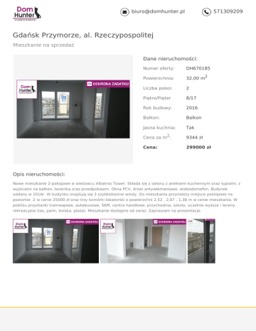 [email protected] 571309209 Gdańsk Przymorze, al. Rzeczypospolitej Mieszkanie na sprzedaż Dane nieruchomości: Numer oferty: DH670185 Powierzchnia: 32,00 m Liczba pokoi: 2 Piętro/Pięter 8/17 Rok budowy: 2016 Balkon: Balkon Jasna kuchnia: Tak 2 2 Cena za m : 9344 zł Cena: 299000 zł Opis nieruchomości: Nowe mieszkanie 2-pokojowe w wieżowcu Albatros Tower. Składa się z salonu z aneksem kuchennym oraz sypialni, z wyjściami na balkon, łazienką oraz przedpokojem. Okna PCV, drzwi antywłamaniowe, wideodomofon. Budynek oddany w 2016r. W budynku znajdują się 3 szybkobieżne windy. Do mieszkania przynależy miejsce postojowe na poziomie -2 w cenie 25000 zł oraz trzy komórki lokatorski o powierzchni 2,52 , 2,87 , 1,38 m w cenie mieszkania. W pobliżu przystanki tramwajowe, autobusowe, SKM, centra handlowe, przychodnia, szkoły, uczelnie wyższe i tereny rekreacyjne (las, parki, boiska, plaża). Mieszkanie dostępne od zaraz. Zapraszam na prezentacje. [email protected] Więcej szczegółów na temat oferty DH670185 pod adresem adres serwisu lub u agenta. 571309209