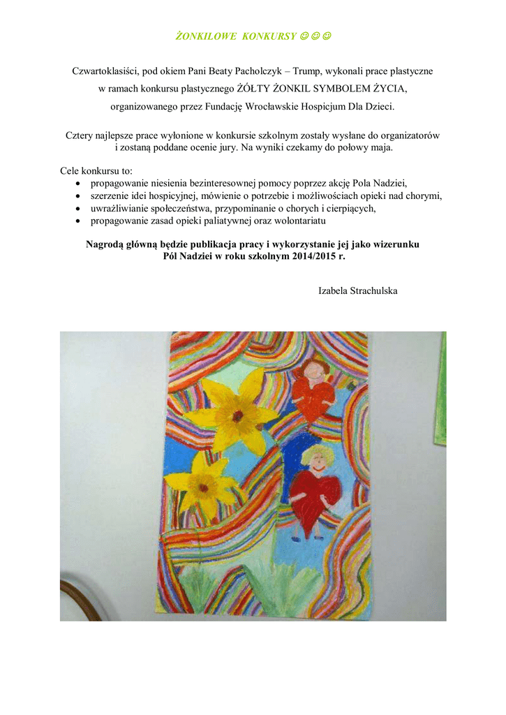 ŻONKILOWE KONKURSY Czwartoklasiści, pod okiem Pani Beaty Pacholczyk – Trump, wykonali prace plastyczne w ramach konkursu plastycznego ŻÓŁTY ŻONKIL SYMBOLEM ŻYCIA, organizowanego przez Fundację Wrocławskie Hospicjum Dla Dzieci. Cztery najlepsze prace wyłonione w konkursie szkolnym zostały wysłane do organizatorów i zostaną poddane ocenie jury. Na wyniki czekamy do połowy maja. Cele konkursu to: propagowanie niesienia bezinteresownej pomocy poprzez akcję Pola Nadziei, szerzenie idei hospicyjnej, mówienie o potrzebie i możliwościach opieki nad chorymi, uwrażliwianie społeczeństwa, przypominanie o chorych i cierpiących, propagowanie zasad opieki paliatywnej oraz wolontariatu Nagrodą główną będzie publikacja pracy i wykorzystanie jej jako wizerunku Pól Nadziei w roku szkolnym 2014/2015 r. Izabela Strachulska