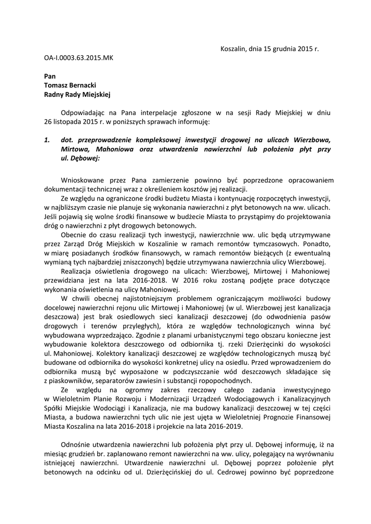Koszalin, dnia 15 grudnia 2015 r. OA-I.0003.63.2015.MK Pan Tomasz Bernacki Radny Rady Miejskiej Odpowiadając na Pana interpelacje zgłoszone w na sesji Rady Miejskiej w dniu 26 listopada 2015 r. w poniższych sprawach informuję: 1. dot. przeprowadzenie kompleksowej inwestycji drogowej na ulicach Wierzbowa, Mirtowa, Mahoniowa oraz utwardzenia nawierzchni lub położenia płyt przy ul. Dębowej: Wnioskowane przez Pana zamierzenie powinno być poprzedzone opracowaniem dokumentacji technicznej wraz z określeniem kosztów jej realizacji. Ze względu na ograniczone środki budżetu Miasta i kontynuację rozpoczętych inwestycji, w najbliższym czasie nie planuje się wykonania nawierzchni z płyt betonowych na ww. ulicach. Jeśli pojawią się wolne środki finansowe w budżecie Miasta to przystąpimy do projektowania dróg o nawierzchni z płyt drogowych betonowych. Obecnie do czasu realizacji tych inwestycji, nawierzchnie ww. ulic będą utrzymywane przez Zarząd Dróg Miejskich w Koszalinie w ramach remontów tymczasowych. Ponadto, w miarę posiadanych środków finansowych, w ramach remontów bieżących (z ewentualną wymianą tych najbardziej zniszczonych) będzie utrzymywana nawierzchnia ulicy Wierzbowej. Realizacja oświetlenia drogowego na ulicach: Wierzbowej, Mirtowej i Mahoniowej przewidziana jest na lata 2016-2018. W 2016 roku zostaną podjęte prace dotyczące wykonania oświetlenia na ulicy Mahoniowej. W chwili obecnej najistotniejszym problemem ograniczającym możliwości budowy docelowej nawierzchni rejonu ulic Mirtowej i Mahoniowej (w ul. Wierzbowej jest kanalizacja deszczowa) jest brak osiedlowych sieci kanalizacji deszczowej (do odwodnienia pasów drogowych i terenów przyległych), która ze względów technologicznych winna być wybudowana wyprzedzająco. Zgodnie z planami urbanistycznymi tego obszaru konieczne jest wybudowanie kolektora deszczowego od odbiornika tj. rzeki Dzierżęcinki do wysokości ul. Mahoniowej. Kolektory kanalizacji deszczowej ze względów technologicznych muszą być budowane od odbiornika do wysokości konkretnej ulicy na osiedlu. Przed wprowadzeniem do odbiornika muszą być wyposażone w podczyszczanie wód deszczowych składające się z piaskowników, separatorów zawiesin i substancji ropopochodnych. Ze względu na ogromny zakres rzeczowy całego zadania inwestycyjnego w Wieloletnim Planie Rozwoju i Modernizacji Urządzeń Wodociągowych i Kanalizacyjnych Spółki Miejskie Wodociągi i Kanalizacja, nie ma budowy kanalizacji deszczowej w tej części Miasta, a budowa nawierzchni tych ulic nie jest ujęta w Wieloletniej Prognozie Finansowej Miasta Koszalina na lata 2016-2018 i projekcie na lata 2016-2019. Odnośnie utwardzenia nawierzchni lub położenia płyt przy ul. Dębowej informuję, iż na miesiąc grudzień br. zaplanowano remont nawierzchni na ww. ulicy, polegający na wyrównaniu istniejącej nawierzchni. Utwardzenie nawierzchni ul. Dębowej poprzez położenie płyt betonowych na odcinku od ul. Dzierżęcińskiej do ul. Cedrowej powinno być poprzedzone opracowaniem dokumentacji technicznej, która określi rzędne wysokościowe terenu dla jego prawidłowego odwodnienia i koszt przedsięwzięcia. Miasto w najbliższym czasie nie planuje nowych inwestycji na ulicy Dębowej. Z uwagi na ograniczone możliwości finansowe budżetu Miasta oraz Miejskich Wodociągów i Kanalizacji Sp. z o.o. i dużej ilości rozpoczętych inwestycji o znaczeniu ogólnomiejskim oraz na duży zakres robót niezbędnych do wykonania, budowy sieci i nawierzchni ulic będą musiały odbywać się etapami. Natomiast zlecenie dokumentacji projektowej możliwe będzie dopiero kiedy zaistnieją finansowe możliwości ujęcia realizacji tego zadania w Wieloletniej Prognozie Finansowej Miasta Koszalina i Wieloletnim Planie Rozwoju i Modernizacji Urządzeń Wodociągowych i Kanalizacyjnych Spółki Miejskie Wodociągi i Kanalizacja 2. dot. Koszalińskiego Budżetu Obywatelskiego: Wszelkie wnioski dotyczące sposobu przeprowadzenia kolejnych edycji ww. programu są gromadzone przez Wydział Komunikacji Społecznej i Promocji, który zajmuje się prowadzeniem oraz ewaluacją Budżetu Obywatelskiego. Pana spostrzeżenia oraz propozycja zostaną starannie przeanalizowane w przypadku konstruowania nowych zasad funkcjonowania tej formy partycypacji mieszkańców. Prezydent Miasta Piotr Jedliński