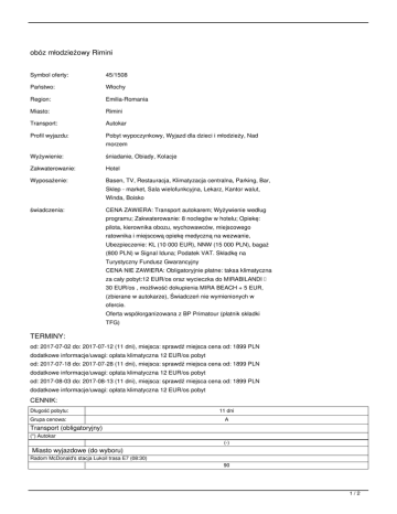 obóz młodzieżowy Rimini Symbol oferty: 45/1508 Państwo: Włochy Region: Emilia-Romania Miasto: Rimini Transport: Autokar Profil wyjazdu: Pobyt wypoczynkowy, Wyjazd dla dzieci i młodzieży, Nad Wyżywienie: śniadanie, Obiady, Kolacje Zakwaterowanie: Hotel Wyposażenie: Basen, TV, Restauracja, Klimatyzacja centralna, Parking, Bar, morzem Sklep - market, Sala wielofunkcyjna, Lekarz, Kantor walut, Winda, Boisko świadczenia: CENA ZAWIERA: Transport autokarem; Wyżywienie według programu; Zakwaterowanie: 8 noclegów w hotelu; Opiekę: pilota, kierownika obozu, wychowawców, miejscowego ratownika i miejscową opiekę medyczną na wezwanie, Ubezpieczenie: KL (10 000 EUR), NNW (15 000 PLN), bagaż (800 PLN) w Signal Iduna; Podatek VAT. Składkę na Turystyczny Fundusz Gwarancyjny CENA NIE ZAWIERA: Obligatoryjnie płatne: taksa klimatyczna za cały pobyt:12 EUR/os oraz wycieczka do MIRABILANDI 30 EUR/os , możliwość dokupienia MIRA BEACH + 5 EUR, (zbierane w autokarze), Świadczeń nie wymienionych w ofercie. Oferta współorganizowana z BP Primatour (płatnik składki TFG) TERMINY: od: 2017-07-02 do: 2017-07-12 (11 dni), miejsca: sprawdź miejsca cena od: 1899 PLN dodatkowe informacje/uwagi: opłata klimatyczna 12 EUR/os pobyt od: 2017-07-18 do: 2017-07-28 (11 dni), miejsca: sprawdź miejsca cena od: 1899 PLN dodatkowe informacje/uwagi: opłata klimatyczna 12 EUR/os pobyt od: 2017-08-03 do: 2017-08-13 (11 dni), miejsca: sprawdź miejsca cena od: 1899 PLN dodatkowe informacje/uwagi: opłata klimatyczna 12 EUR/os pobyt CENNIK: Długość pobytu: 11 dni Grupa cenowa: A Transport (obligatoryjny) (*) Autokar Miasto wyjazdowe (do wyboru) Radom McDonald's stacja Lukoil trasa E7 (08:30) (-) 90 1/2 Kraków ul. Reymonta, parking przy Hali Wisły (12:00) Kielce ul. Ściegiennego, Kolporter Arena (09:45) Warszawa Parking przy PKiN, Muzeum Techniki (06:30) Łódź Dworzec PKP Łódź Kaliska, al. Włókniarzy (06:30) Wrocław Mc Donald's/stacja BP, ul. Karkonoska (10:00) Piotrków Trybunalski Orlen, ul. Sikorskiego (07:45) Tarnów ul. Błonie, parking REAL k.PSP (10:45) (*) Rzeszów Hala Podpromie, ul. Podpromie 10 (parking) (09:00) Częstochowa Mc Donalds, al. Wojska Polskiego (12:00) Dębica Mc Donalds przy trasie nr 4 (10:00) Opole Supermarket Biedronka, ul. 1 Maja (11:30) (-) (-) 150 150 150 (-) 100 100 100 100 100 Katowice al. Górnośląska, Mc Donalds, stacja BP (w kierunku Wrocławia) (13:30) (-) Ubezpieczenie (opcjonalne) Ubezpieczenie choroby przewlekłe 90 ubezpieczenie od kosztów rezygnacji 3% Ubezp_KR_CP 7.8 % Pobyt w obiekcie 2 (do wyboru) (*) Pobyt w obiekcie 13-17.99 lat Inne (obligatoryjne) 1799 (*) składka na Turystyczny Fundusz Gwarancyjny (-) Waluta: PLN Aktualne ceny z systemu S.A.R.T. (-) - cena usługi, podatku kalkulowana przy osobie lub gratis (*) - kwota wliczona w cenę standardową 2/2