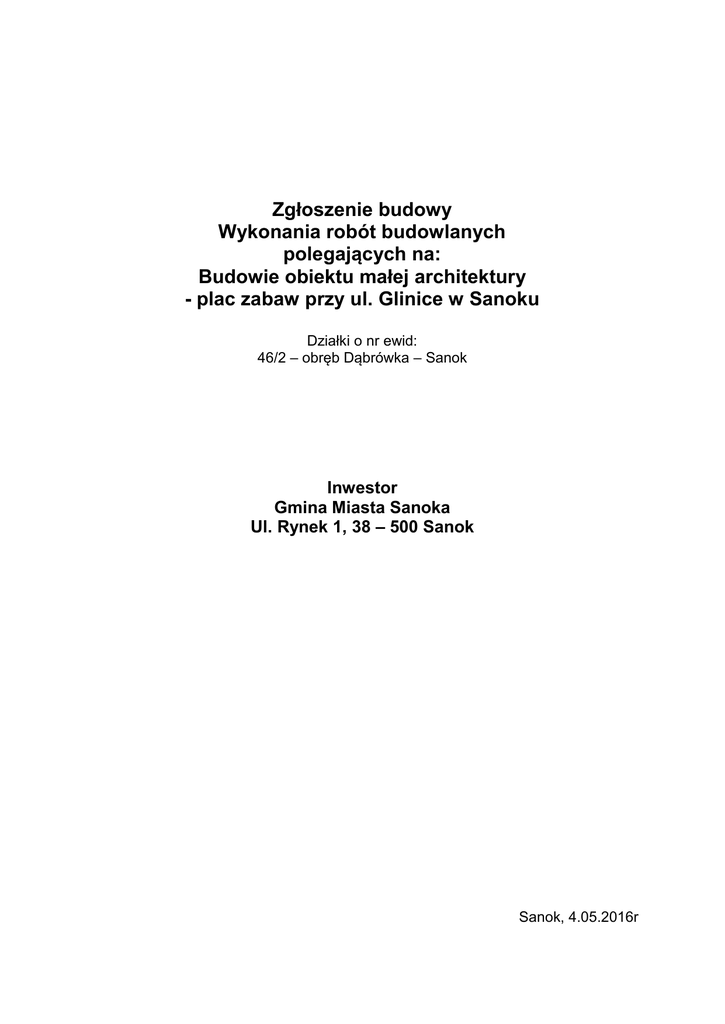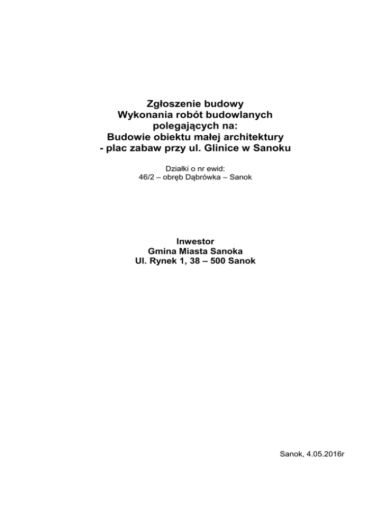 Zgłoszenie budowy Wykonania robót budowlanych polegających na: Budowie obiektu małej architektury - plac zabaw przy ul. Glinice w Sanoku Działki o nr ewid: 46/2 – obręb Dąbrówka – Sanok Inwestor Gmina Miasta Sanoka Ul. Rynek 1, 38 – 500 Sanok Sanok, 4.05.2016r Spis zawartości opracowania 1. 2. 3. 4. Strona tytułowa Spis zawartości opracowania Opis techniczny Projekt zagospodarowania placu zabaw Opis techniczny 1. Podstawa opracowana - projekt zagospodarowania - obowiązujące normy i przepisy techniczne 2. Dane ogólne Na działkach o nr ewid. 46/2 obręb Dąbrówka w Sanoku planowana jest budowa obiektów małej architektury tj. placu zabaw. 3. Parametry techniczne Zostaną zamontowane następujące urządzenia zabawkowe: 1. Huśtawka typu GNIAZDO Huśtawka wahadłowa. Siedzisko w kształcie okręgu wypełnionego siatką tworzące tzw. gniazdo. Konstrukcja stalowa, ocynkowana oraz dwukrotnie pokryta farbą proszkową. Łożyskowany mechanizm zawiesia. Posadowienie na fundamentach betonowych połączone z konstrukcją urządzenia za pomocą kotew / płyt stalowych. Widok poglądowy urządzenia zabawkowego: 2. Huśtawka podwójna Huśtawka wahadłowa. Stalowa konstrukcja, ocynkowana oraz dwukrotnie pokryta farbą proszkową. Łożyskowany mechanizm zawiesia. Łańcuchy wykonane ze stali nierdzewnej. Siedziska huśtawki wykonane z elementów gumowych, odpornych na uszkodzenia mechaniczne i wpływ warunków atmosferycznych. Jedno siedzisko dla dzieci najmłodszych tzw. koszyk/kubełek. Posadowienie na fundamentach betonowych połączone z konstrukcją urządzenia za pomocą kotew / płyt stalowych. Widok poglądowy urządzenia zabawkowego: 3. Bujak na sprężynie Bujak typu sprężynowego w kształcie siedziska z podporą pod stopy i uchwytem z przodu. Dane materiałowe: Konstrukcja ze stali nierdzewnej, siedzisko – płyta polietylenowa HDPE odporna na działanie warunków atmosferycznych. Posadowienie na fundamentach betonowych połączone z konstrukcją urządzenia za pomocą kotew / płyt stalowych. Widok poglądowy urządzenia zabawkowego: 4. Huśtawka do huśtania na stojąco Dwuosobowa huśtawka wagowa do huśtania w pozycji stojącej, posiada ramę w kształcie półokręgów. Elementy stalowe konstrukcyjnie oraz dwa antypoślizgowe podesty wykonane z płyt polietylenowych z elementami gumowymi. Widok poglądowy urządzenia zabawkowego: 5. Zestaw sprawnościowy dla dzieci najmłodszych Zestaw składający się z trzech zadaszonych wież, dwóch wyższych o równej wysokości oraz jednej niższej. Wyższe wieże połączone łukową kratownicą z liny polipropylenowej z rdzeniem stalowym, kratownica linowa zamocowana do dwóch łuków wykonanych z rury stalowej, podobnie poręcz wykonana w kształcie łuku z rury stalowej. Wieża niższa połączona z jedną z wyższych wież za pomocą trapu z płyty wodoodpornej, dodatkowo wyposażonego w poprzeczne nakładki antypoślizgowe. Zestaw wyposażony dodatkowo w dwa różnej wielkości ślizgi wykonane ze stali nierdzewnej z burtami z polietylenu, dwie małe ścianki wspinaczkowe oraz rurę strażacką. Na wieże niższą prowadzi drabinka łukowa, na wieże wyższą prowadzi drewniana drabinka ze stopniami z rur stalowych. Urządzenie zabawkowe o konstrukcji z drewna klejonego, stali nierdzewnej i płyt HDPE. Posadowienie na fundamentach betonowych połączone z konstrukcją urządzenia za pomocą kotew / płyt stalowych. Widok poglądowy urządzenia zabawkowego: 6. Sklepik Panel z daszkiem, oknem, ladą i napisem „Sklepik” Konstrukcja drewniana. Posadowienie na fundamentach betonowych połączone z konstrukcją urządzenia za pomocą kotew / płyt stalowych. Widok poglądowy urządzenia zabawkowego: 7. Zjazd linowy Zestaw umożliwiający przemieszczanie się na linie w powietrzu pomiędzy dwoma punktami oddalonymi od siebie o 21 metrów. Zestaw tworzą: rama konstrukcyjna x2, podest na wysokości 60 cm oraz karabińczyk umożliwiając zjazd po linie na koniec zestawu. Elementy konstrukcyjne stalowe, Podesty wykonane z płyt antypoślizgowych. Posadowienie na fundamentach betonowych połączone z konstrukcją urządzenia za pomocą kotew / płyt stalowych. Widok poglądowy urządzenia zabawkowego: 8. Karuzela pionowa z siedziskiem Karuzela trzyosobowa trójramienna składająca się ze słupa, do którego w górnej części zamocowano obrotowo trzy ramiona z zamocowanymi wiszącymi siedziskami w kształcie talerzy. Elementy konstrukcyjne stalowe. Posadowienie na fundamentach betonowych połączone z konstrukcją urządzenia za pomocą kotew / płyt stalowych. Widok poglądowy urządzenia zabawkowego: 9. Karuzela na sprężynach Karuzela umieszczona na trzech sprężynach, obracających się antypoślizgową platformą z uchwytem ze stali nierdzewnej w kształcie masztu. Elementy konstrukcyjne stalowe, płyta polietylenowa HDPE odporna na działanie warunków atmosferycznych – antypoślizgowa. Posadowienie na fundamentach betonowych połączone z konstrukcją urządzenia za pomocą kotew / płyt stalowych. Widok poglądowy urządzenia zabawkowego: 10. Linarium - piramida linowa Piramida o wysokości 4m, składająca się z masztu ocynkowanego ogniowo, na którym napięta jest konstrukcja linowa. Liny polipropylenowe połączone za pomocą łączników aluminiowych oraz z tworzywa sztucznego. Pomiędzy głównymi linami rozpiętych jest sześć ścian linowych. Dodatkowo w urządzeniu są płaszczyzny wewnątrz piramidy. Posadowienie na fundamentach betonowych połączone z konstrukcją urządzenia za pomocą kotew / płyt stalowych. Widok poglądowy urządzenia zabawkowego: 11. Stojak na rowery Prefabrykowany stojak na rowery umożliwiający przypięcie 5 rowerów. Konstrukcji stalowej, zabezpieczony antykorozyjnie. Stojak połączony poprzez kotwy stalowej do fundamentu stalowego. Sztuk 1. Widok poglądowy urządzenia zabawkowego: 12. Ławka Prefabrykowana ławka z oparciem drewnianym, konstrukcji stalowej, poł