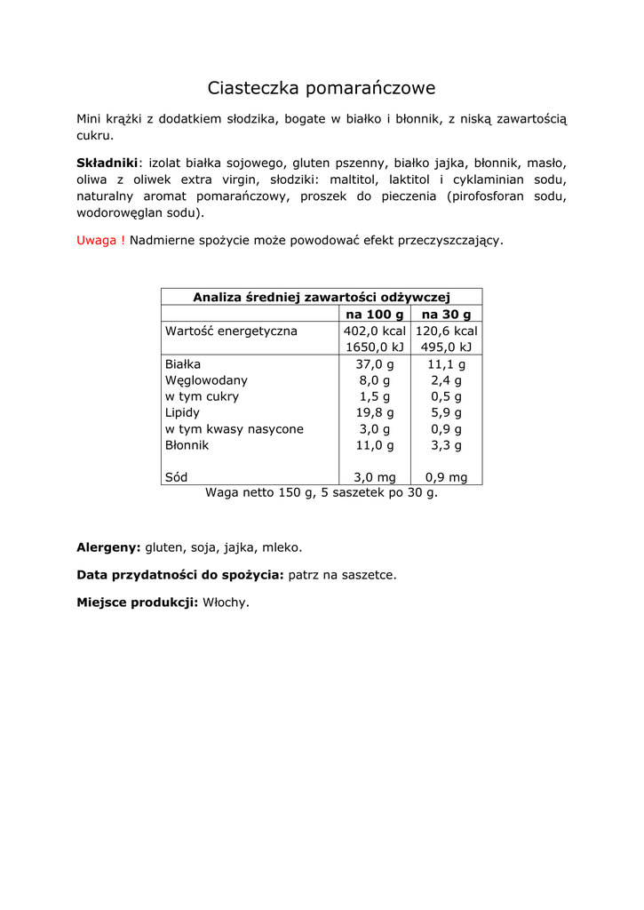 Ciasteczka pomarańczowe Mini krążki z dodatkiem słodzika, bogate w białko i błonnik, z niską zawartością cukru. Składniki: izolat białka sojowego, gluten pszenny, białko jajka, błonnik, masło, oliwa z oliwek extra virgin, słodziki: maltitol, laktitol i cyklaminian sodu, naturalny aromat pomarańczowy, proszek do pieczenia (pirofosforan sodu, wodorowęglan sodu). Uwaga ! Nadmierne spożycie może powodować efekt przeczyszczający. Analiza średniej zawartości odżywczej na 100 g na 30 g Wartość energetyczna 402,0 kcal 120,6 kcal 1650,0 kJ 495,0 kJ Białka 37,0 g 11,1 g Węglowodany 8,0 g 2,4 g w tym cukry 1,5 g 0,5 g Lipidy 19,8 g 5,9 g w tym kwasy nasycone 3,0 g 0,9 g Błonnik 11,0 g 3,3 g Sód 3,0 mg 0,9 mg Waga netto 150 g, 5 saszetek po 30 g. Alergeny: gluten, soja, jajka, mleko. Data przydatności do spożycia: patrz na saszetce. Miejsce produkcji: Włochy.