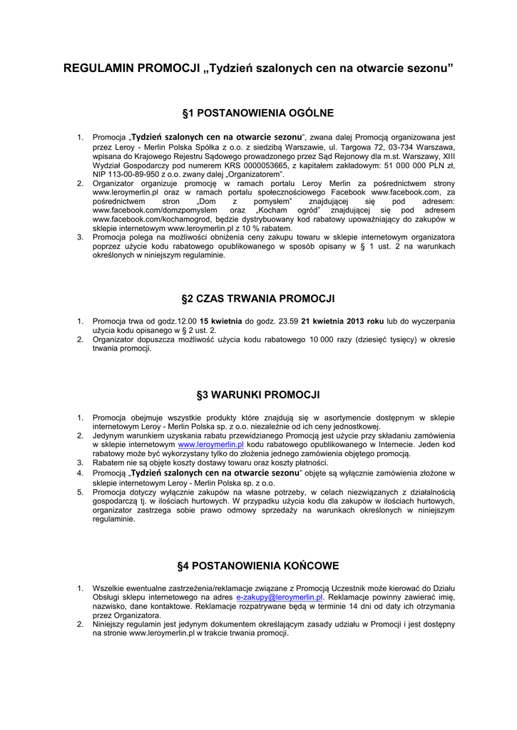 REGULAMIN PROMOCJI „Tydzień szalonych cen na otwarcie sezonu” §1 POSTANOWIENIA OGÓLNE 1. 2. 3. Promocja „Tydzień szalonych cen na otwarcie sezonu”, zwana dalej Promocją organizowana jest przez Leroy - Merlin Polska Spółka z o.o. z siedzibą Warszawie, ul. Targowa 72, 03-734 Warszawa, wpisana do Krajowego Rejestru Sądowego prowadzonego przez Sąd Rejonowy dla m.st. Warszawy, XIII Wydział Gospodarczy pod numerem KRS 0000053665, z kapitałem zakładowym: 51 000 000 PLN zł, NIP 113-00-89-950 z o.o. zwany dalej „Organizatorem”. Organizator organizuje promocję w ramach portalu Leroy Merlin za pośrednictwem strony www.leroymerlin.pl oraz w ramach portalu społecznościowego Facebook www.facebook.com, za pośrednictwem stron „Dom z pomysłem” znajdującej się pod adresem: www.facebook.com/domzpomyslem oraz „Kocham ogród” znajdującej się pod adresem www.facebook.com/kochamogrod, będzie dystrybuowany kod rabatowy upoważniający do zakupów w sklepie internetowym www.leroymerlin.pl z 10 % rabatem. Promocja polega na możliwości obniżenia ceny zakupu towaru w sklepie internetowym organizatora poprzez użycie kodu rabatowego opublikowanego w sposób opisany w § 1 ust. 2 na warunkach określonych w niniejszym regulaminie. §2 CZAS TRWANIA PROMOCJI 1. 2. Promocja trwa od godz.12.00 15 kwietnia do godz. 23.59 21 kwietnia 2013 roku lub do wyczerpania użycia kodu opisanego w § 2 ust. 2. Organizator dopuszcza możliwość użycia kodu rabatowego 10 000 razy (dziesięć tysięcy) w okresie trwania promocji. §3 WARUNKI PROMOCJI 1. 2. 3. 4. 5. Promocja obejmuje wszystkie produkty które znajdują się w asortymencie dostępnym w sklepie internetowym Leroy - Merlin Polska sp. z o.o. niezależnie od ich ceny jednostkowej. Jedynym warunkiem uzyskania rabatu przewidzianego Promocją jest użycie przy składaniu zamówienia w sklepie internetowym www.leroymerlin.pl kodu rabatowego opublikowanego w Internecie. Jeden kod rabatowy może być wykorzystany tylko do złożenia jednego zamówienia objętego promocją. Rabatem nie są objęte koszty dostawy towaru oraz koszty płatności. Promocją „Tydzień szalonych cen na otwarcie sezonu” objęte są wyłącznie zamówienia złożone w sklepie internetowym Leroy - Merlin Polska sp. z o.o. Promocja dotyczy wyłącznie zakupów na własne potrzeby, w celach niezwiązanych z działalnością gospodarczą tj. w ilościach hurtowych. W przypadku użycia kodu dla zakupów w ilościach hurtowych, organizator zastrzega sobie prawo odmowy sprzedaży na warunkach określonych w niniejszym regulaminie. §4 POSTANOWIENIA KOŃCOWE 1. 2. Wszelkie ewentualne zastrzeżenia/reklamacje związane z Promocją Uczestnik może kierować do Działu Obsługi sklepu internetowego na adres [email protected]. Reklamacje powinny zawierać imię, nazwisko, dane kontaktowe. Reklamacje rozpatrywane będą w terminie 14 dni od daty ich otrzymania przez Organizatora. Niniejszy regulamin jest jedynym dokumentem określającym zasady udziału w Promocji i jest dostępny na stronie www.leroymerlin.pl w trakcie trwania promocji.